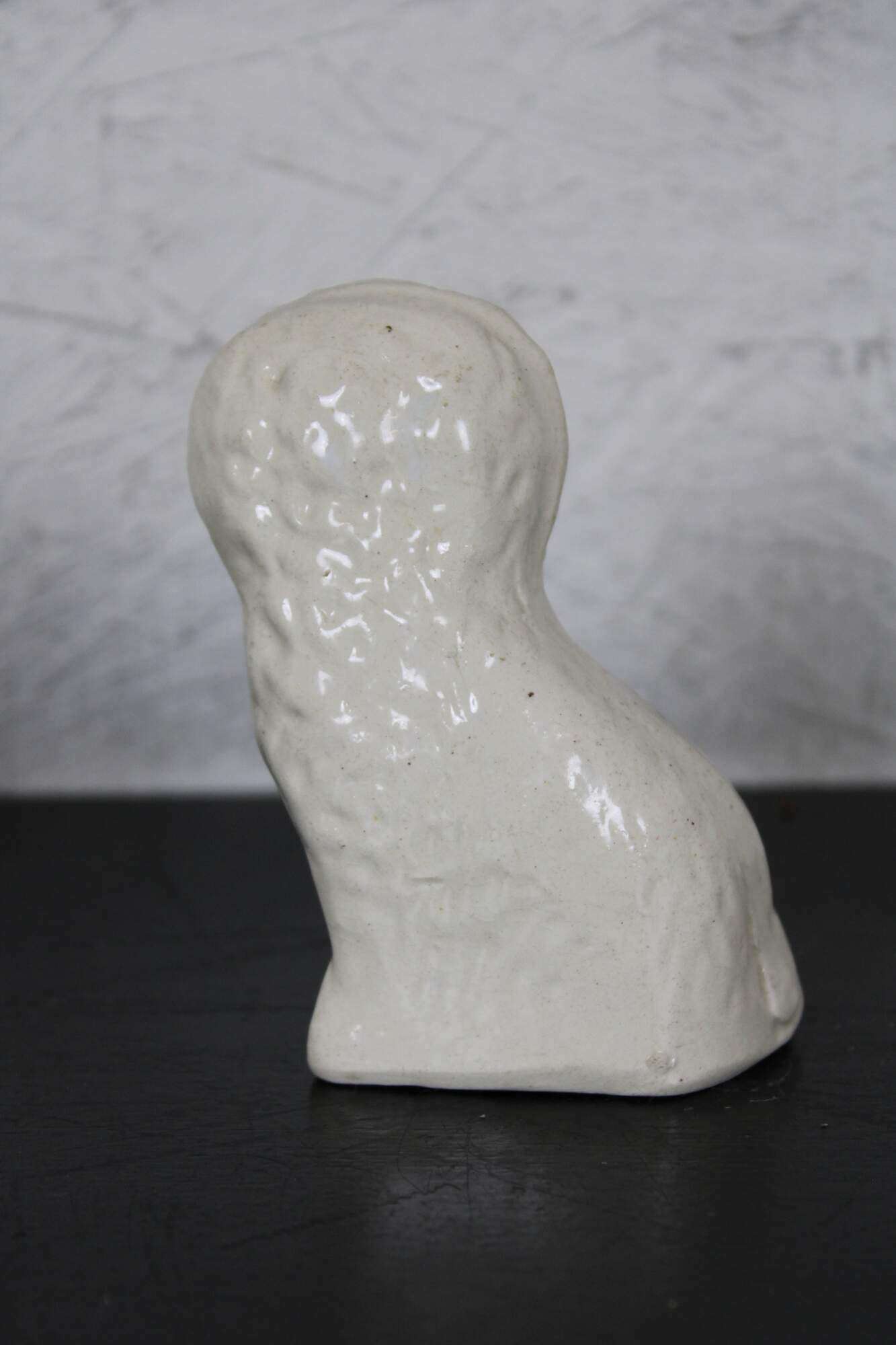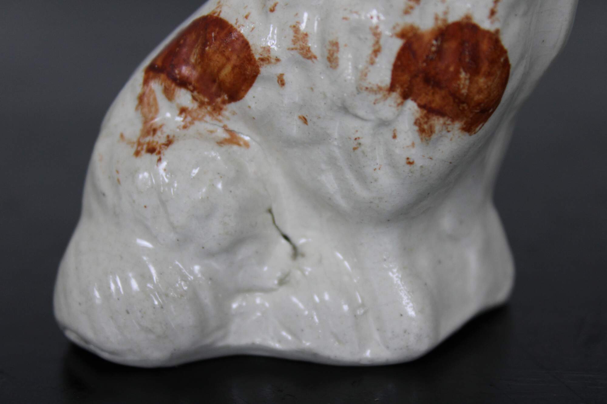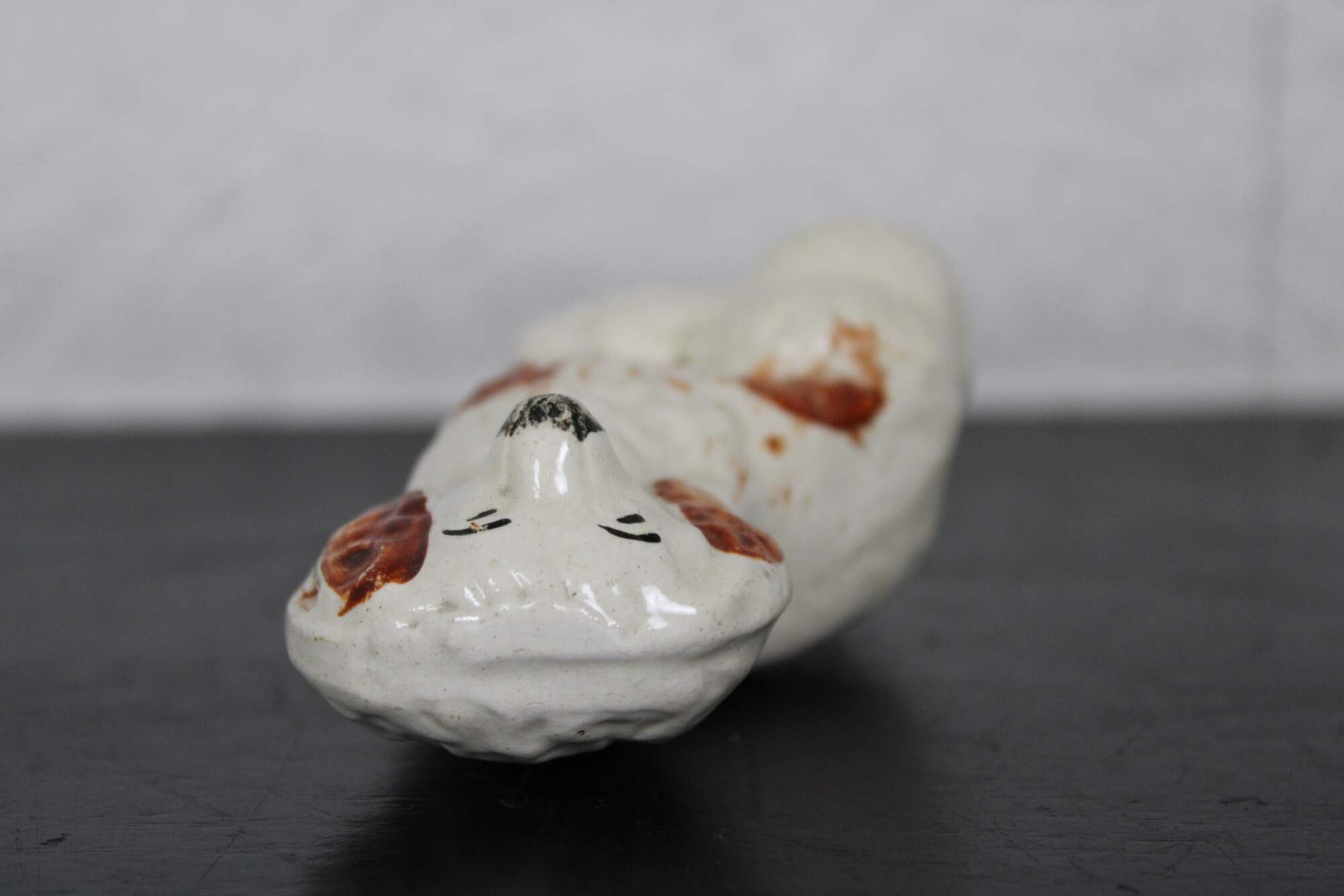Antique miniature Staffordshire porcelain figurine in the shape of a red and white King Charles spaniel with gold collar.