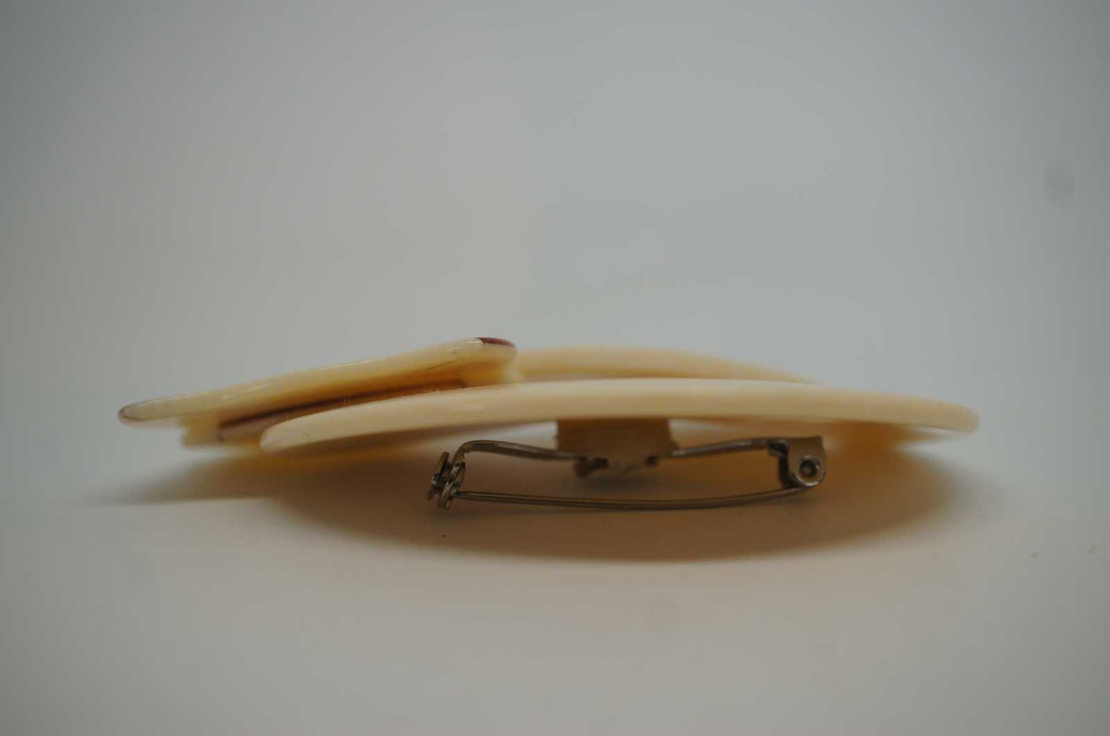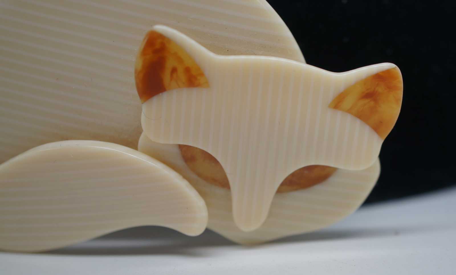 Vintage bakelite Lea Stein Gomina striped ivory/cream pin in the shape of a sleeping cat with orange and yellow mottled ears and eyes.