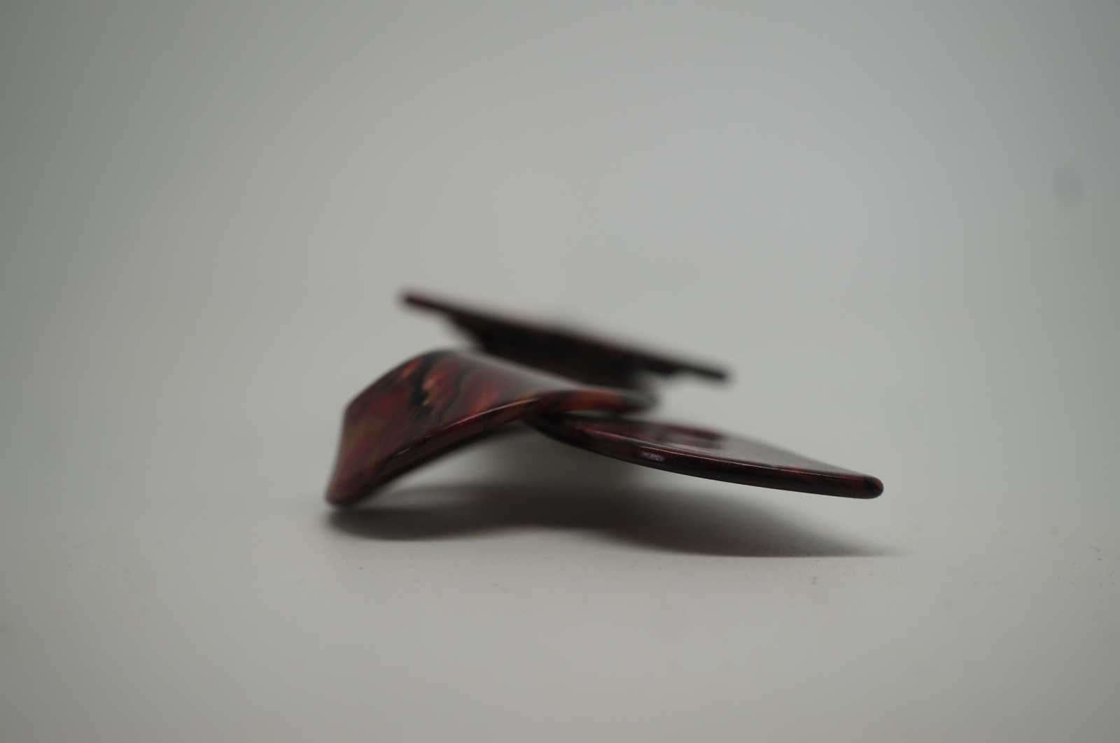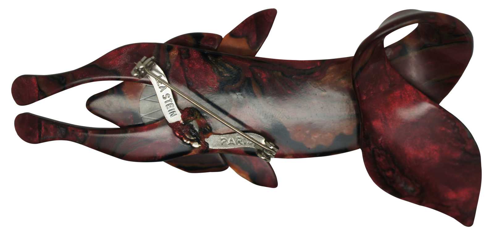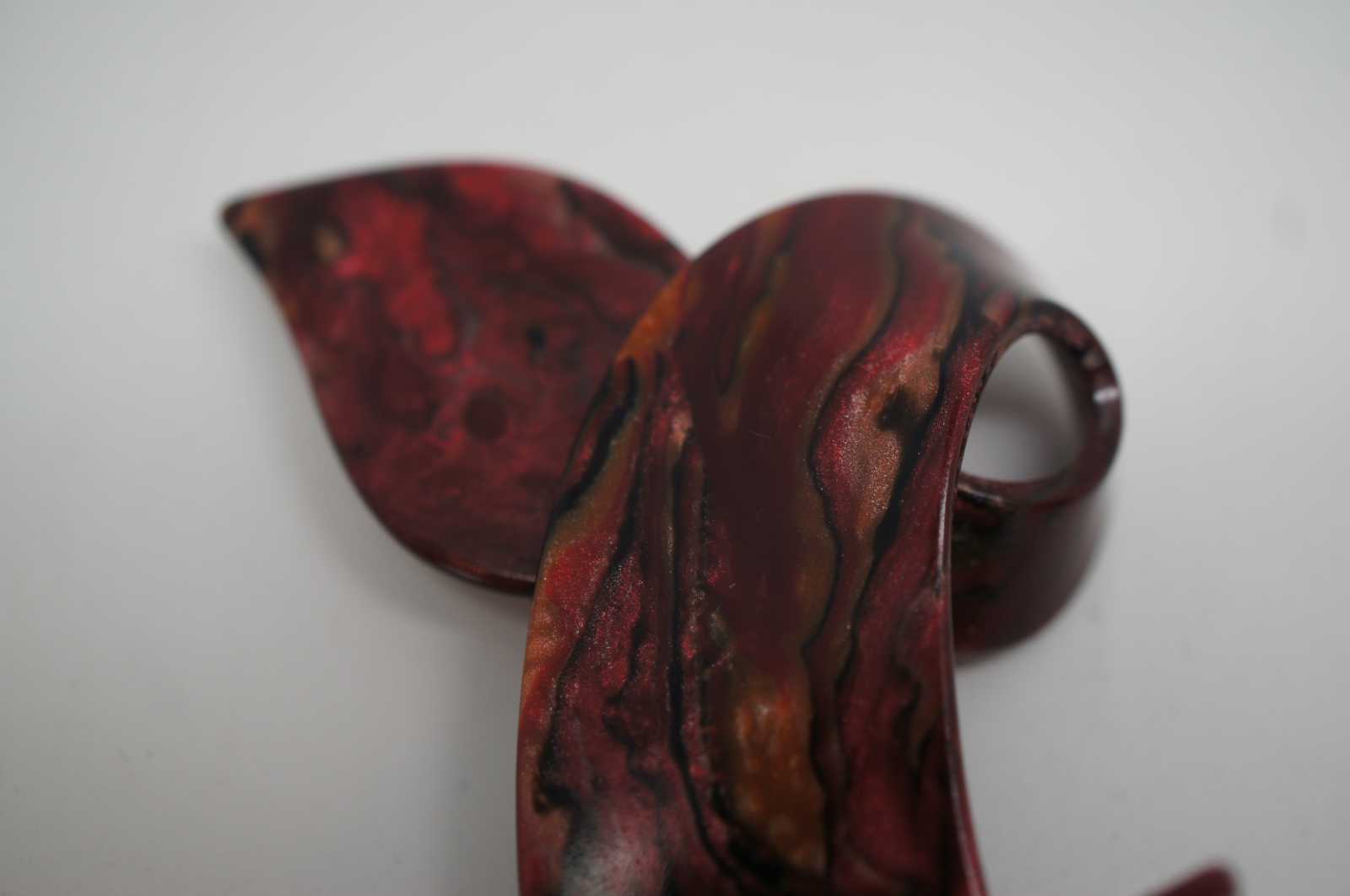 Vintage Lea Stein famous Renaud fox pin in swirling red, gold and black bakelite.