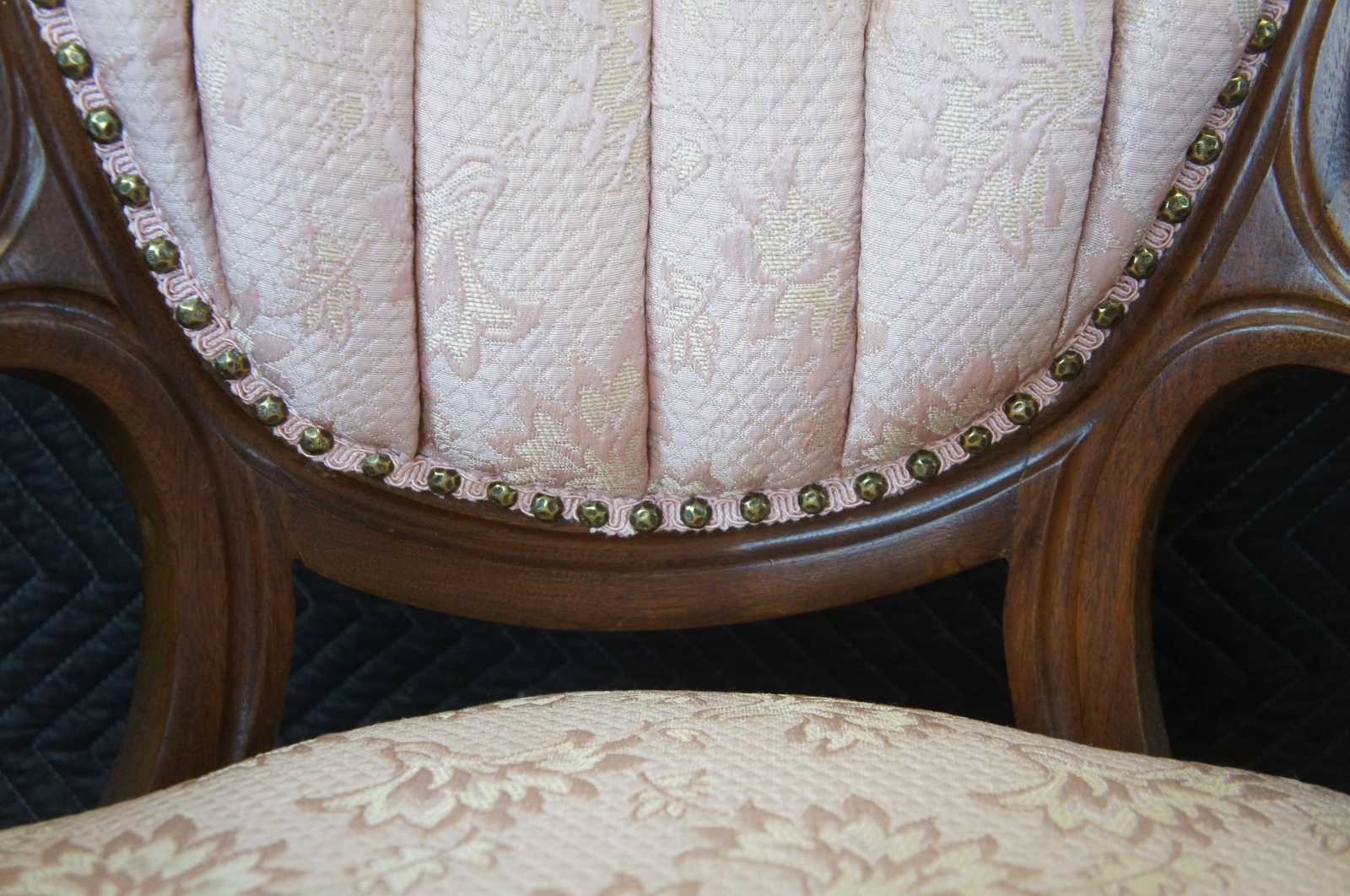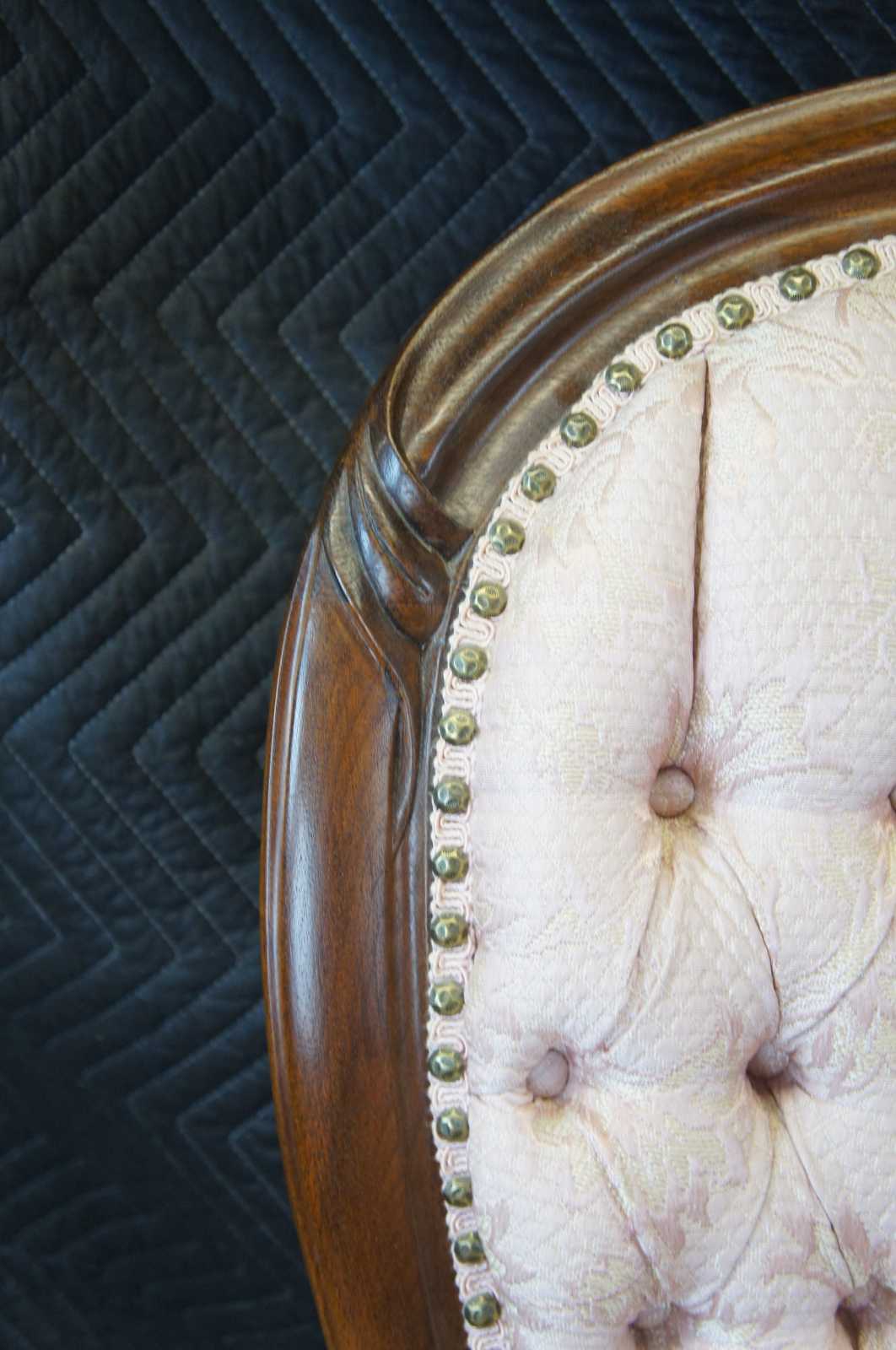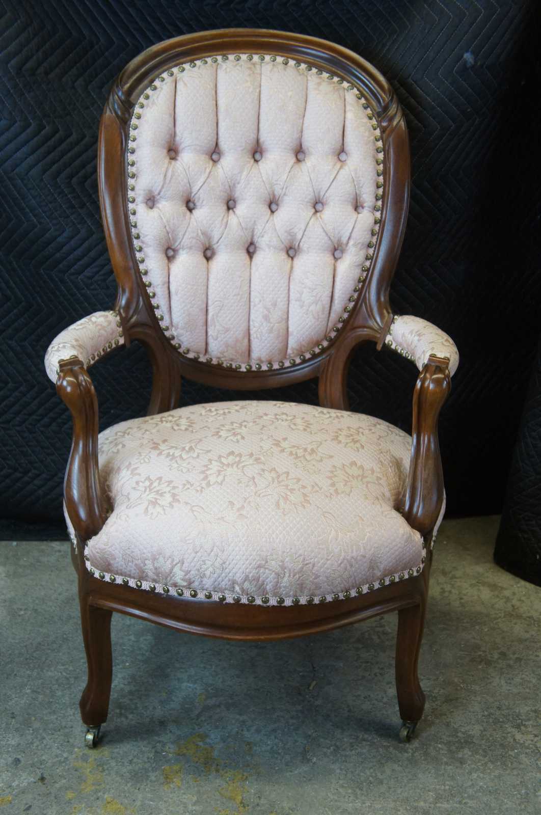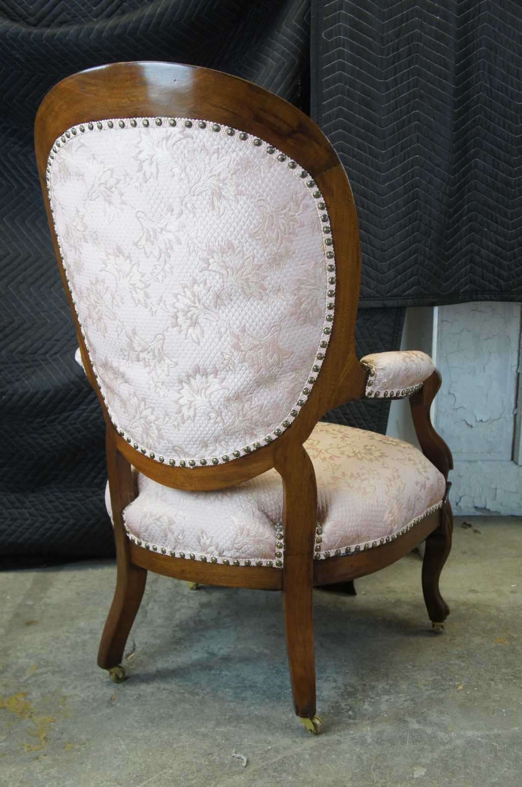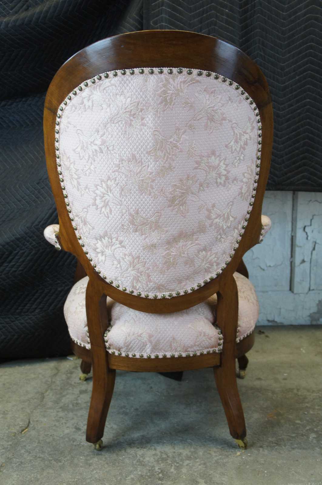 Pair of two antique Victorian his and hers parlor arm chairs. Made of walnut featuring serpentine form with blush pink floral upholstery, tufted balloon backs, padded arms, nailhead trim, and brass swivel castors.