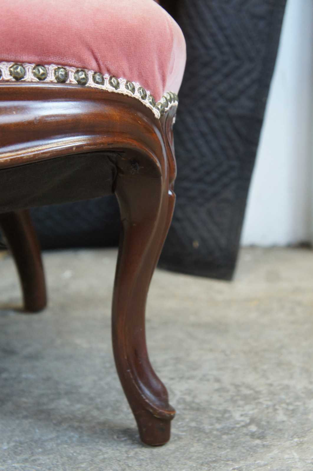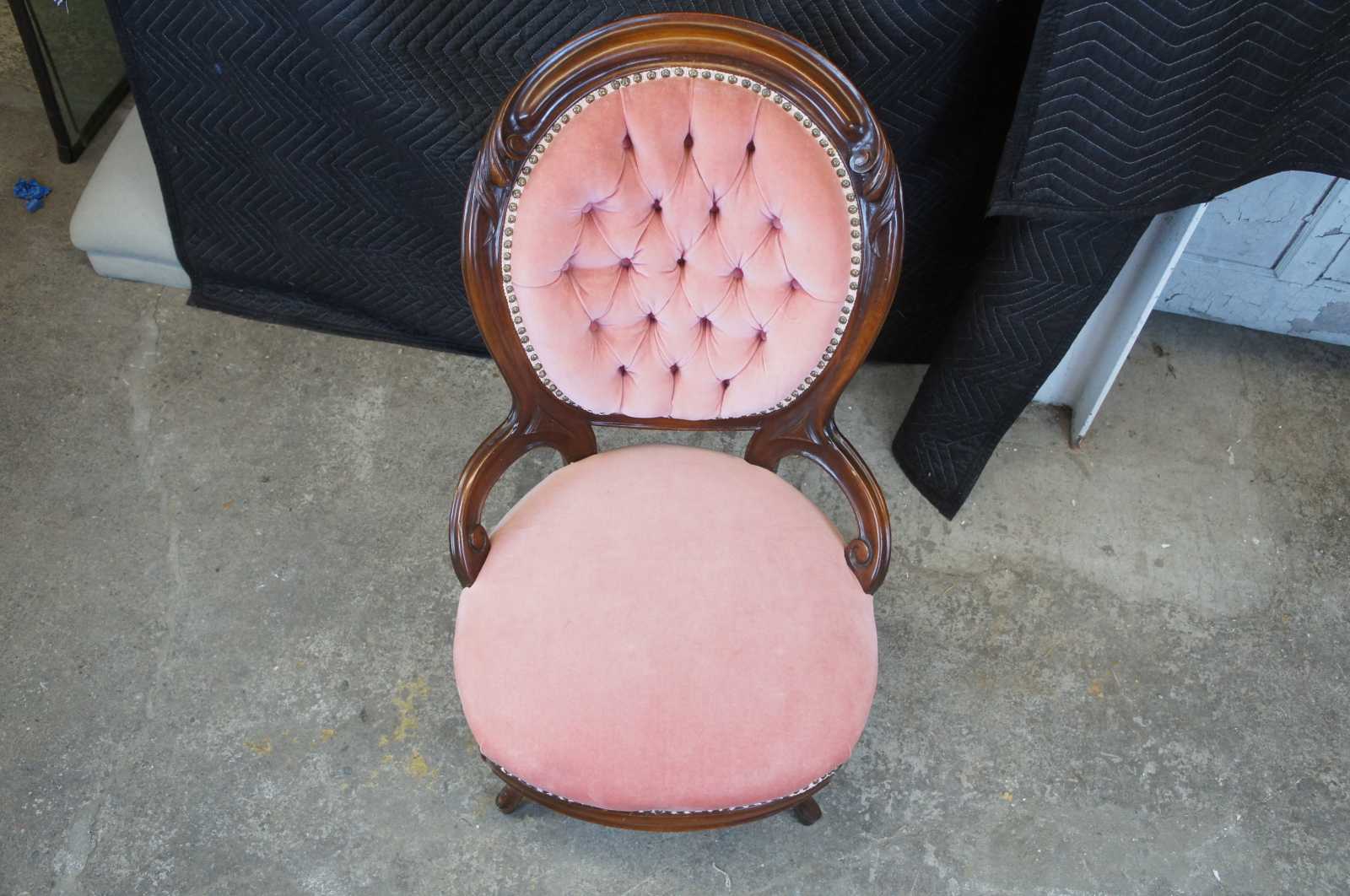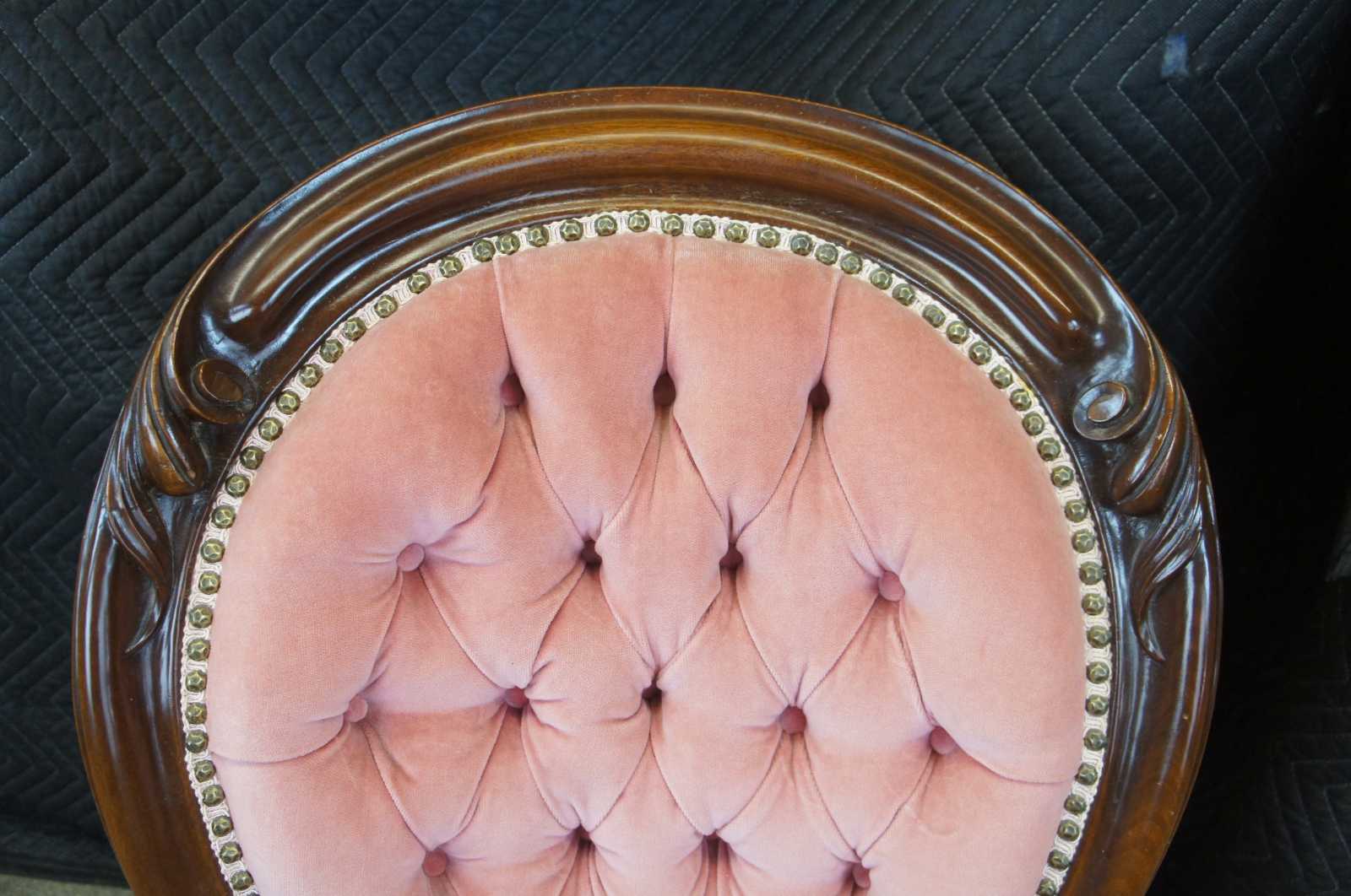 Antique Victorian side accent vanity or parlor chair. Made of walnut featuring serpentine form with pink velvet upholstery, tufted balloon back, and nailhead trim.