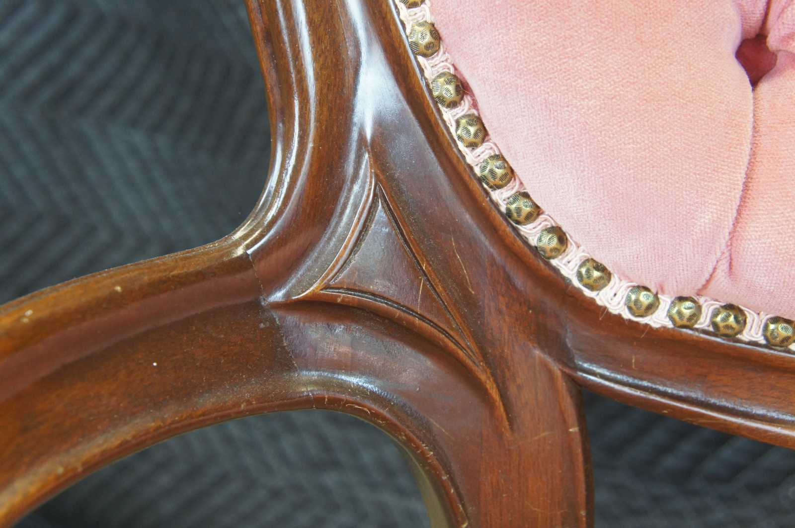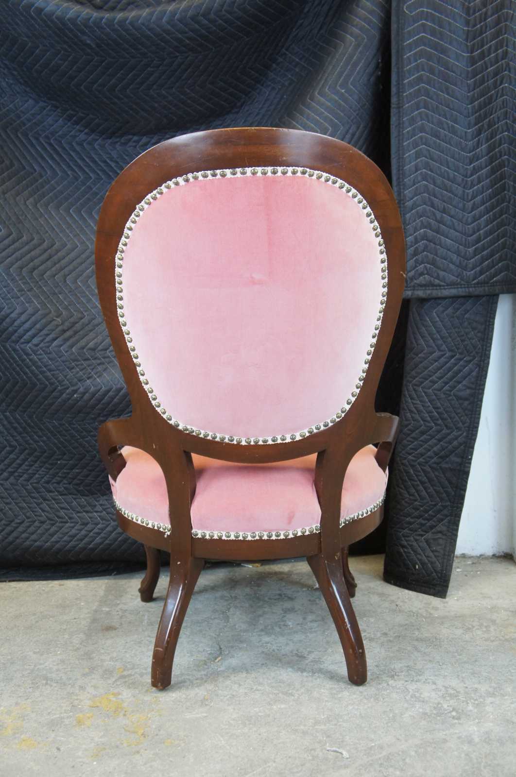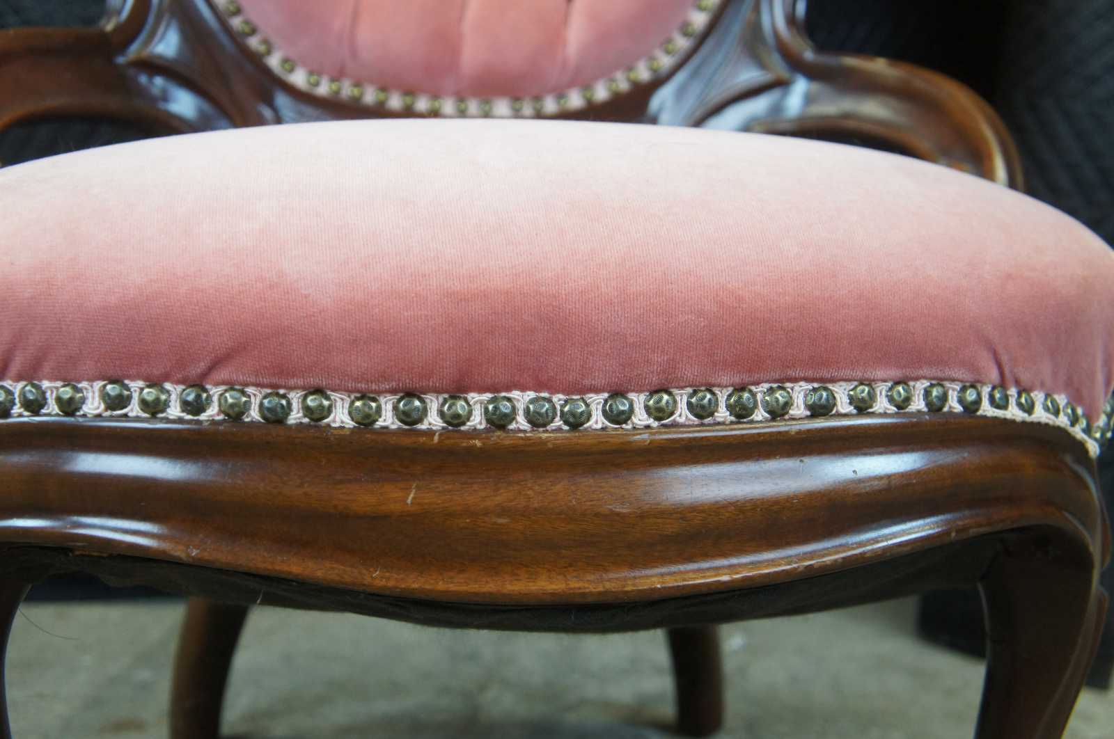 Antique Victorian side accent vanity or parlor chair. Made of walnut featuring serpentine form with pink velvet upholstery, tufted balloon back, and nailhead trim.