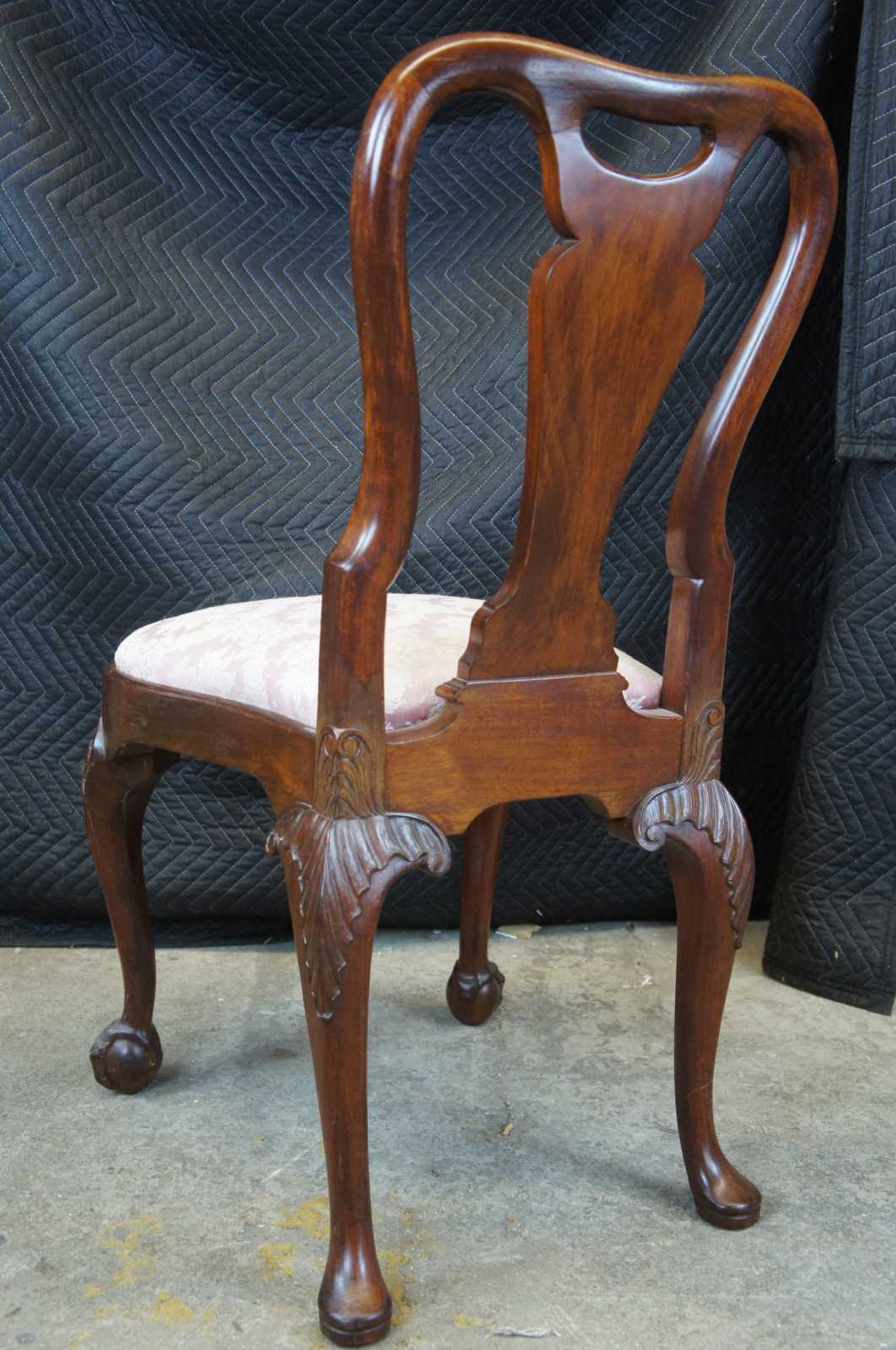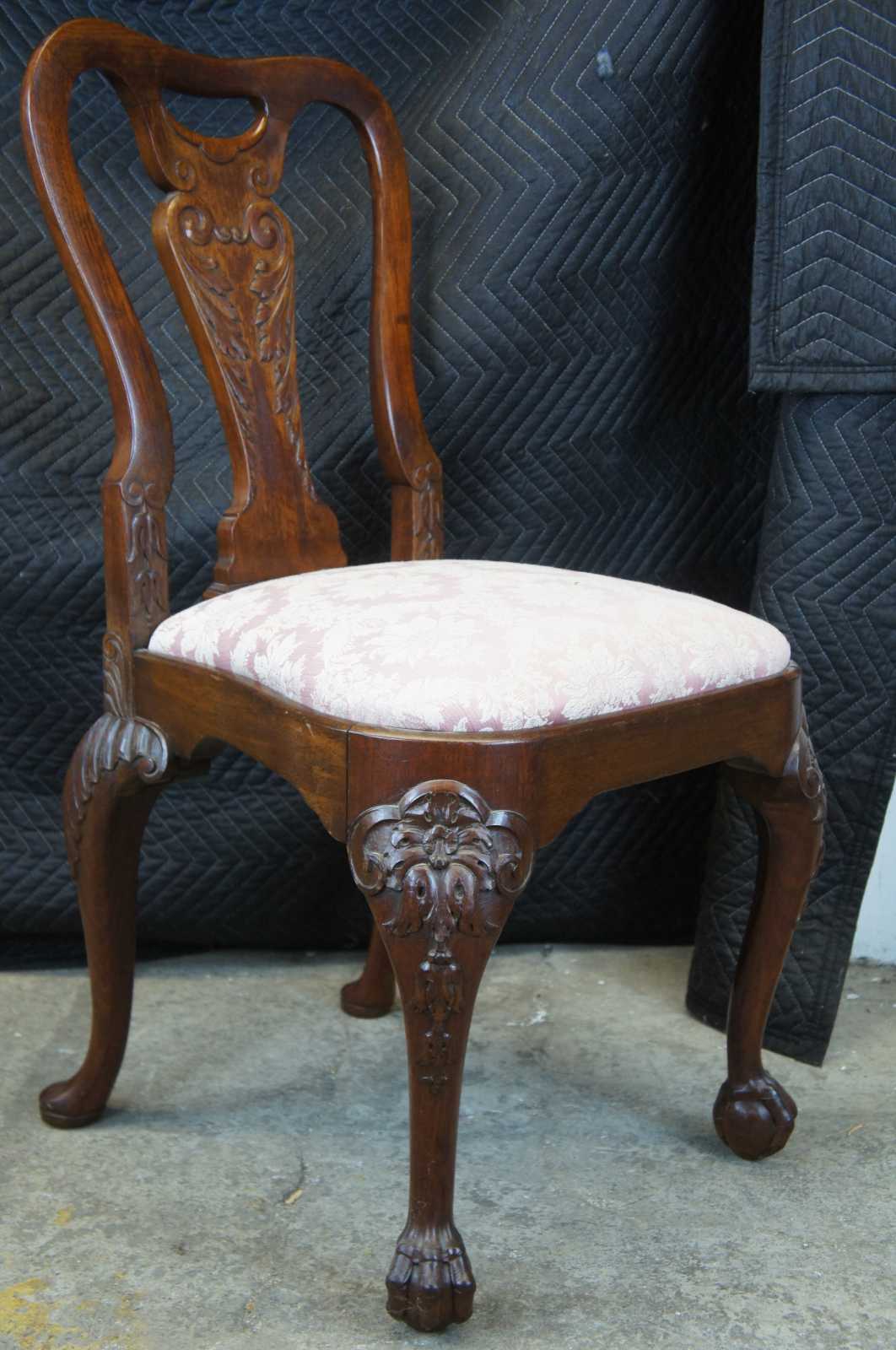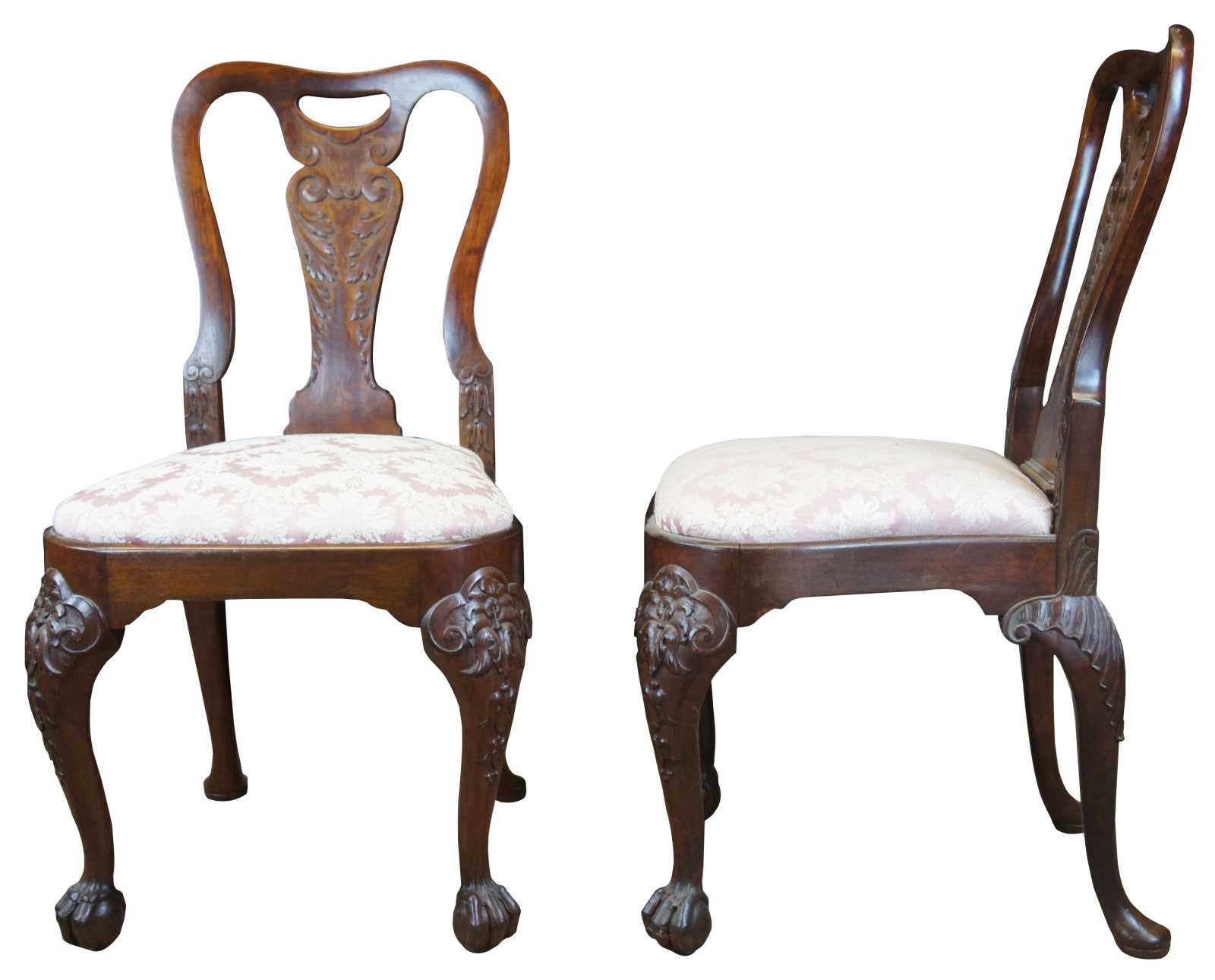 Antique Georgian style side chairs. Made of mahogany featuring serpentine form with acanthus carved back over a pink floral brocade seat. The chair is supported by meticulously carved cabriole legs terminating into ball & claw feet.