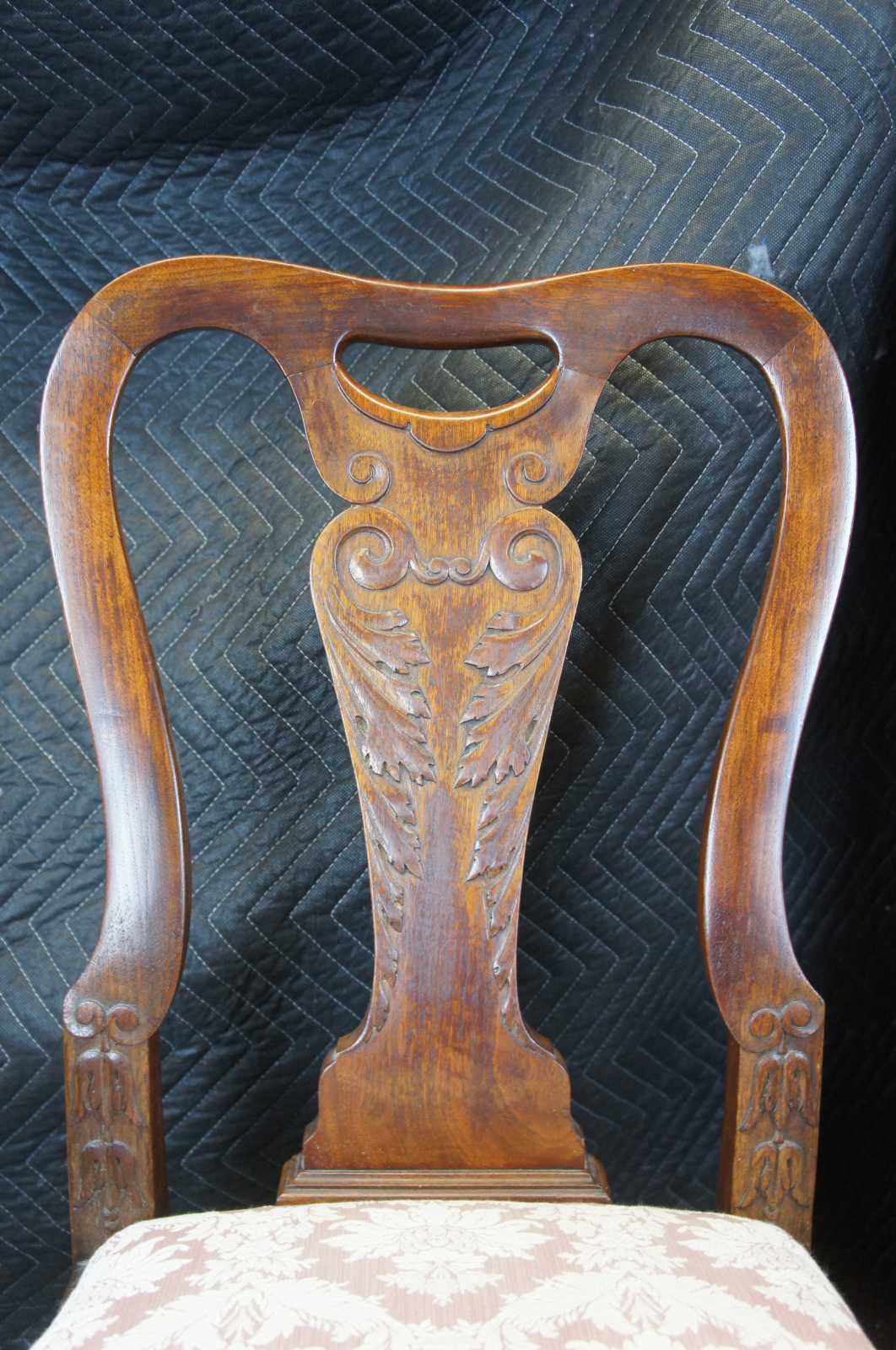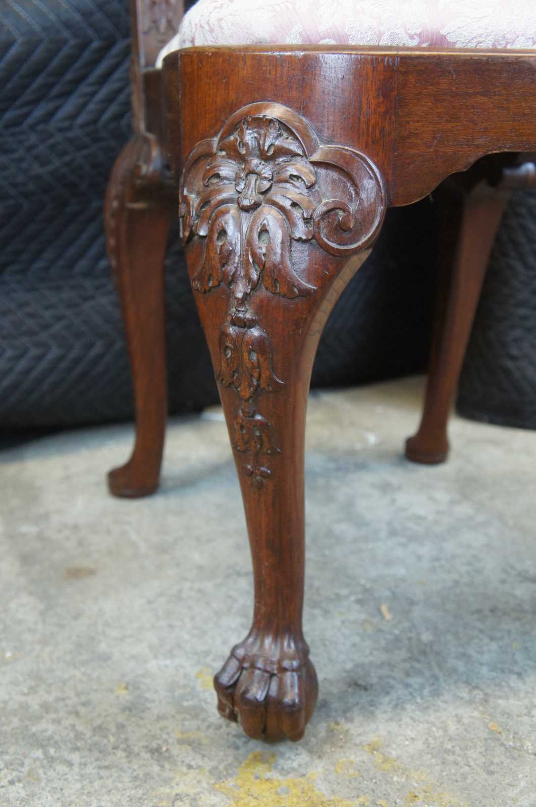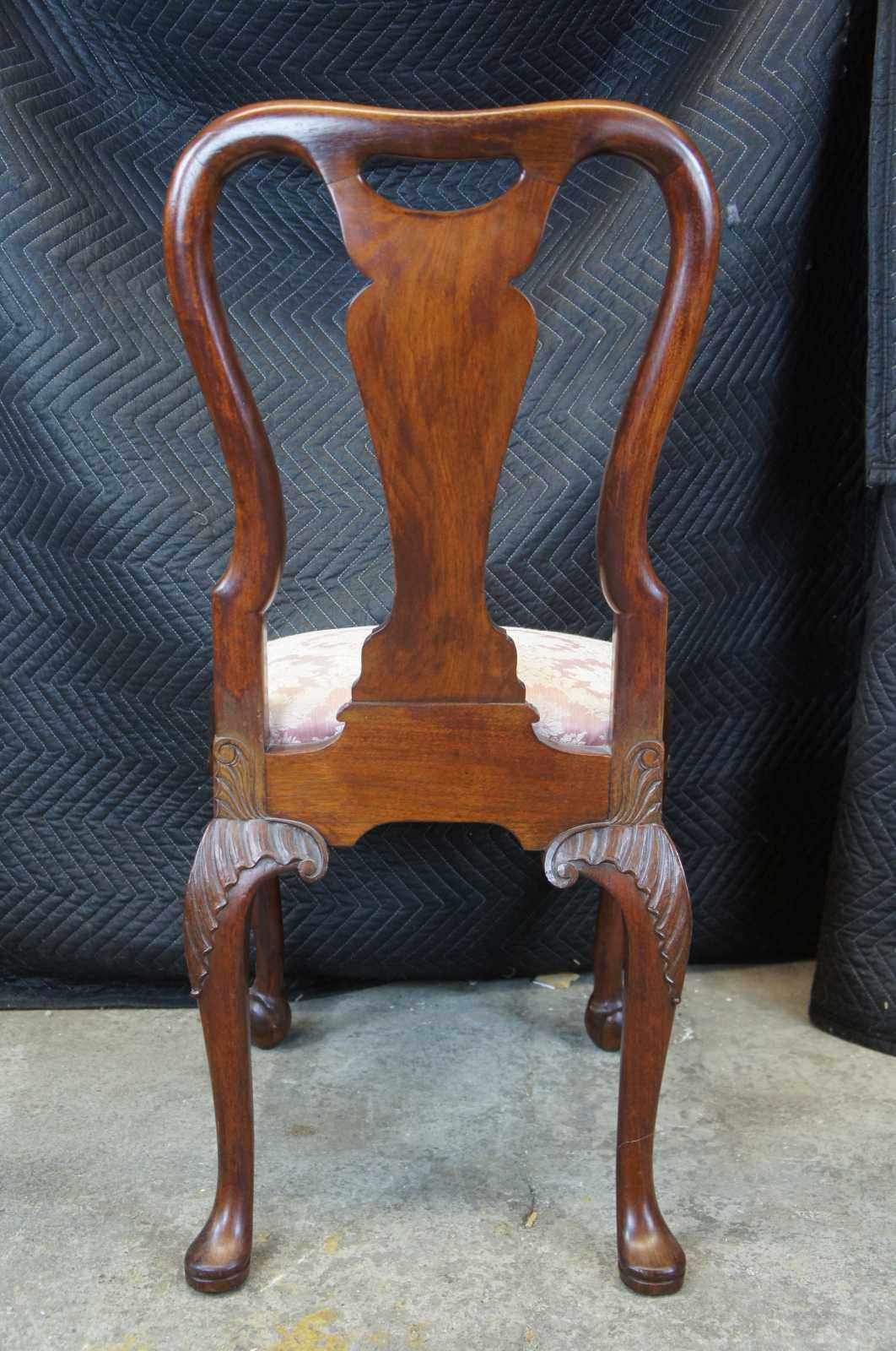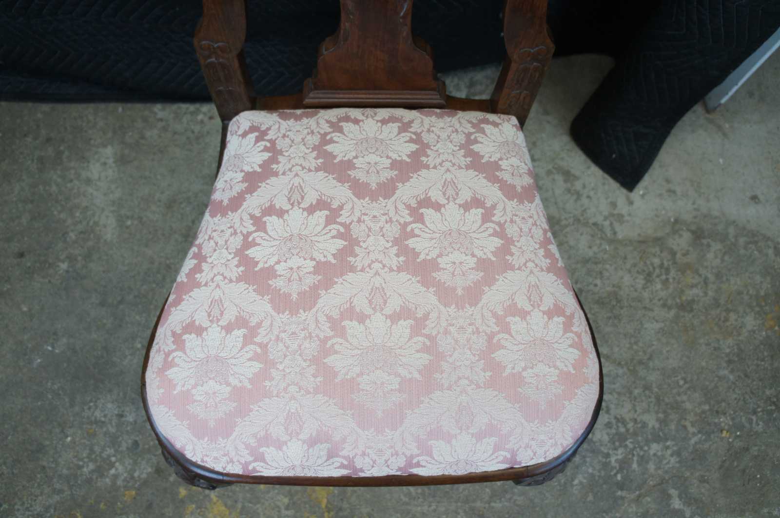 Antique Georgian style side chairs. Made of mahogany featuring serpentine form with acanthus carved back over a pink floral brocade seat. The chair is supported by meticulously carved cabriole legs terminating into ball & claw feet.