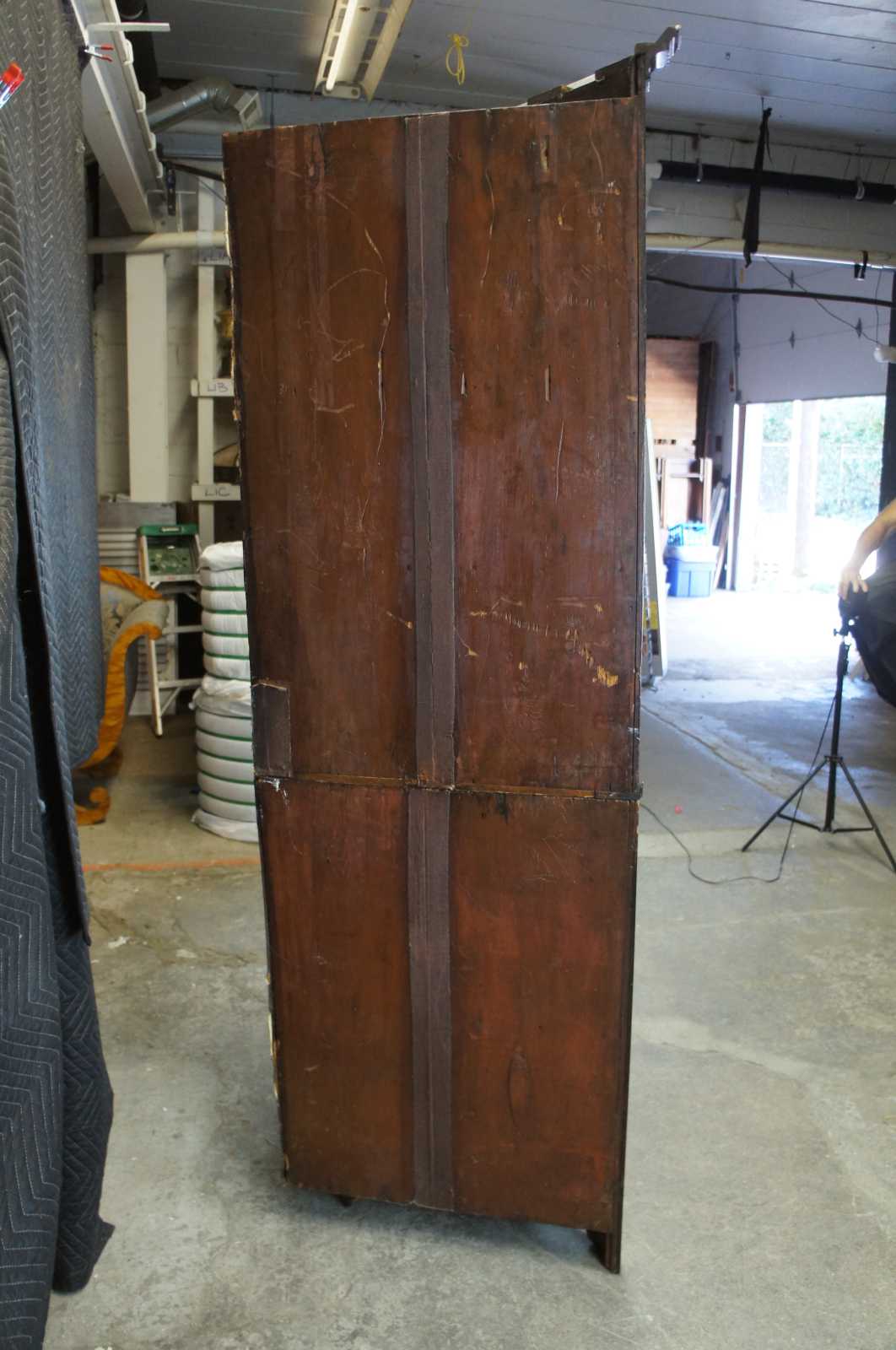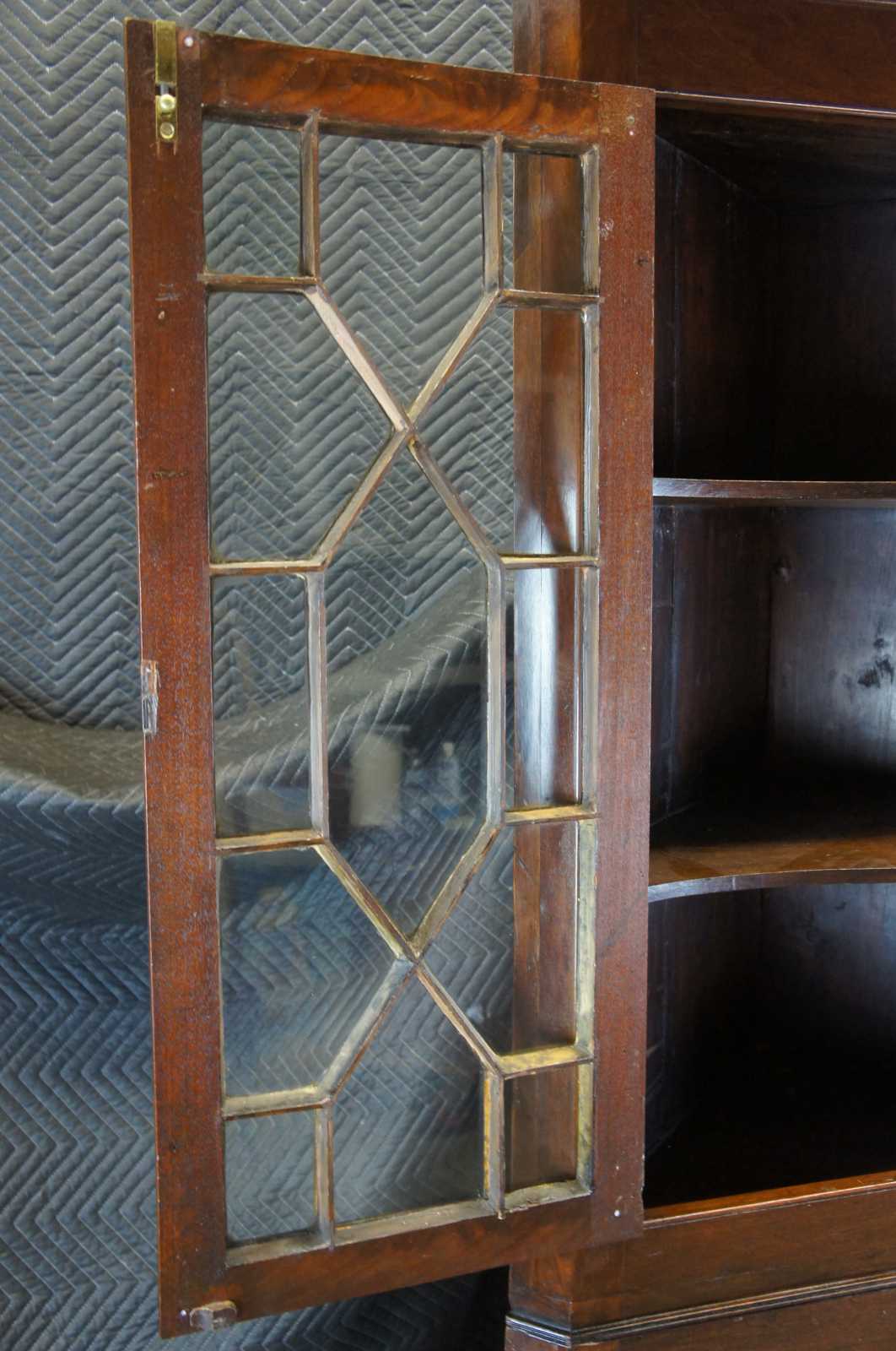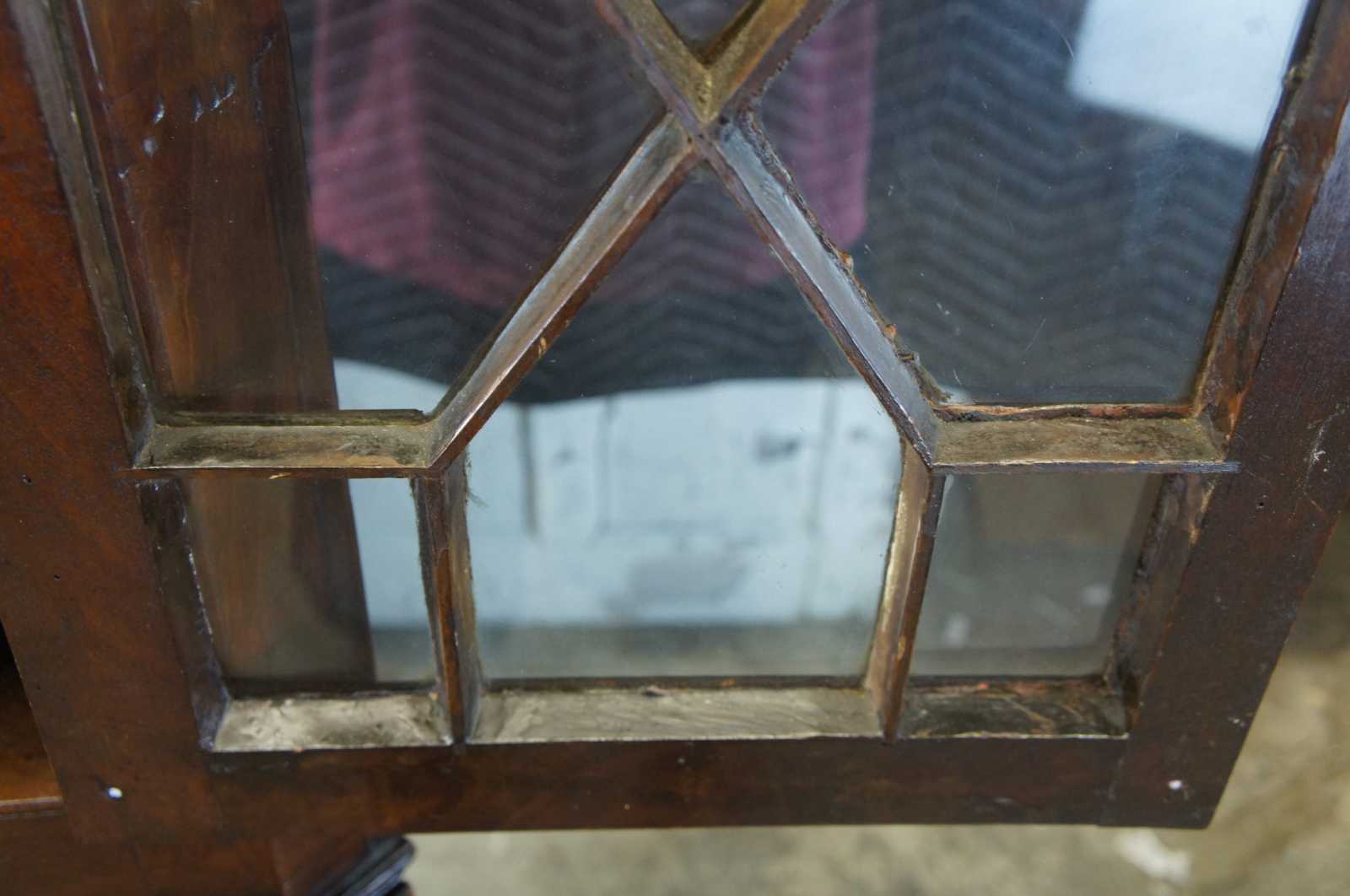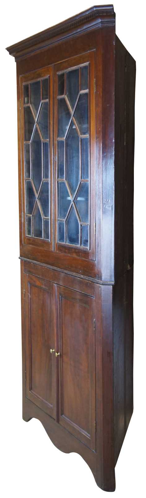 Antique English George III corner cabinet or cupboard. Made of mahogany featuring upper dentil moulding, glazed doors with geometric astragals, that opens to three shelves atop lower cabinet with serpentine skirted base.
