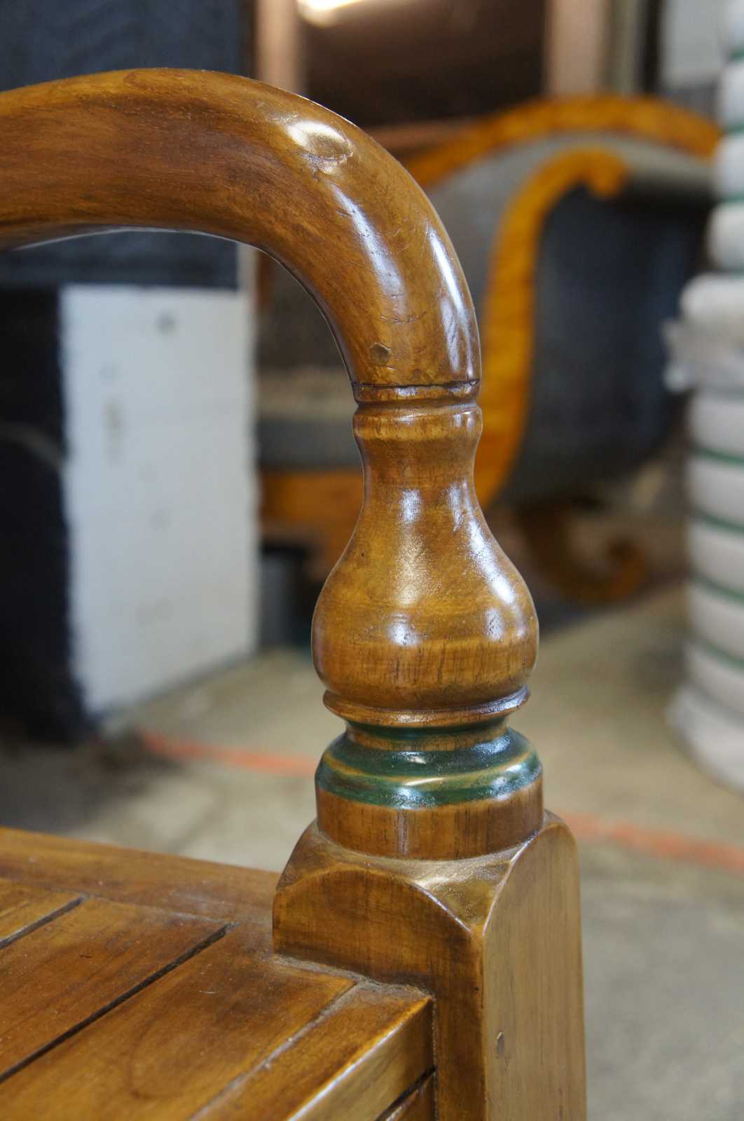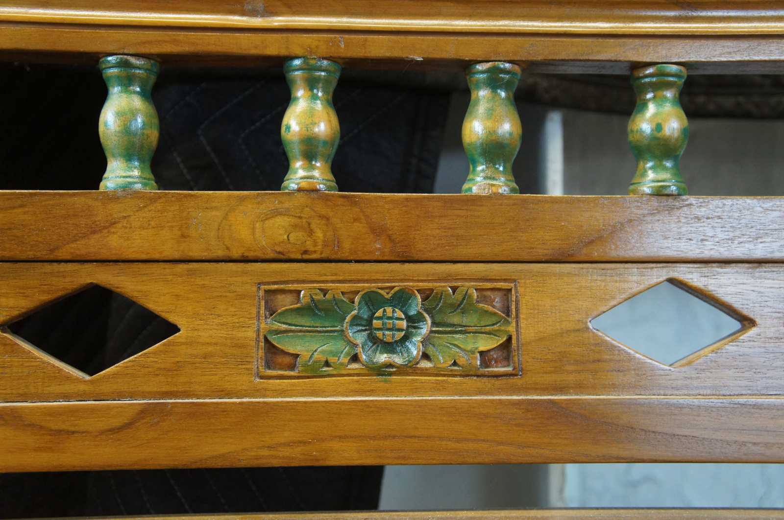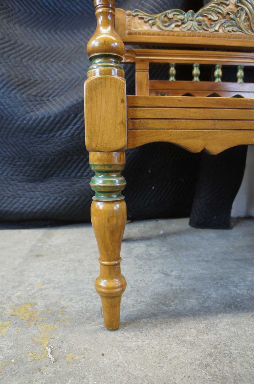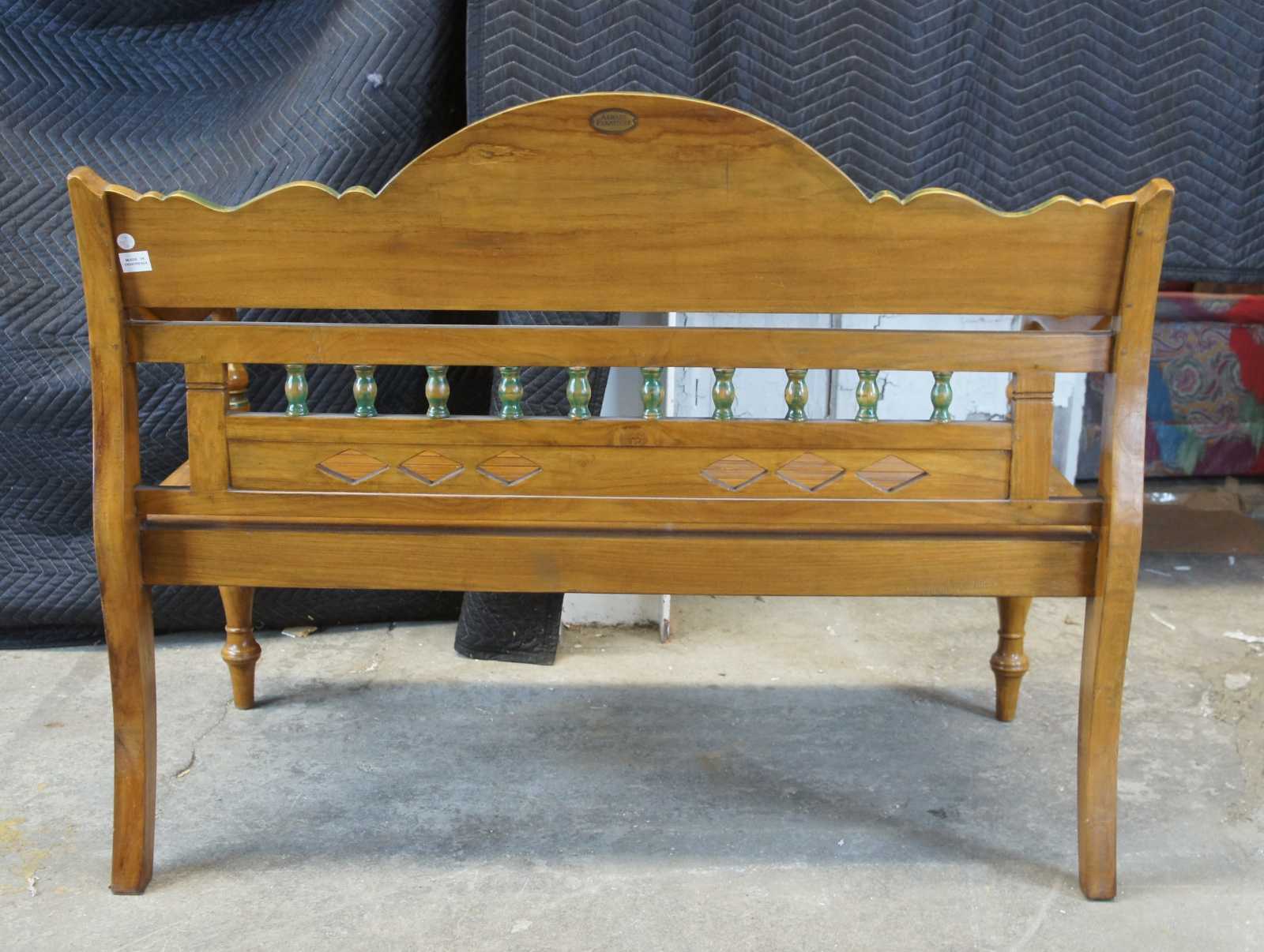 Vintage Arhaus Furniture entry seat or hall bench. Made of teak, featuring carved scallop and leaf designs along the crest, rounded turnings and diamond-shaped piercings to the back, a slatted seat, curved armrests, and lathe-turned legs. Made in Indonesia, marked with Arhaus plaque along back.