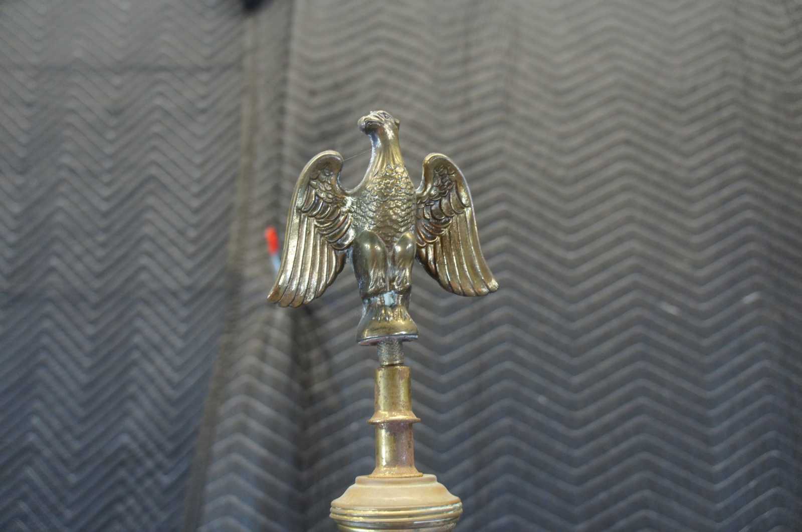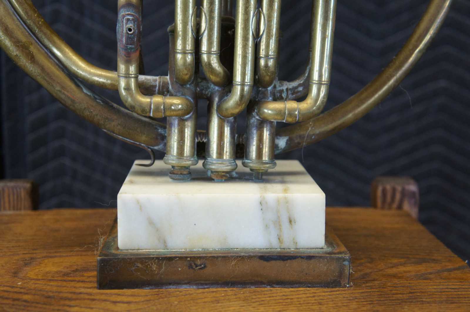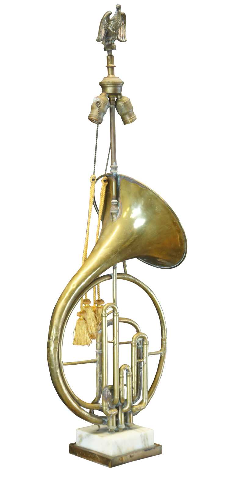 A gorgeous antique horn lamp over marble base. Features an A Hileron Paris, France French Horn, dual switch and large outstretched eagle finial.