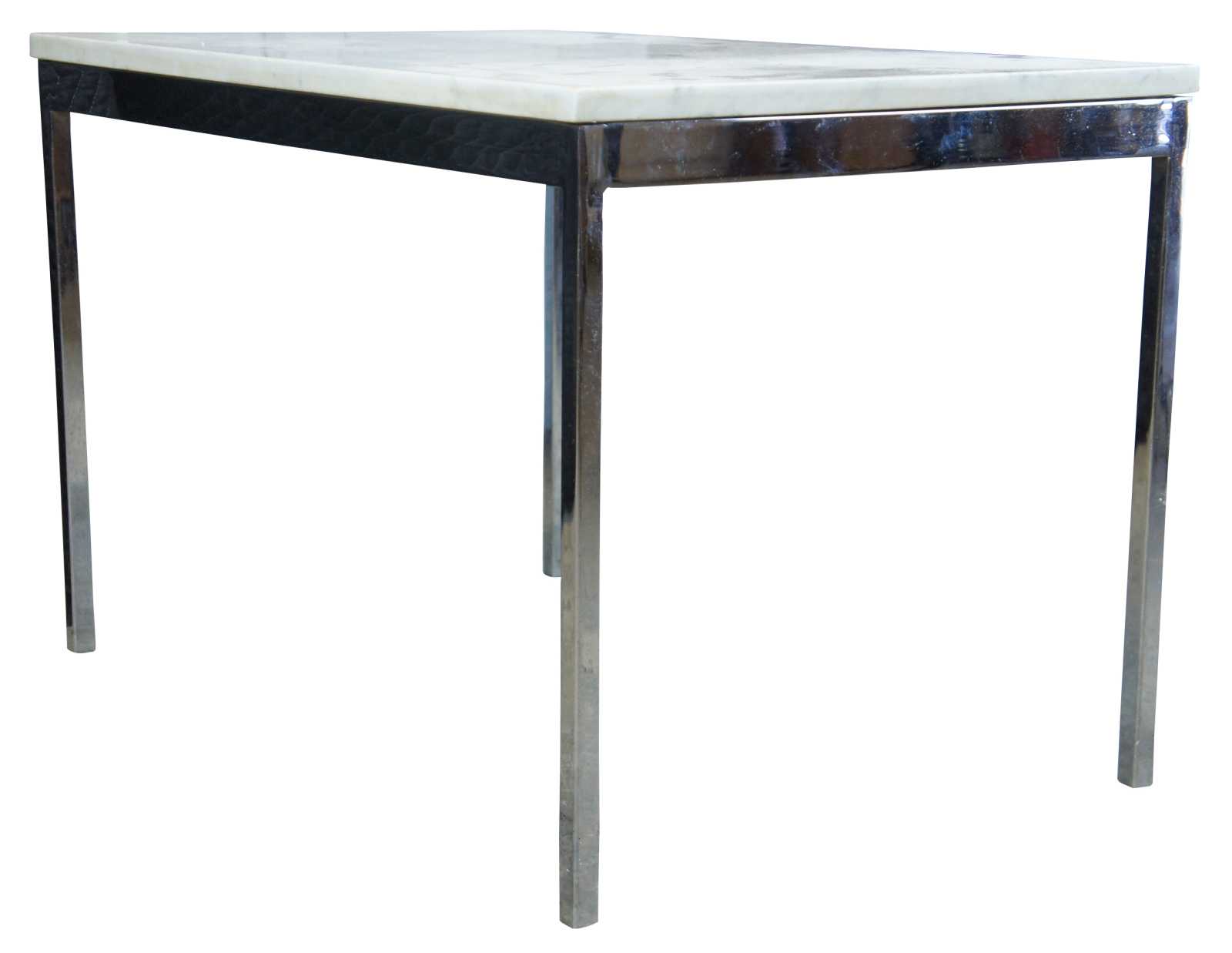A beautiful pair of Italian marble and chrome side tables, circa 1970s. Inspired by the Florence Knoll End Table that was designed to furnish the new interiors of postwar America. Scaled-down geometric lines, translating to the gestures and materials of modern architecture. Marble marked MBA, Made in Italy along underside.