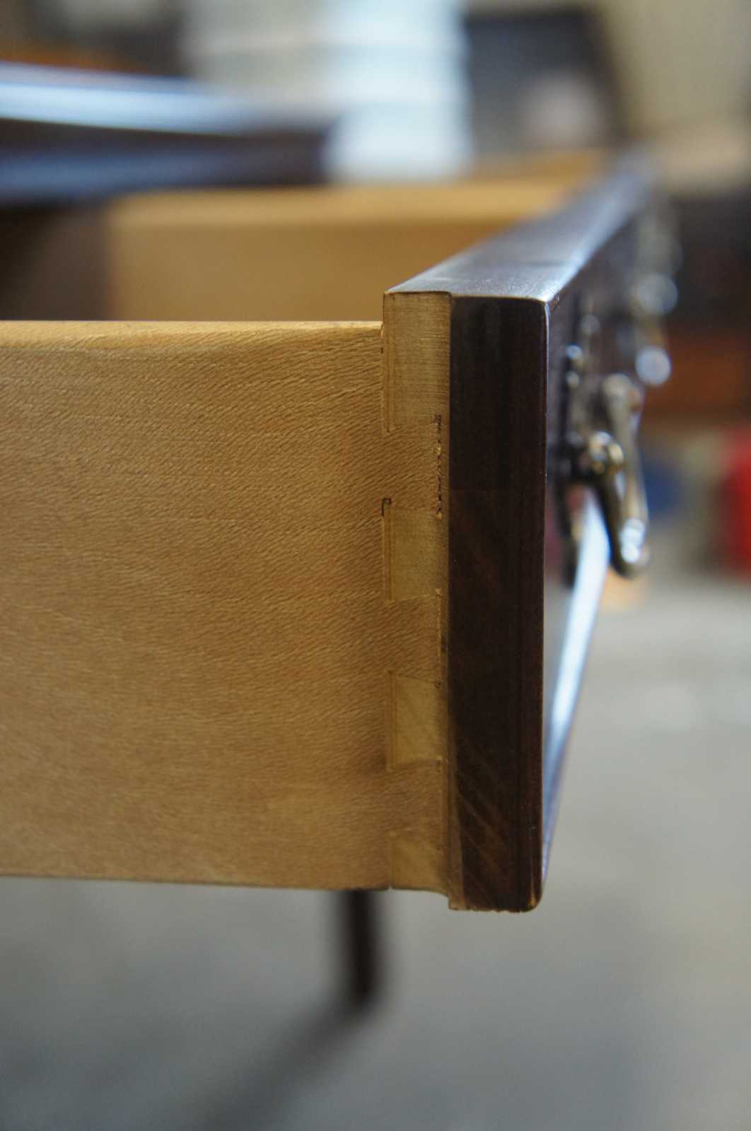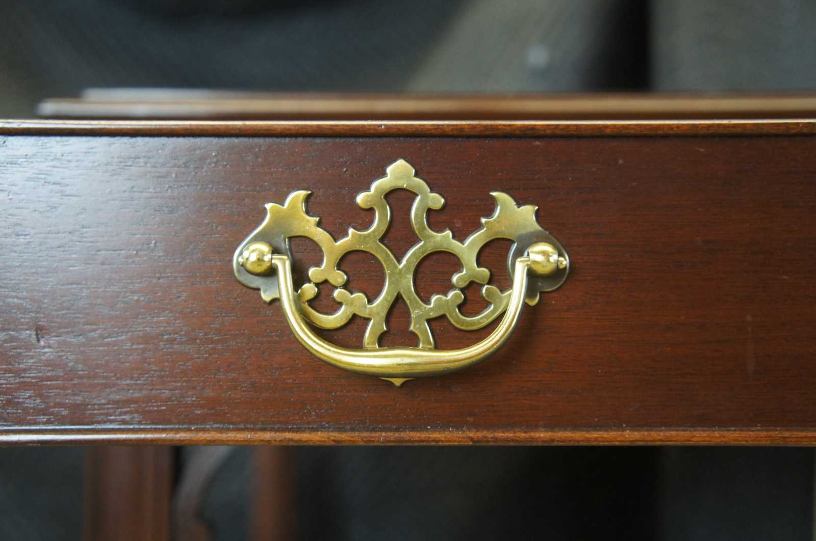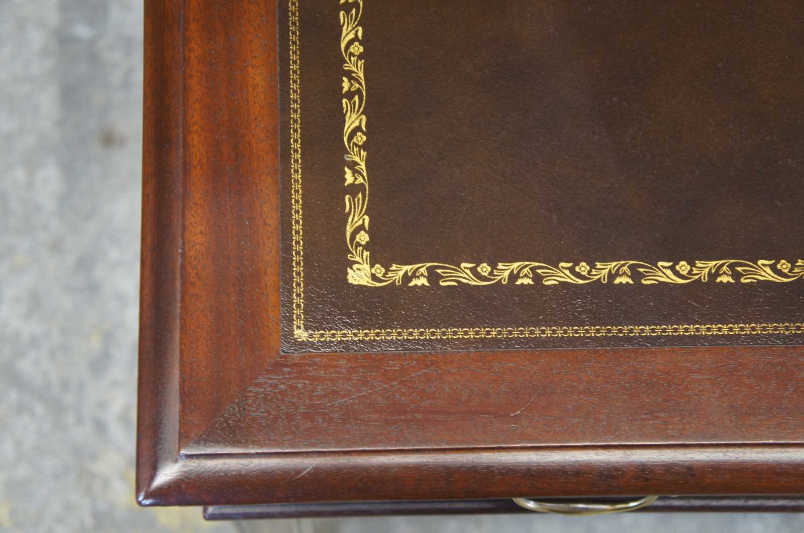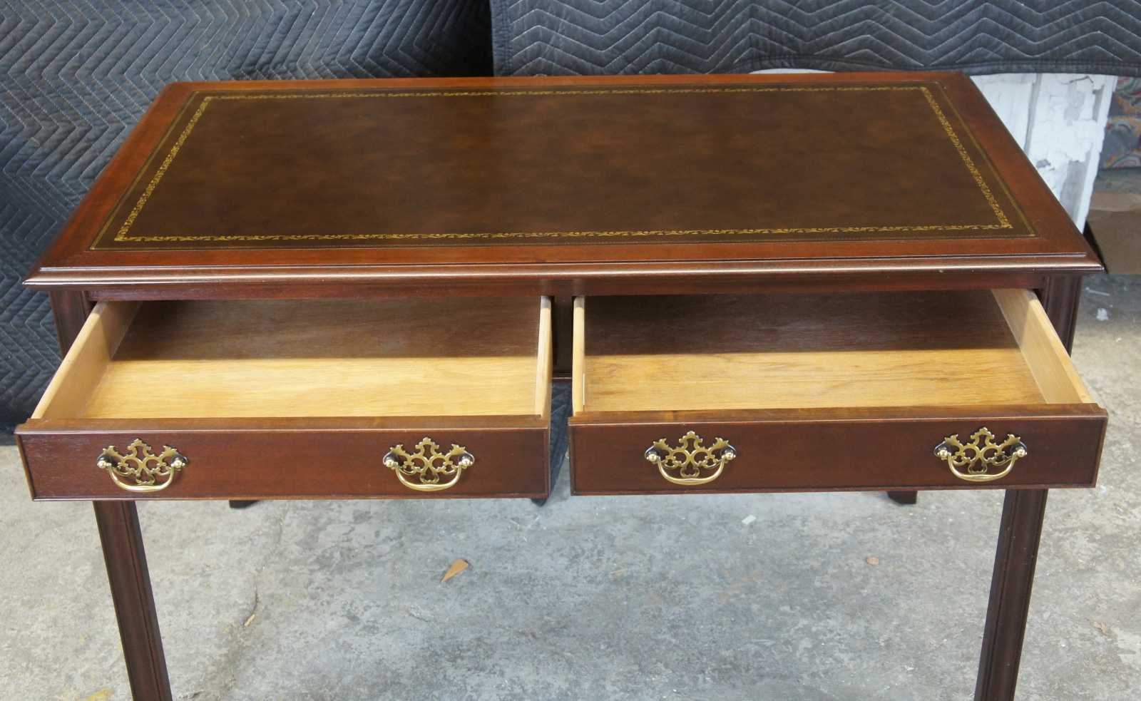 Vintage Hekman writing desk. Made of mahogany featuring rectangular form with tooled leather top, two drawers with brass hardware, and square form legs with a fluted edges.