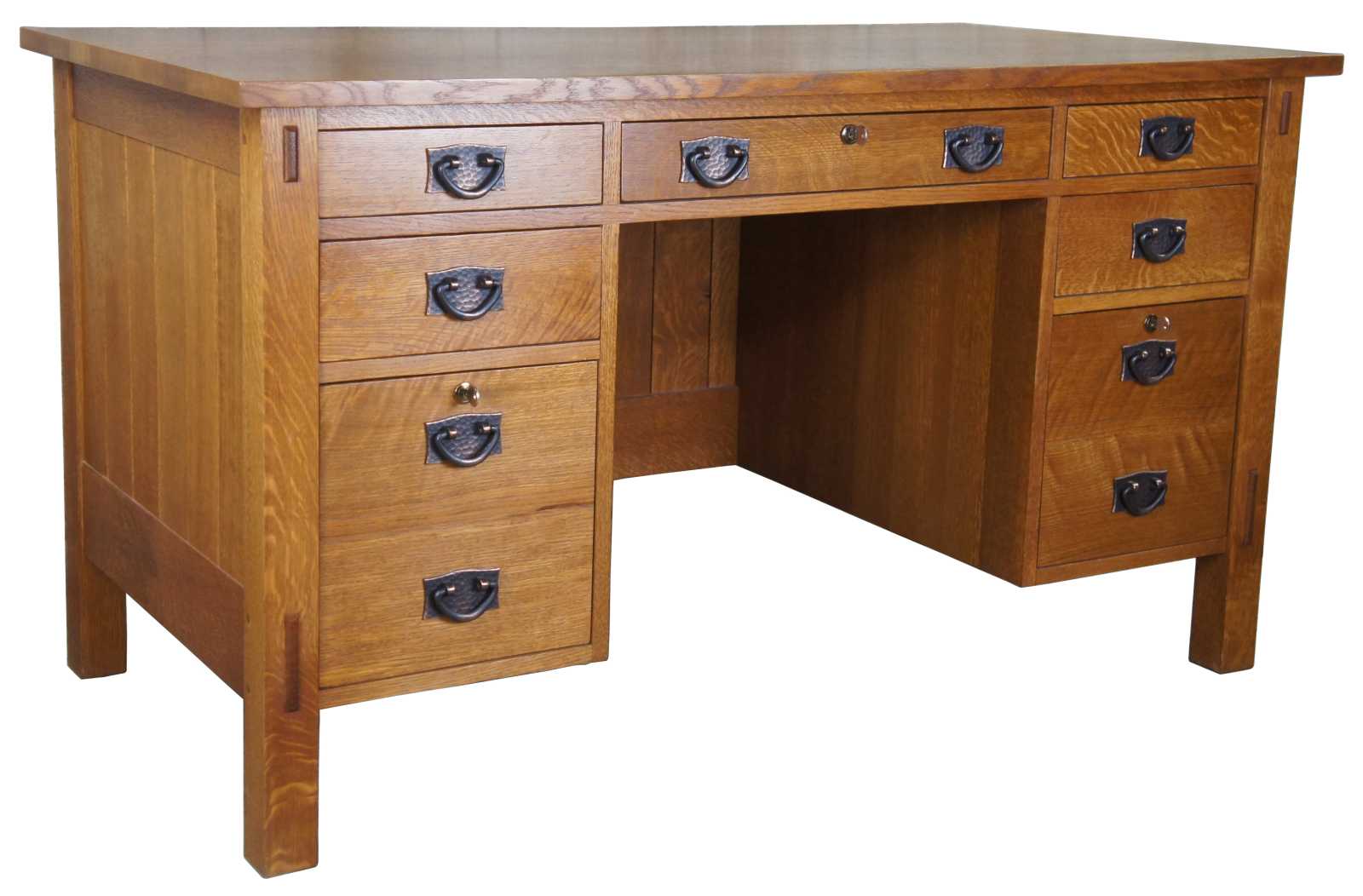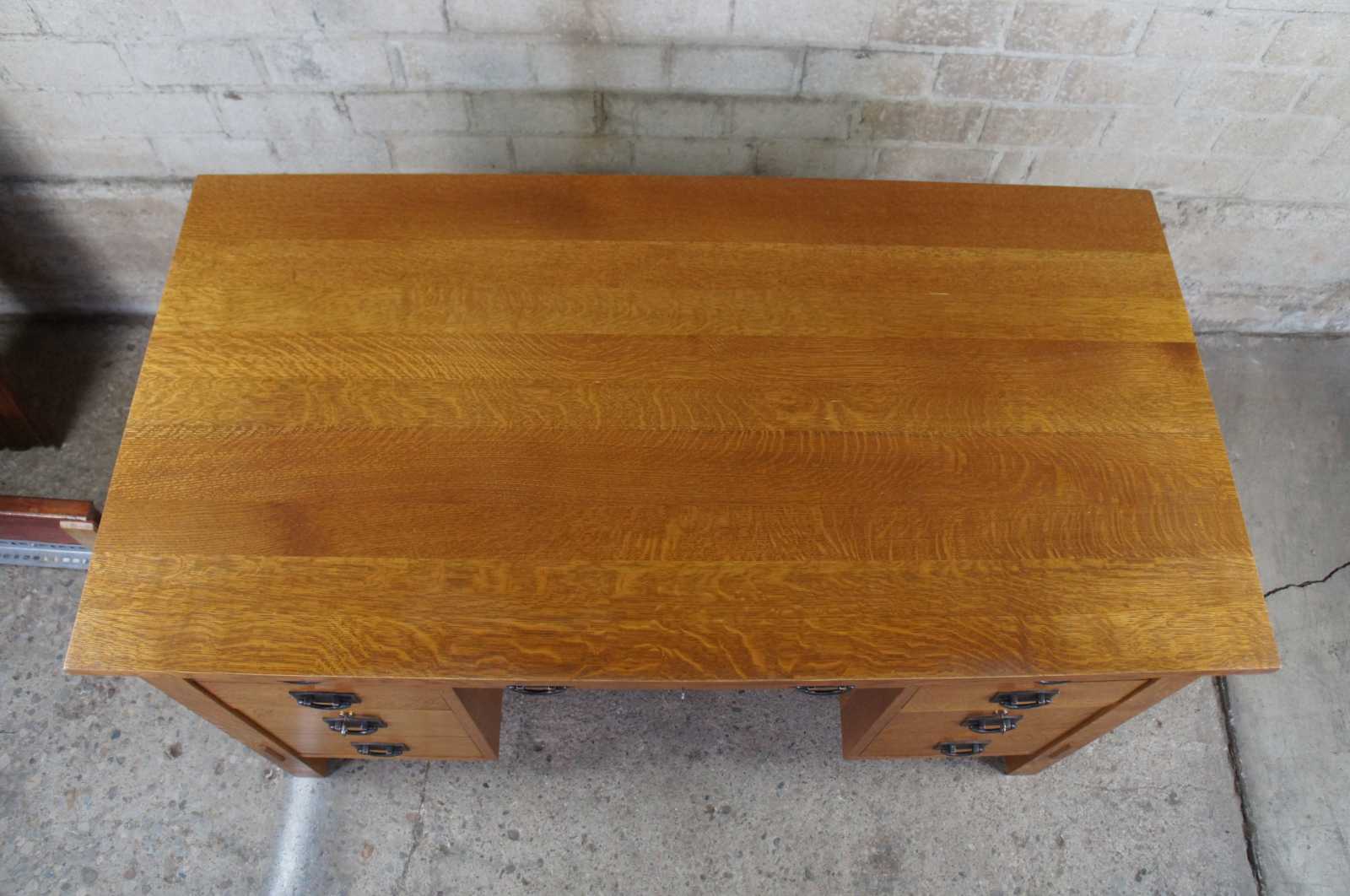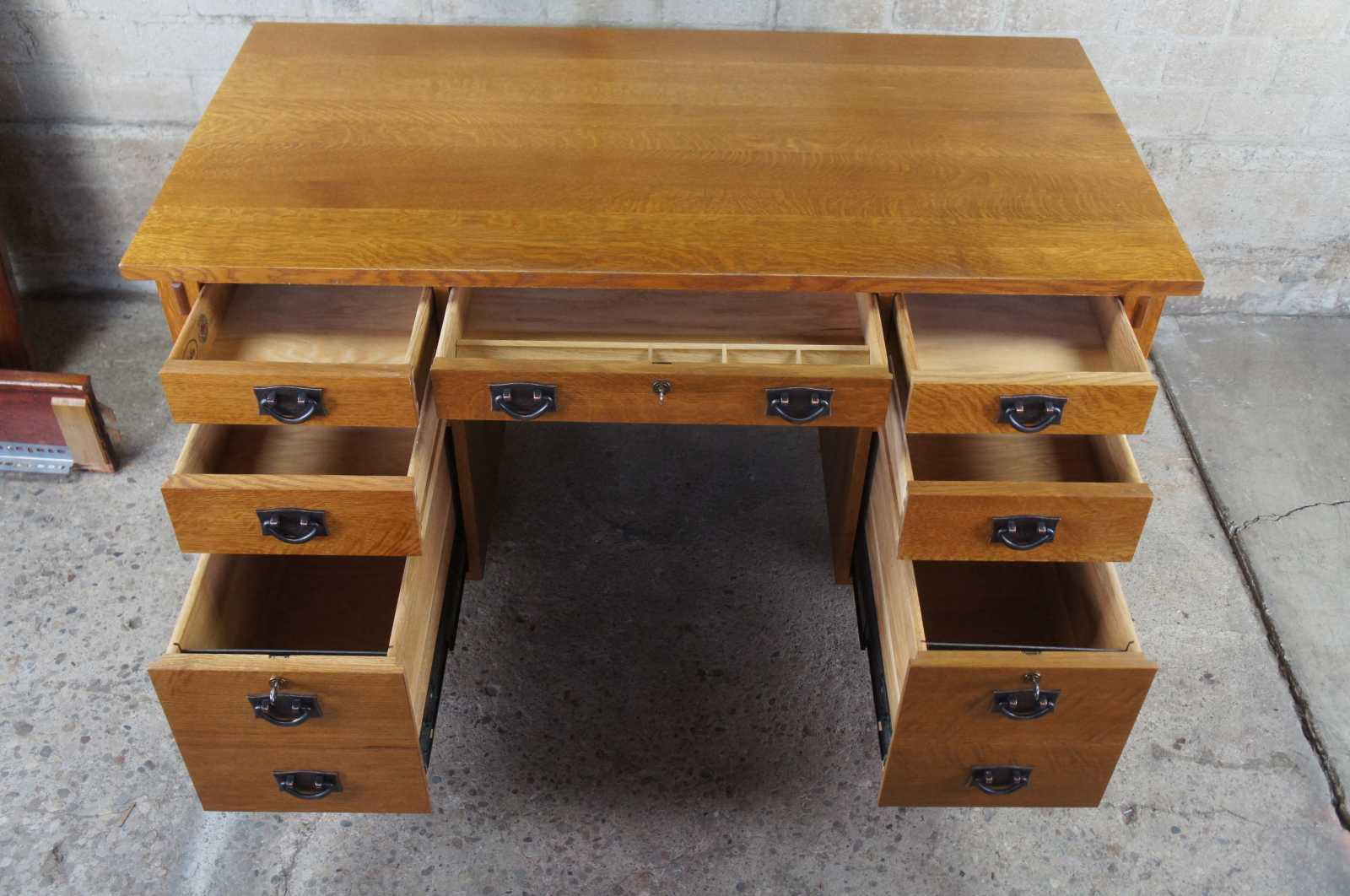 An Arts & Crafts Mission School Oak ‘Executive’ design Desk by Stickley Furniture made in 2006. A classic Mission School design and build to a very high standard. All the style of an Arts & Crafts desk, with practical and useable storage.