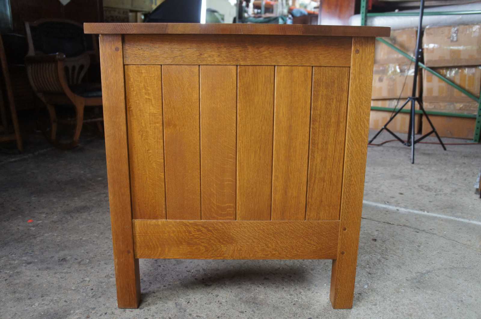 Solid very well figured quarter-sawn Oak throughout (quarter-sawing is a method of sawing oak logs to produce boards with superior strength making it less likely to crack shrink or warp. It also gives the finished boards prominent highly decorative 'medullary rays' in its grain.)