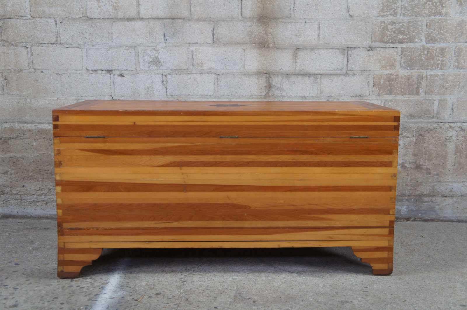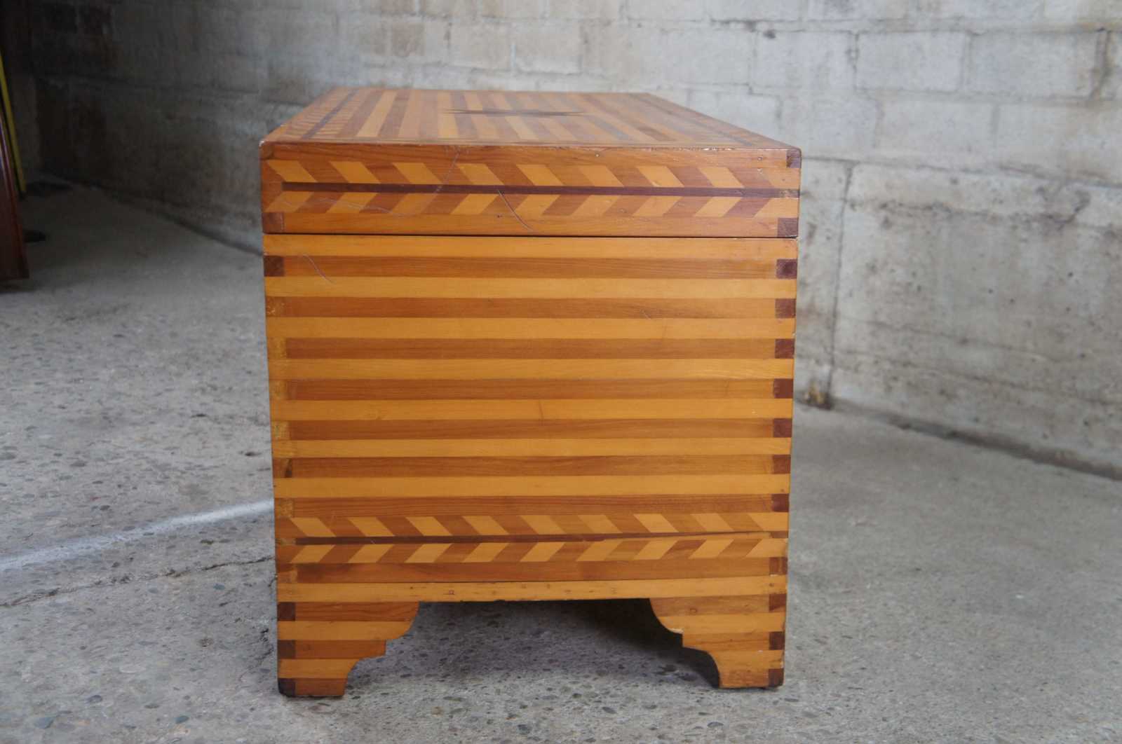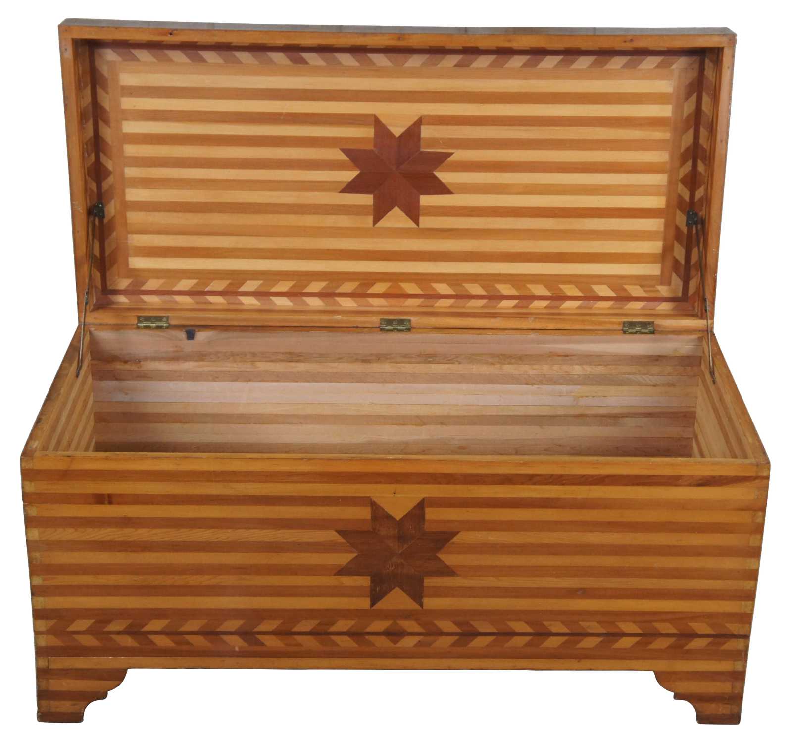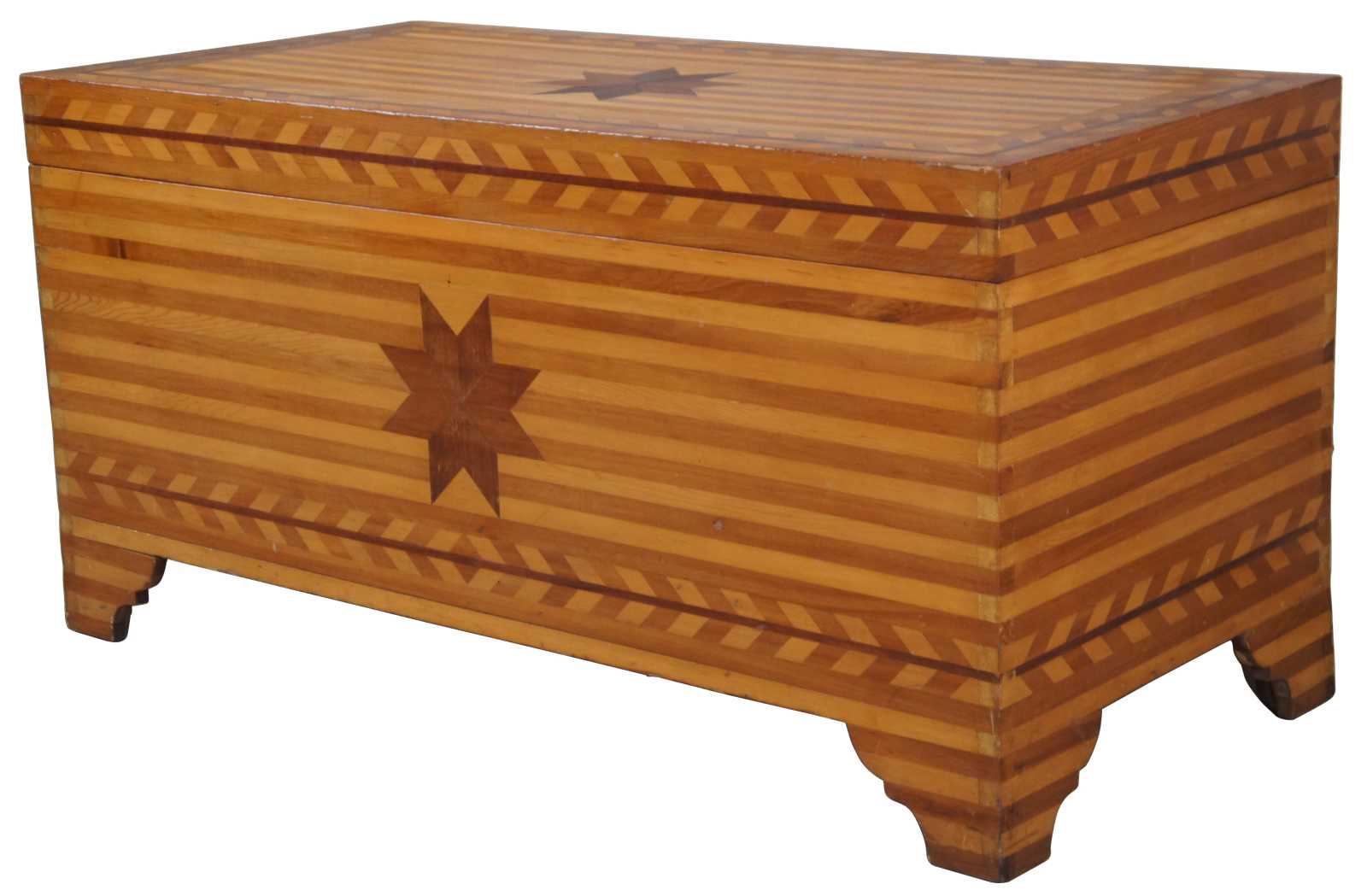 Antique Early American pine Folk Art farmhouse dowry or blanket chest featuring striped geometric parquetry design with lone stars. Acquired in the 1980’s from a Salt Lake City estate, retaining its original tags from Railway Express Agency, Susanville California.