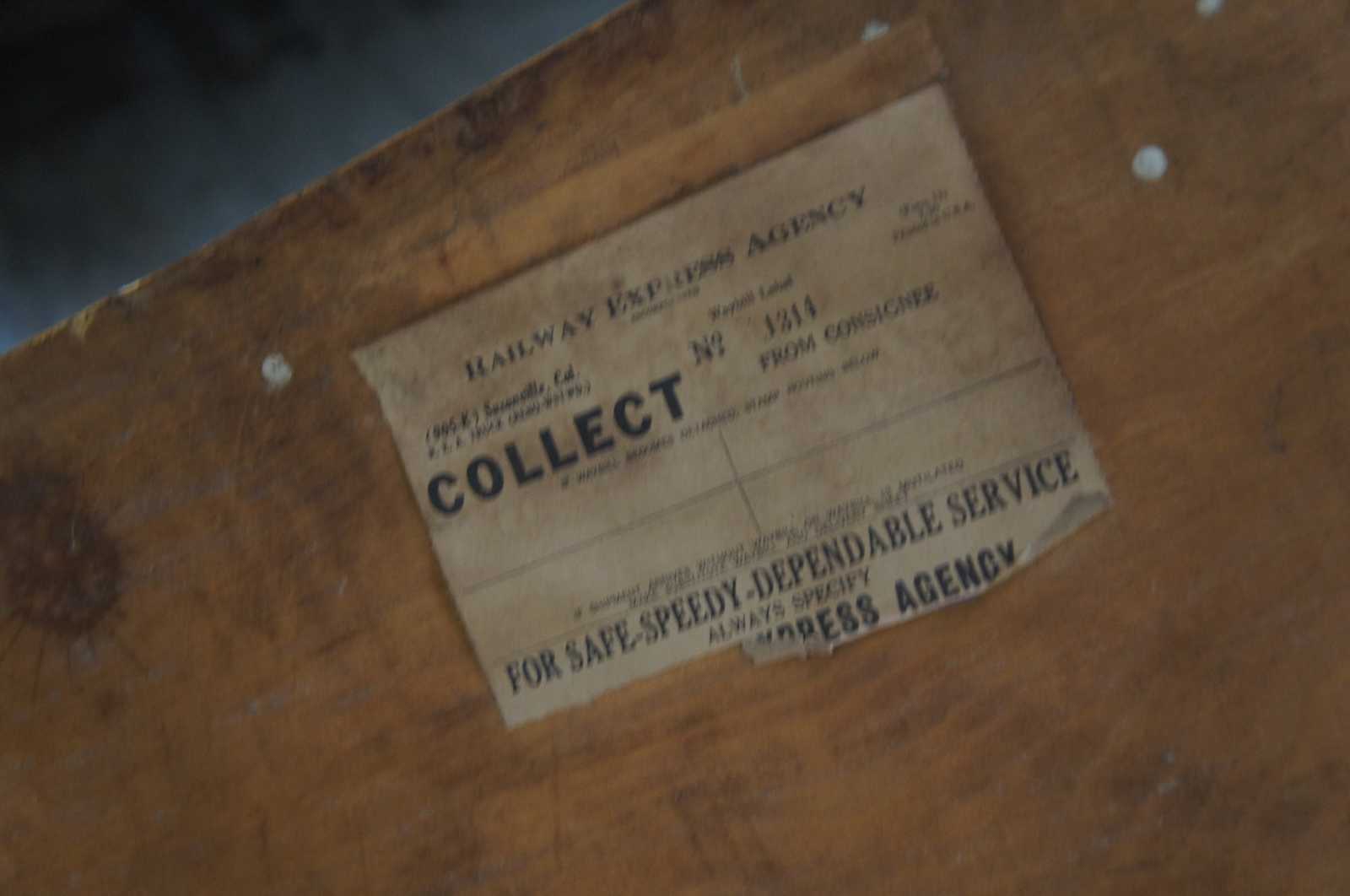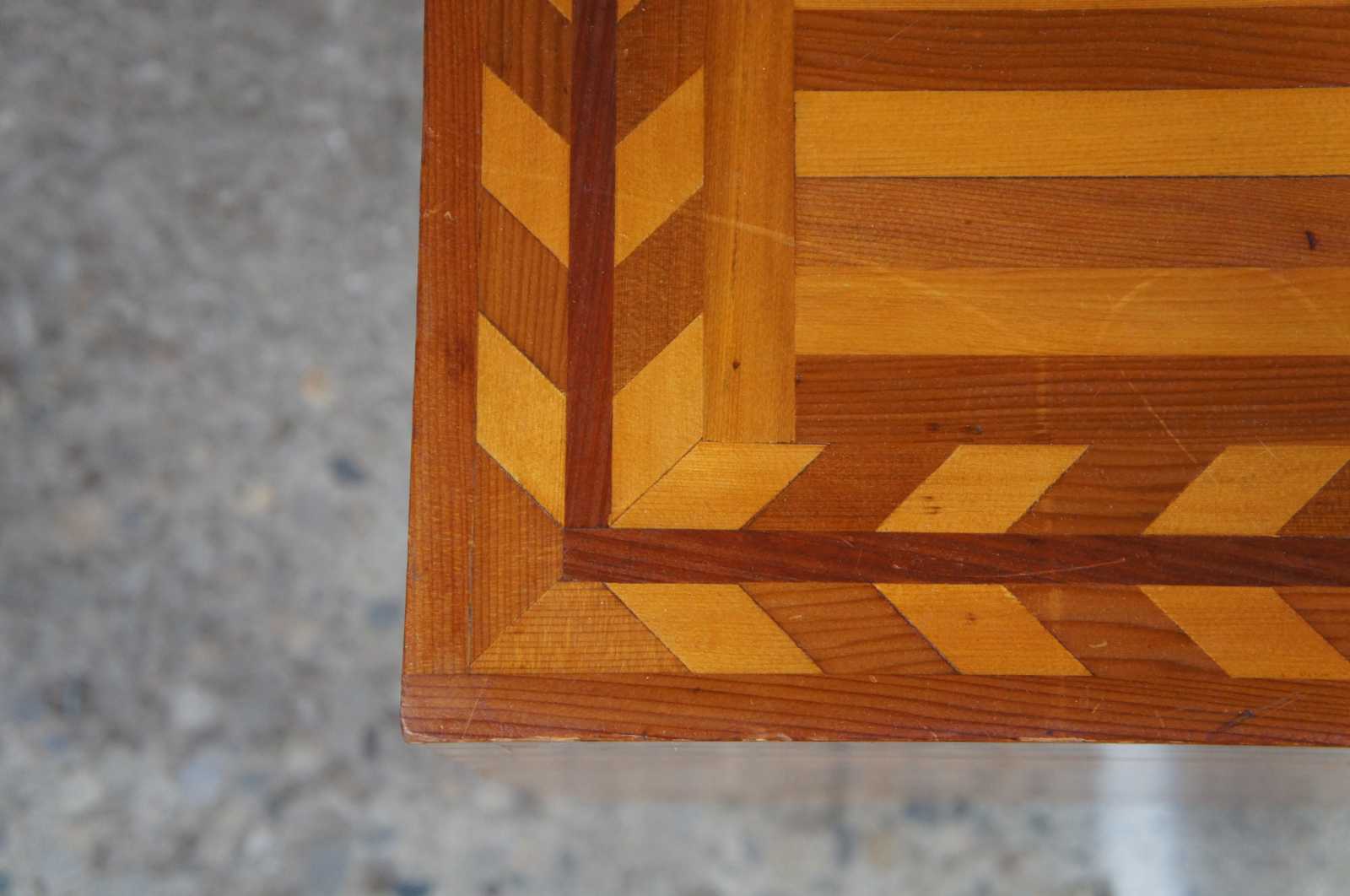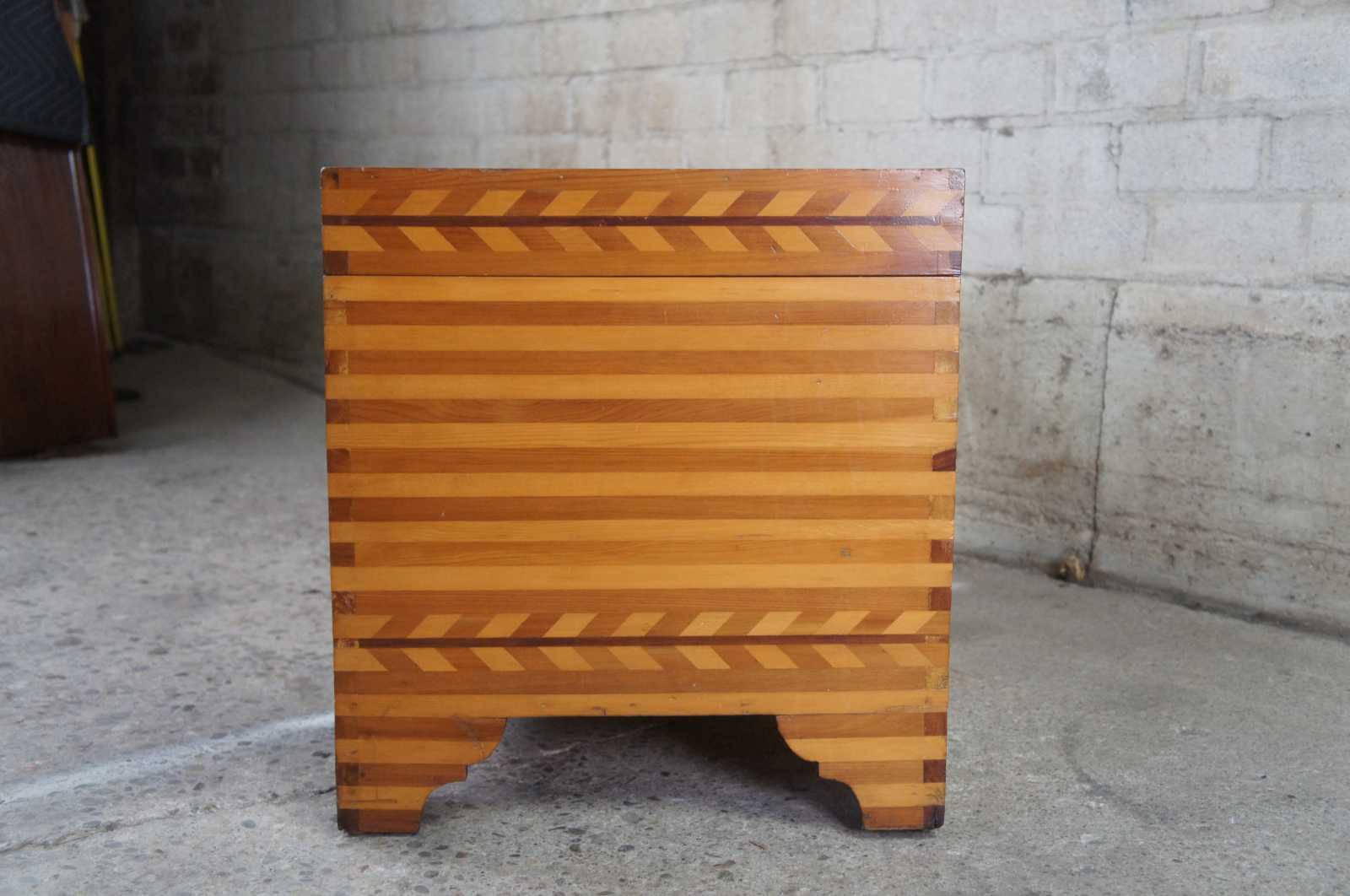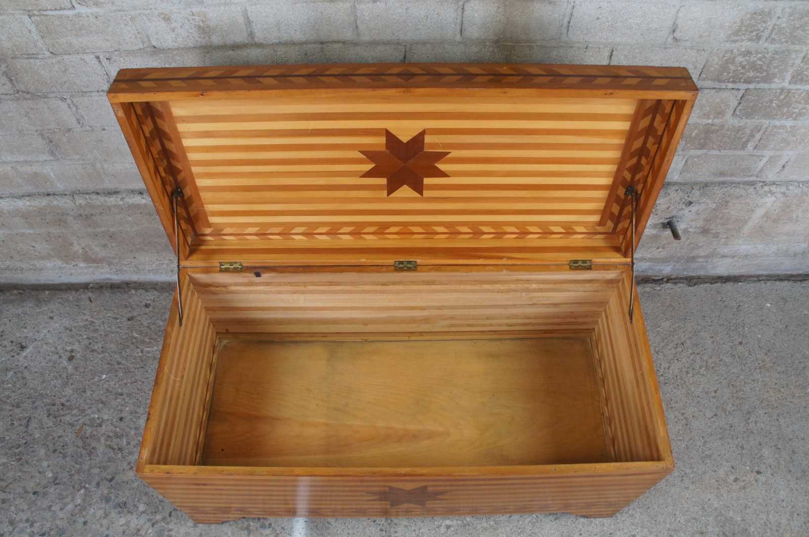 Antique Early American pine Folk Art farmhouse dowry or blanket chest featuring striped geometric parquetry design with lone stars. Acquired in the 1980’s from a Salt Lake City estate, retaining its original tags from Railway Express Agency, Susanville California.