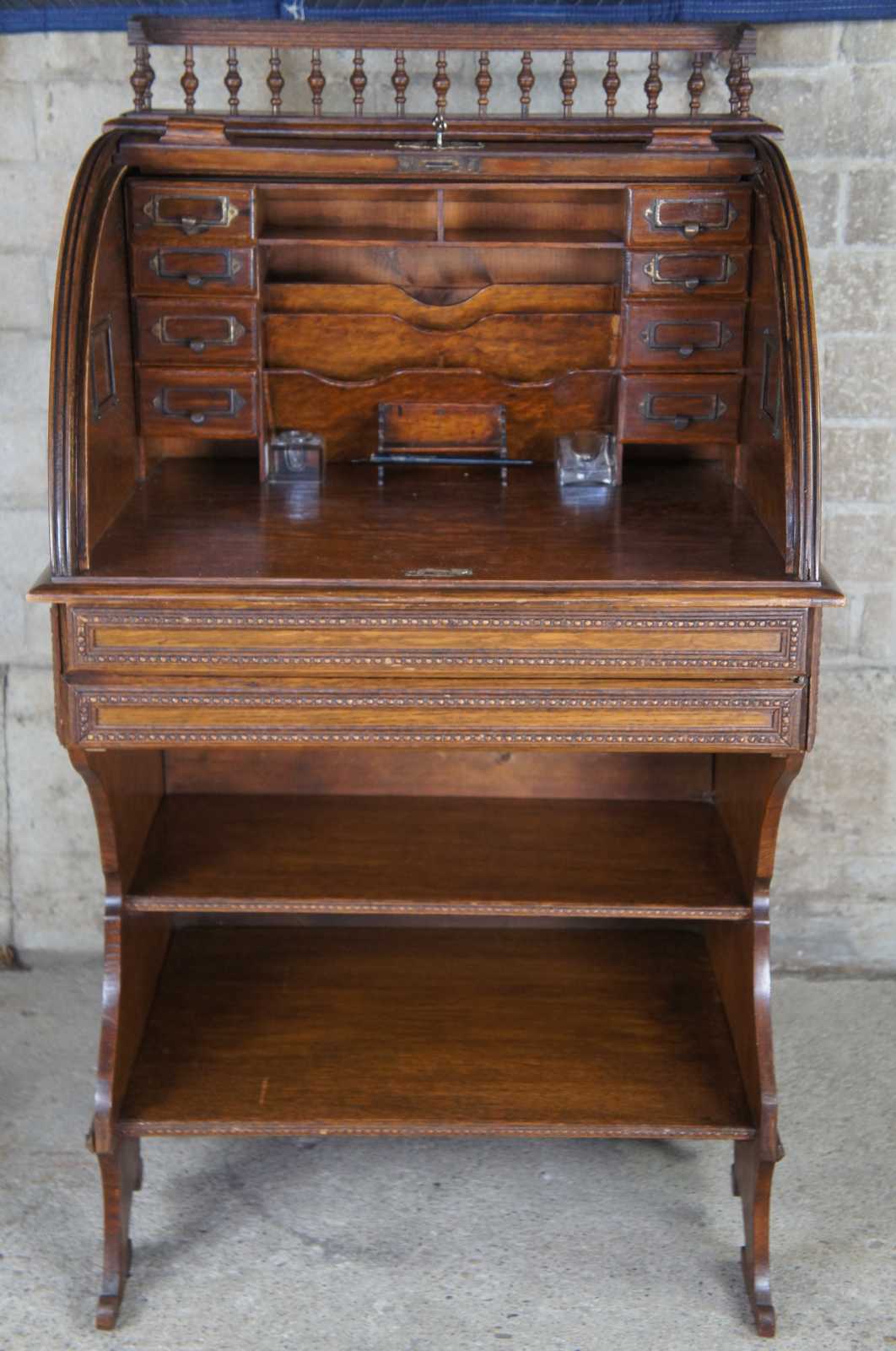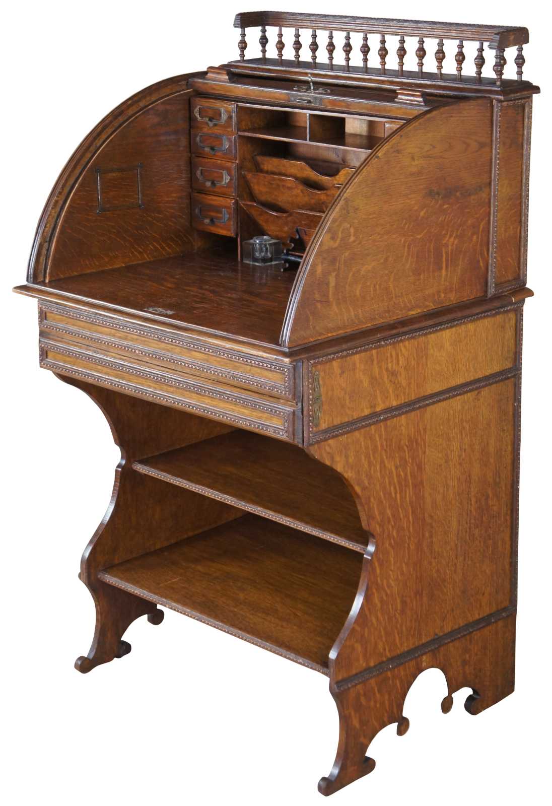 Rare antique Victorian roll top library writing desk. Made of quartersawn oak featuring a tambour door that opens to multiple cubbies / compartments and file / letter storage with two inkwells and pen holder. Also features an upper gallery with turned wood accents, two drawers, lower bookcase shelves and serpentine bracket feet. Reminiscent of a Davenport or ships desk. Pen made by Kohinoor Germany no 130. Complete with working lock and key.