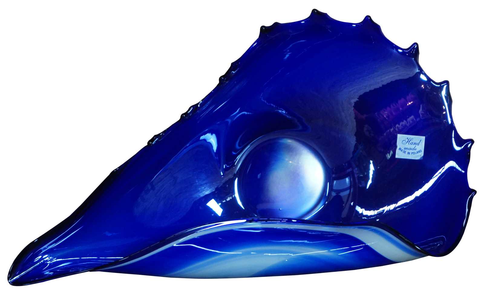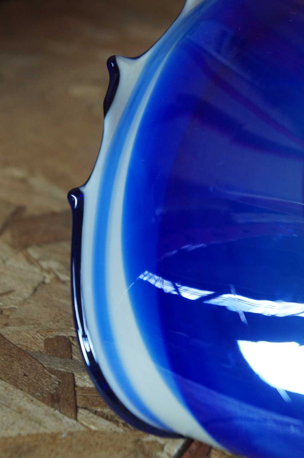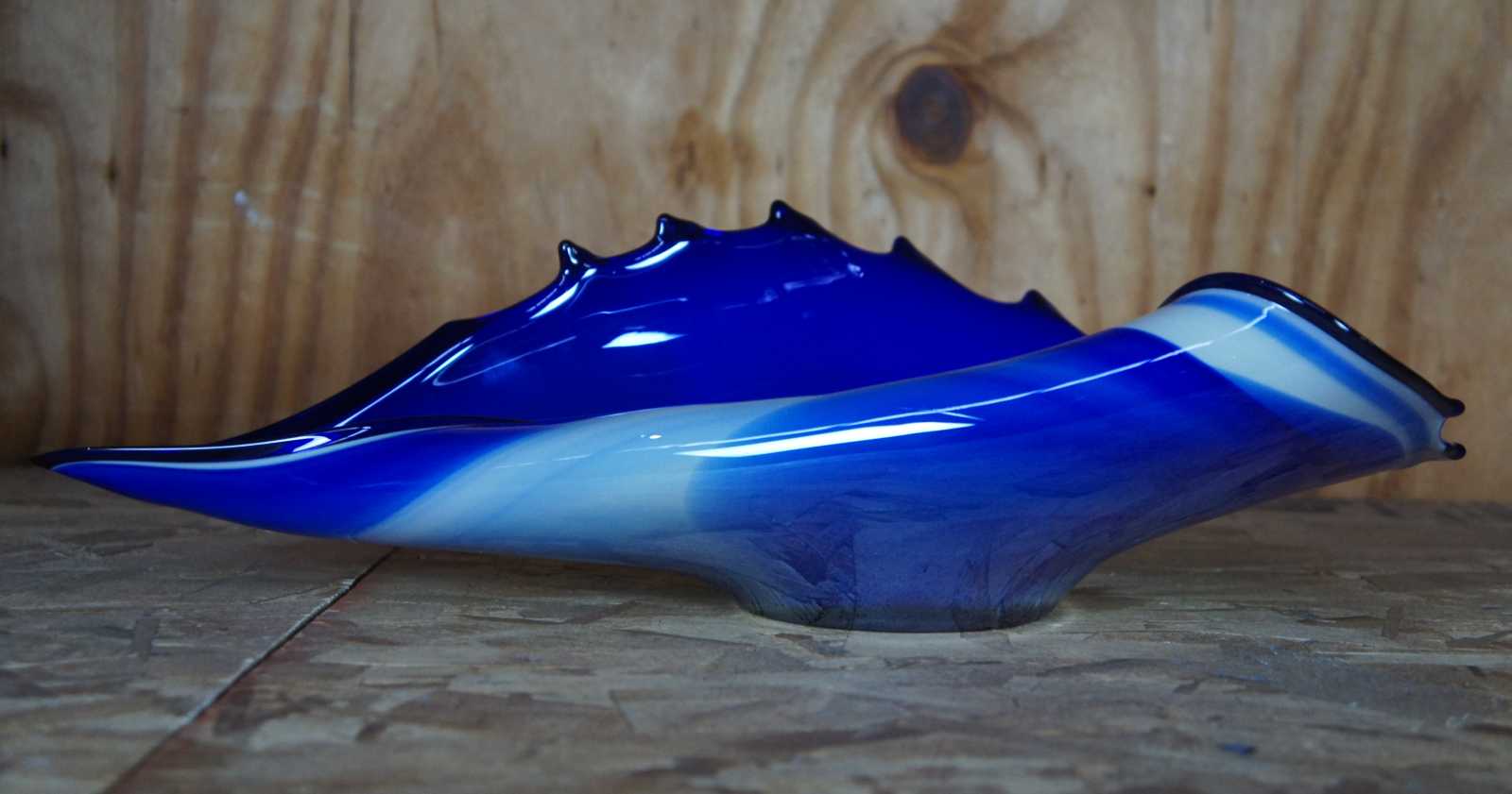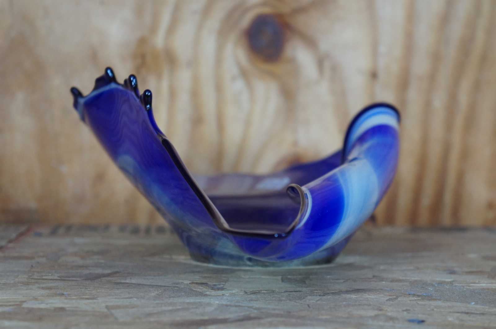 Vintage hand blown free form studio art glass bowl in blue and white, abstractly reminiscent of a seashell, made in Poland.