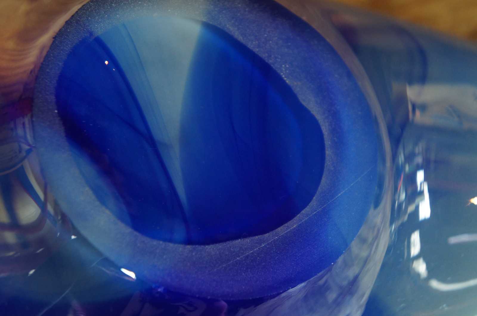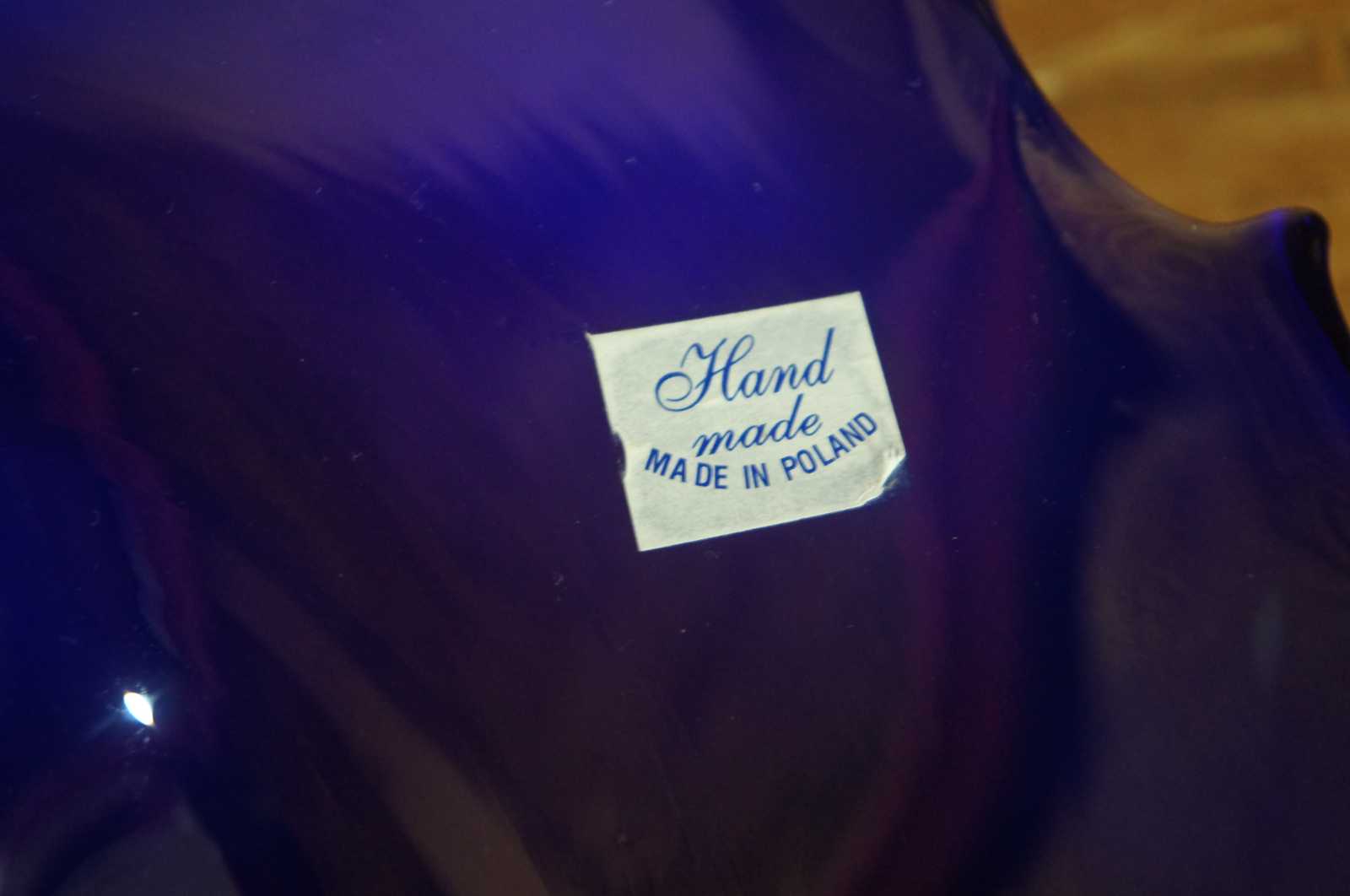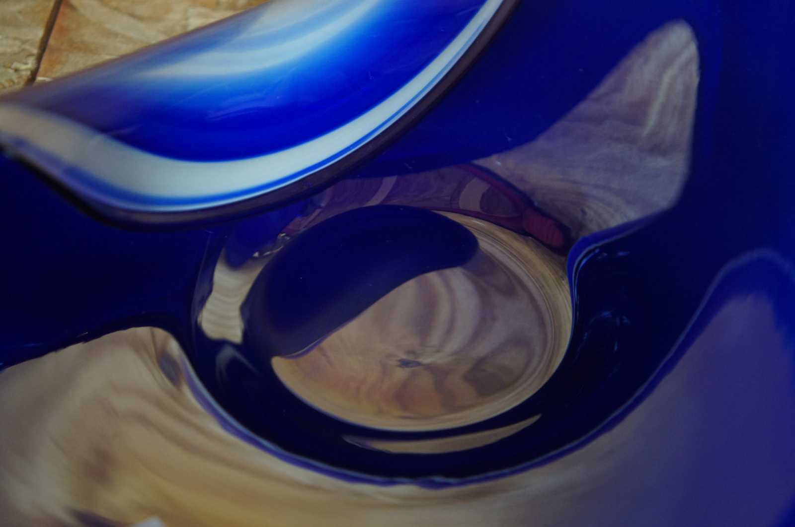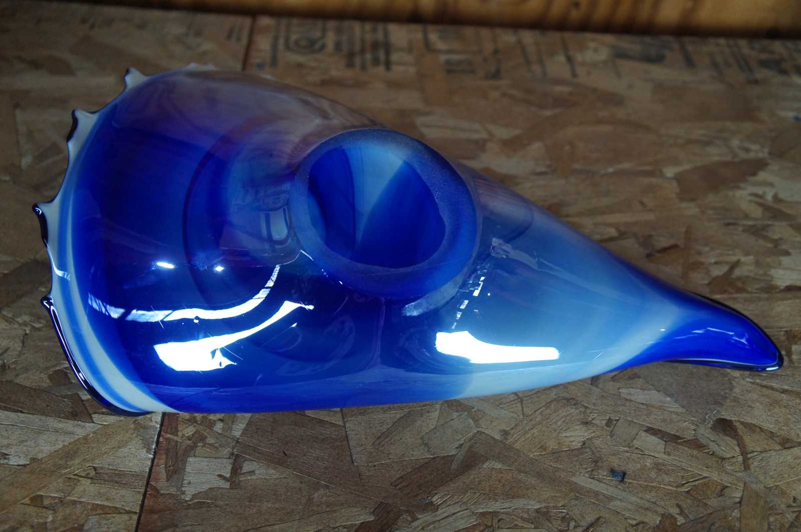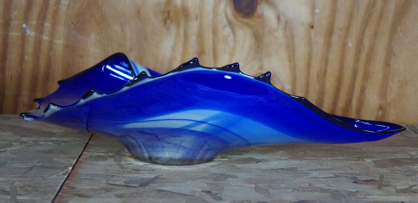 Vintage hand blown free form studio art glass bowl in blue and white, abstractly reminiscent of a seashell, made in Poland.