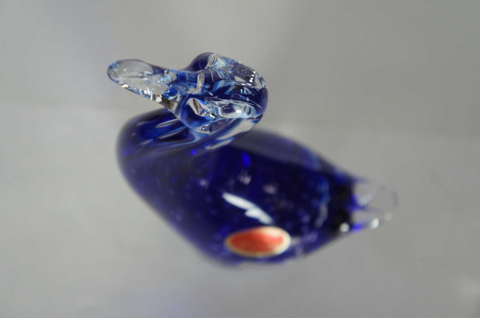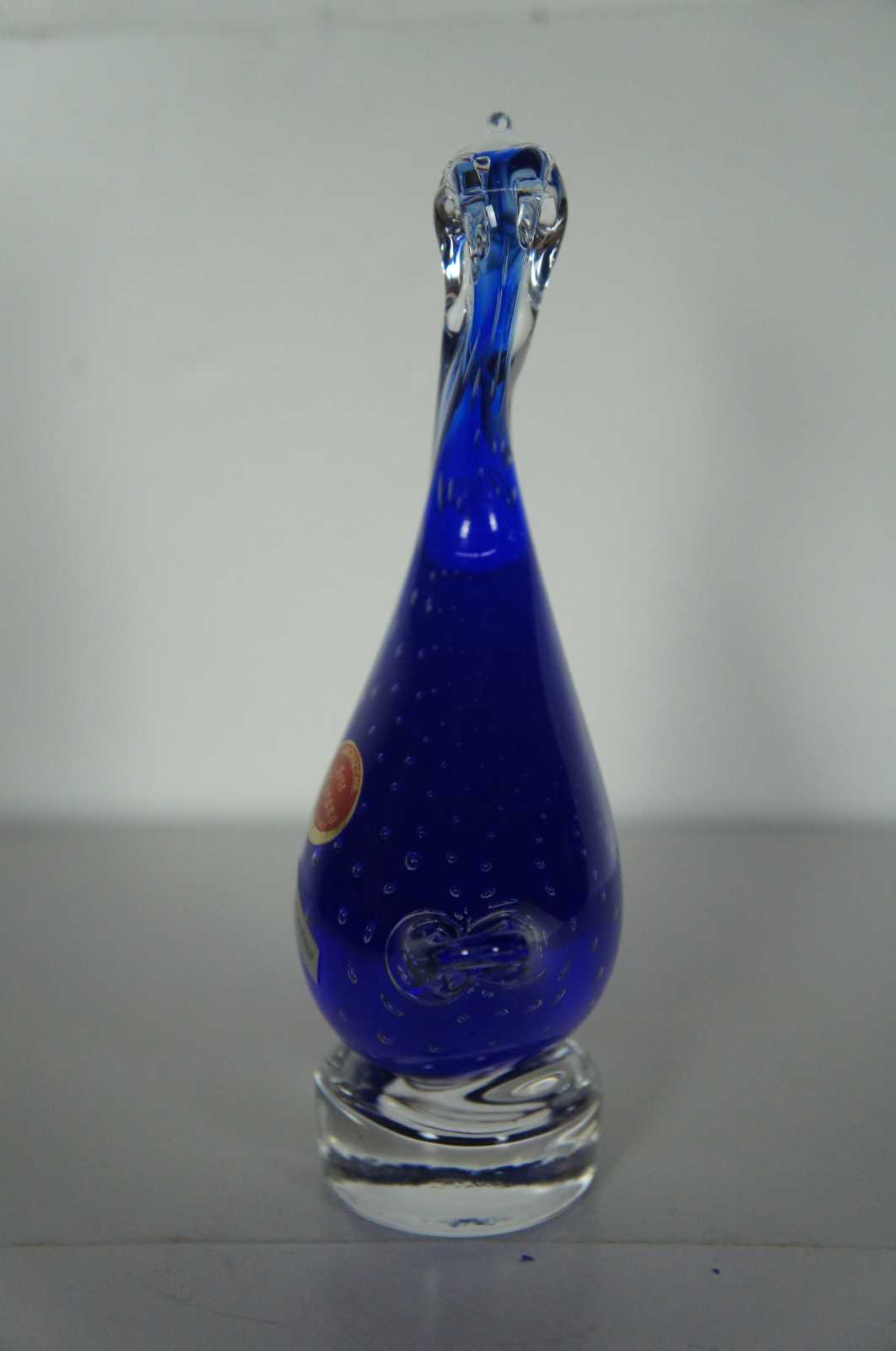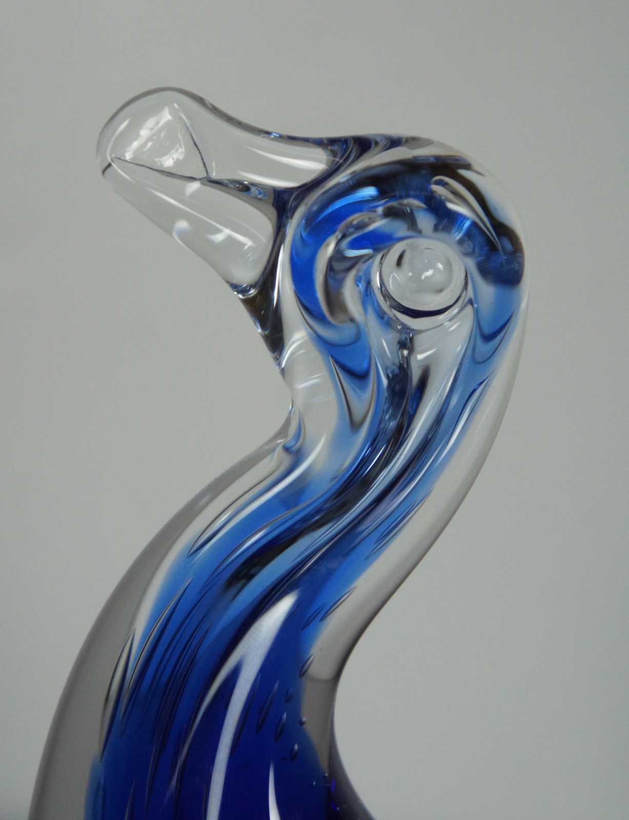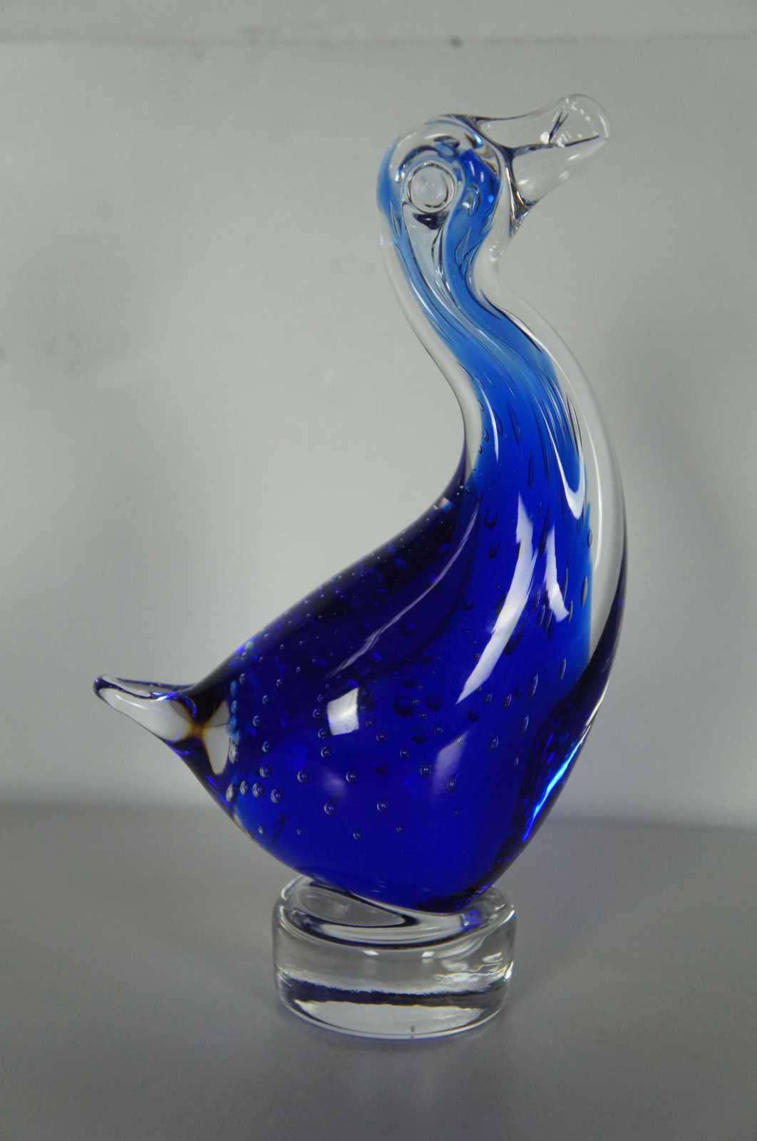 Murano studio art glass figurine in the shape of a blue duck on a transparent base with controlled bubble design, by Lavorazione Arte, Italy.
