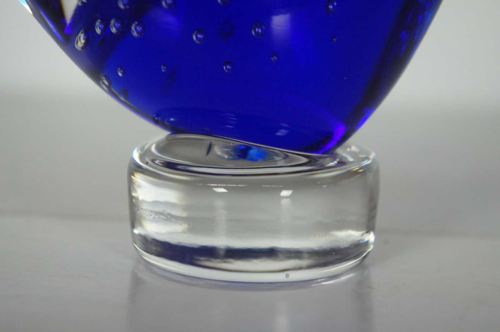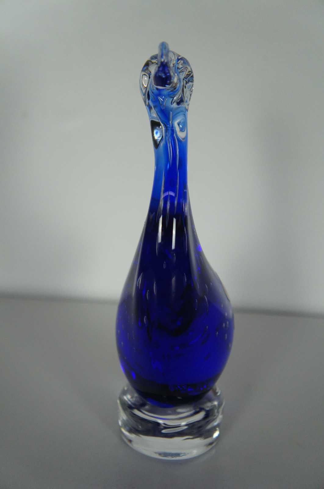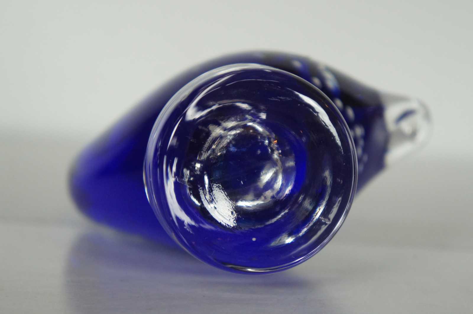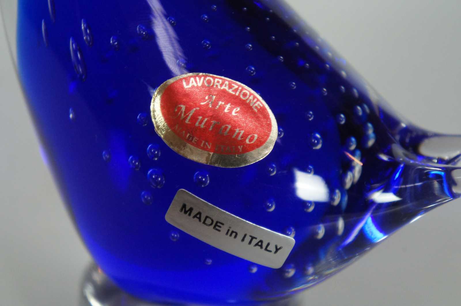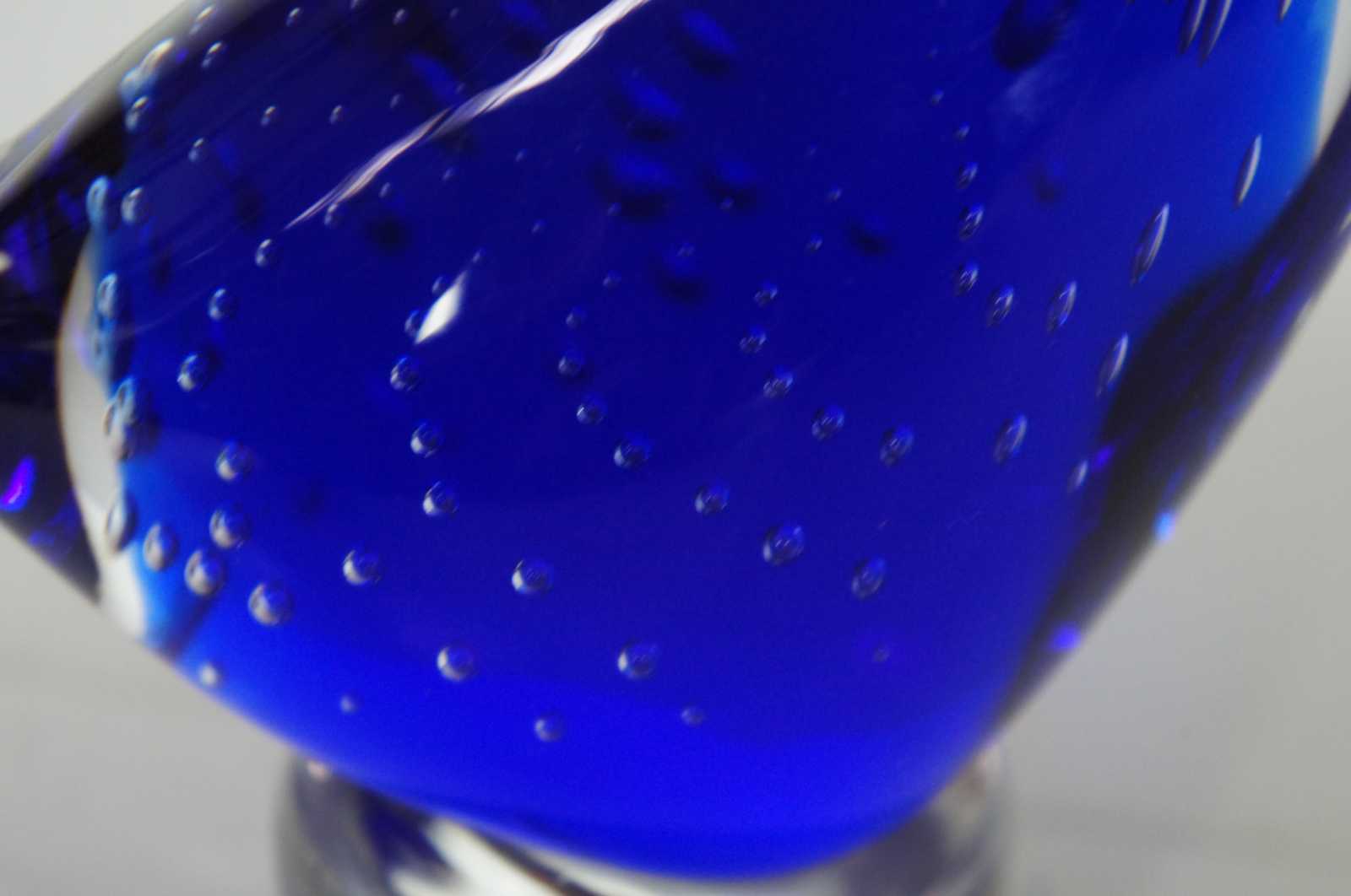 Murano studio art glass figurine in the shape of a blue duck on a transparent base with controlled bubble design, by Lavorazione Arte, Italy.