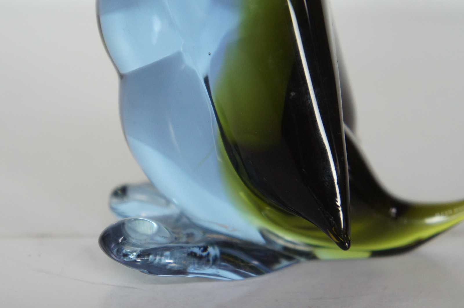 Hand blown Murano Sommerso Italian art glass figurine in the shape of a translucent olive green and sky blue duck / swan / goose / bird.