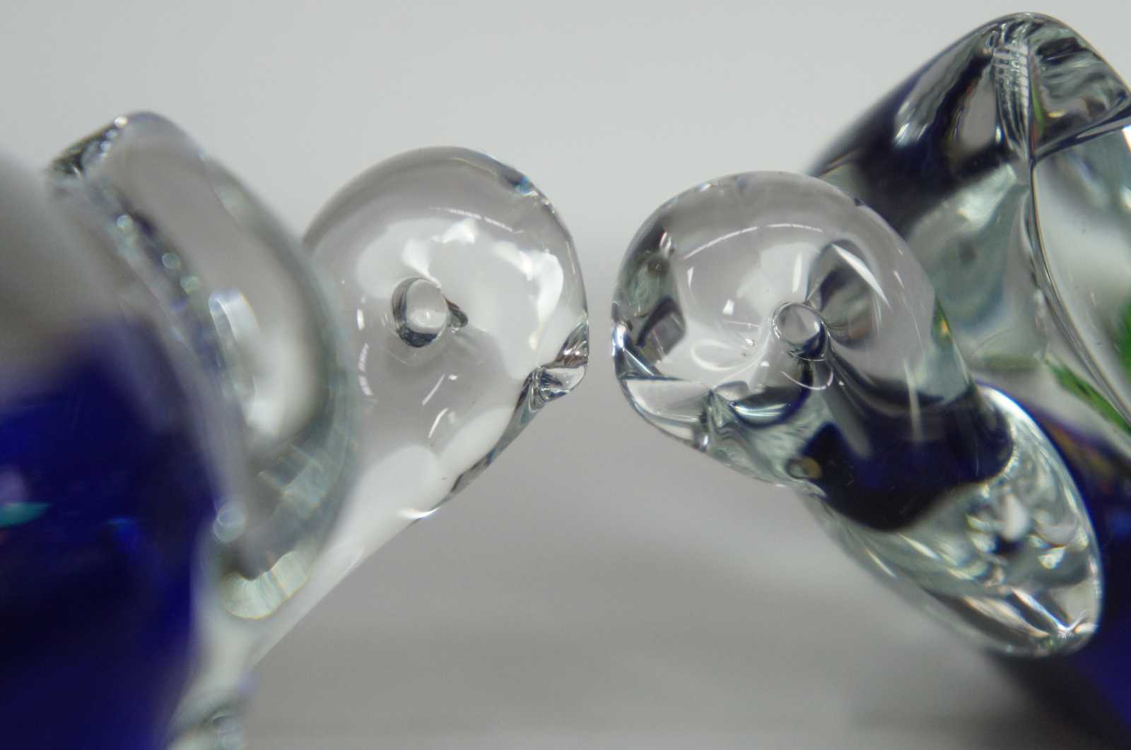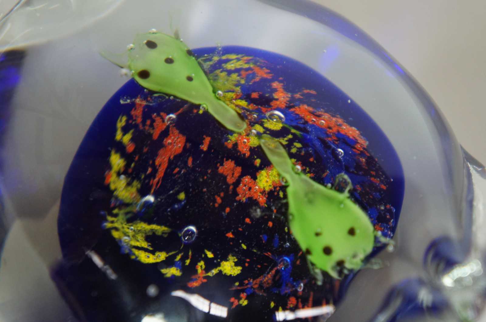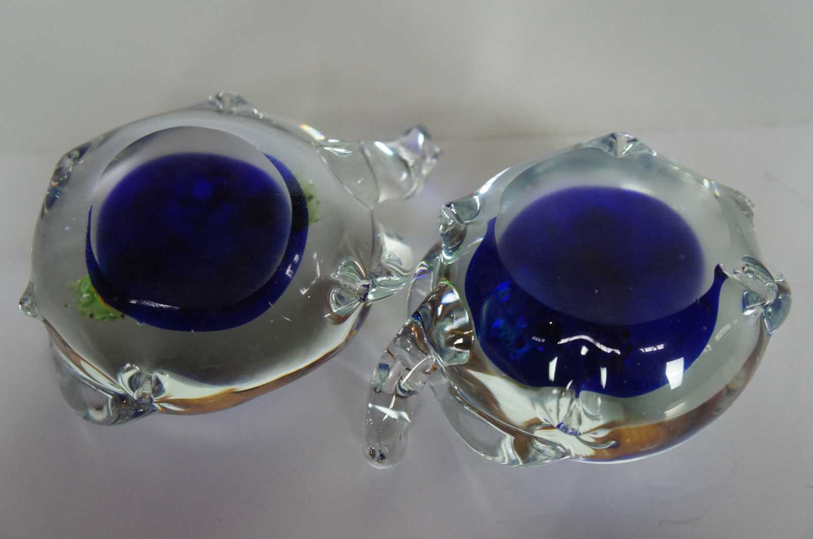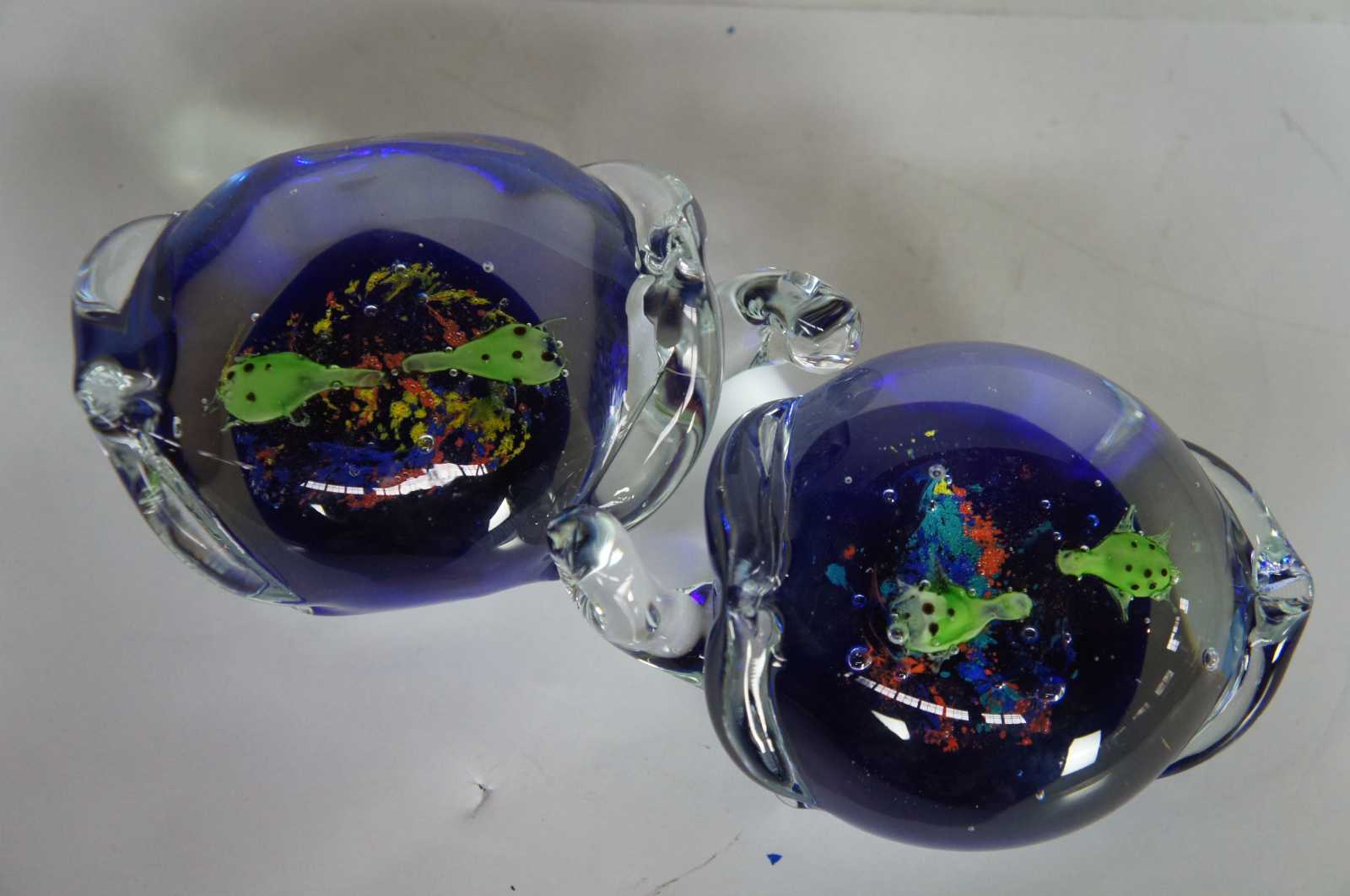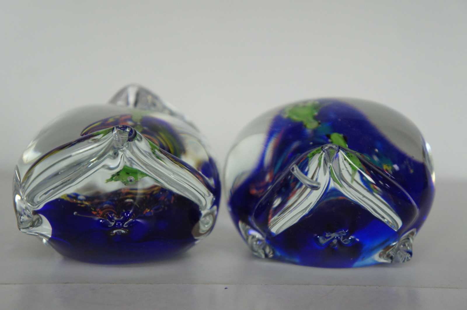 Pair of hand blown Italian art glass figurines / paperweights or hand chillers in the shape of sea turtles with a miniature aquarium scene of two more turtles inside their shells.