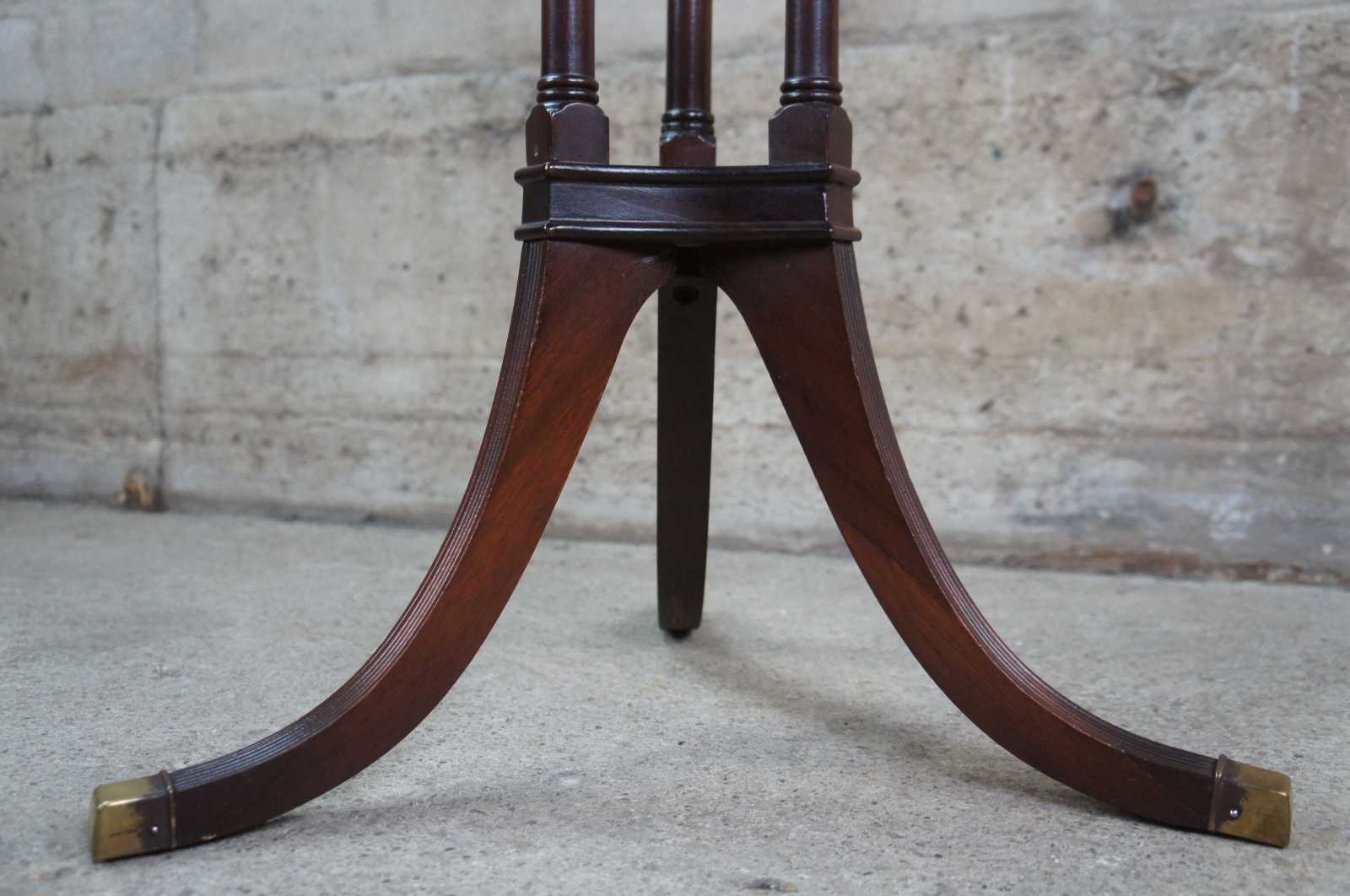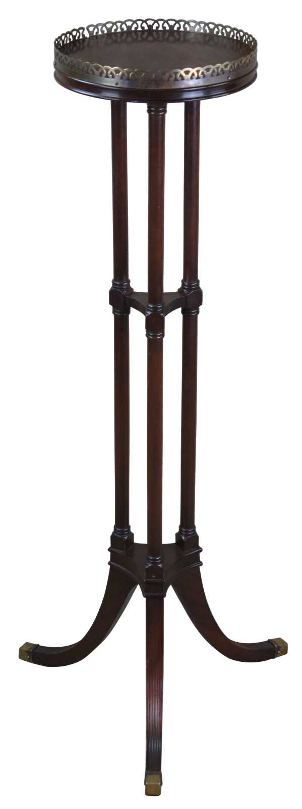 Antique Ferguson Bros Mfg Co pedestal table or plant stand. Made of mahogany featuring a tiered design with flared fluted legs, three turned columns and brass gallery.