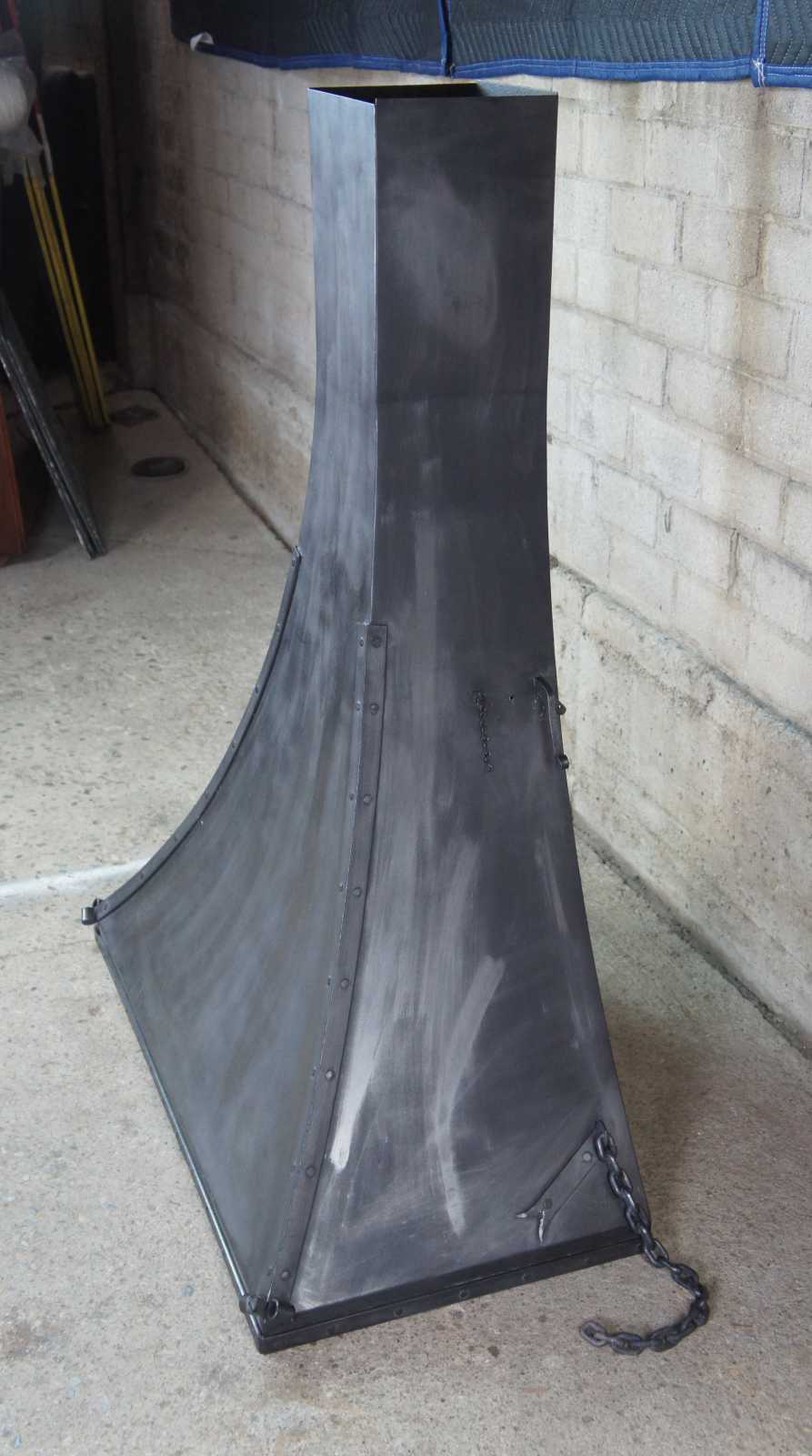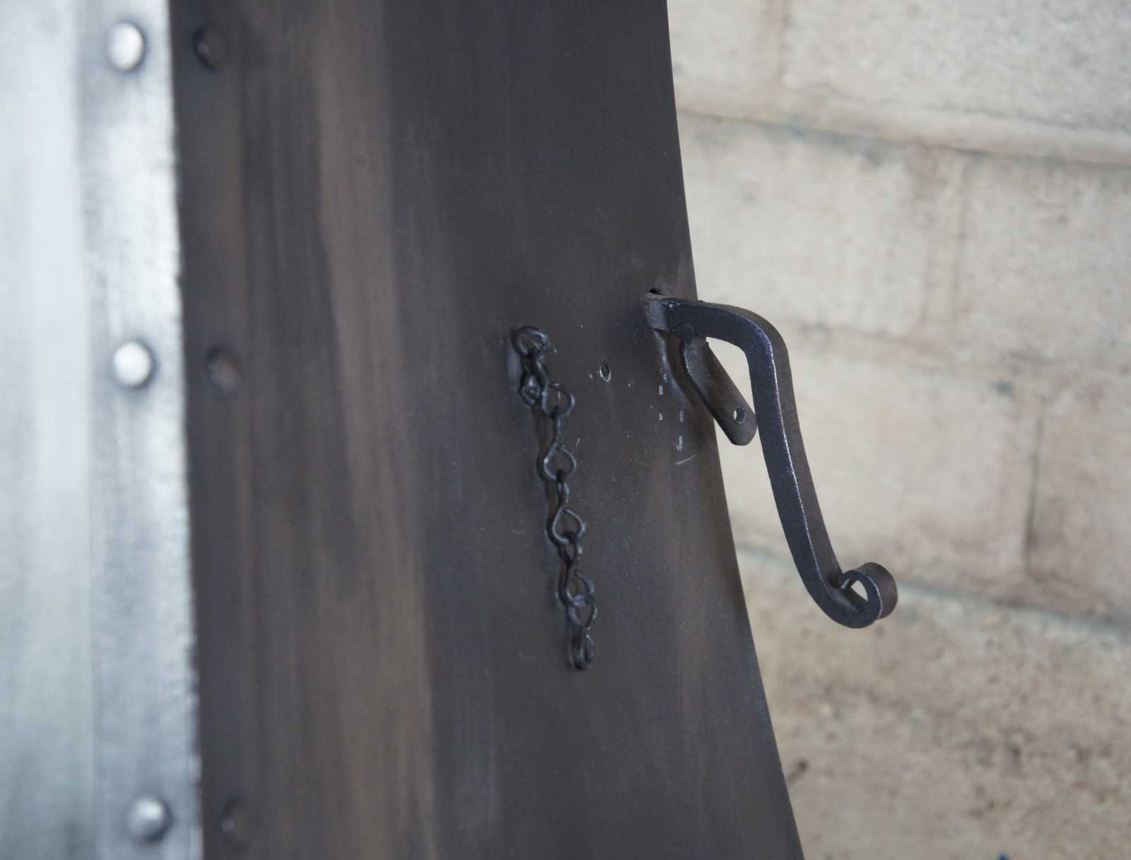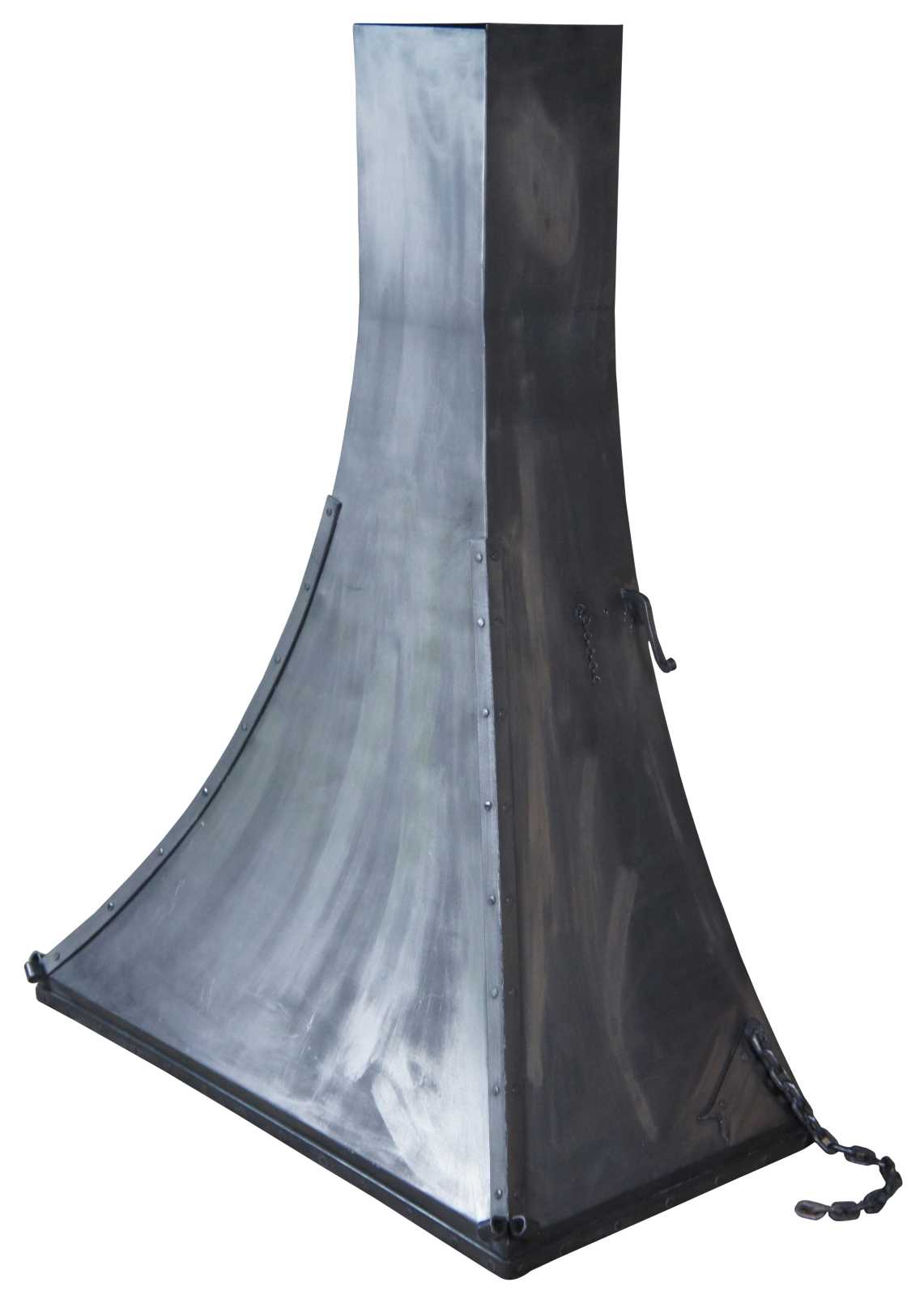 1940s Scottish Arts & Crafts / steampunk / industrial style steel fireplace hooded canopy with internal damper plate operated by a handle on the side, with strap and riveted corners to the front and strap and chain fixings to the rear, a great feature for your basket or fireplace, made in Fife, Scotland, circa 1940.
