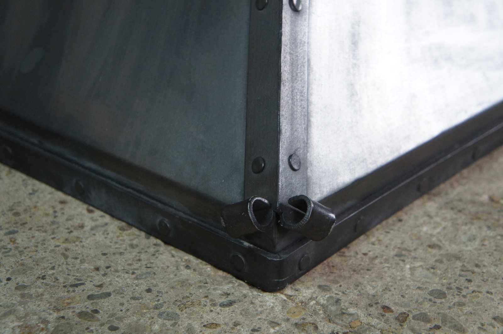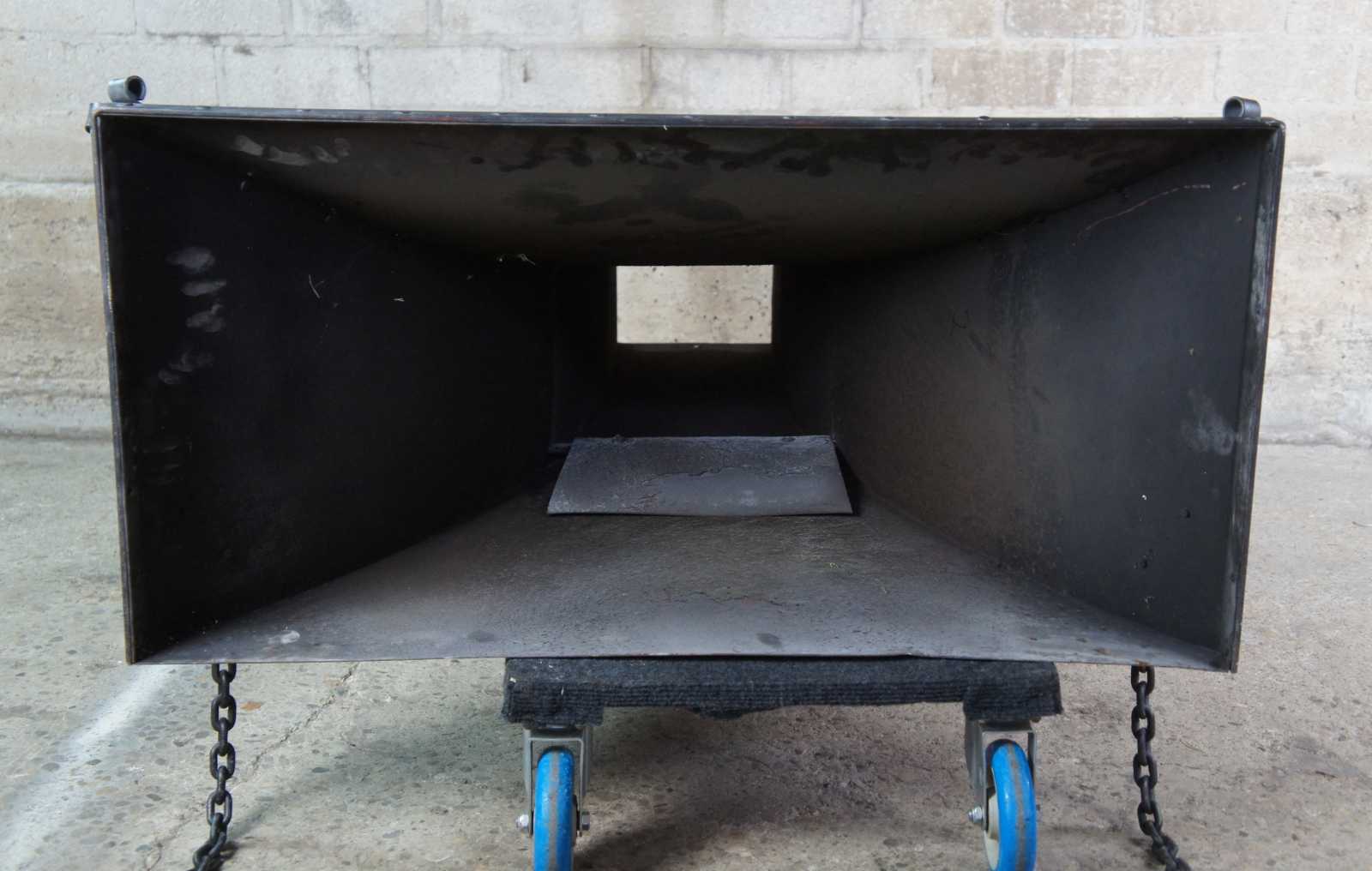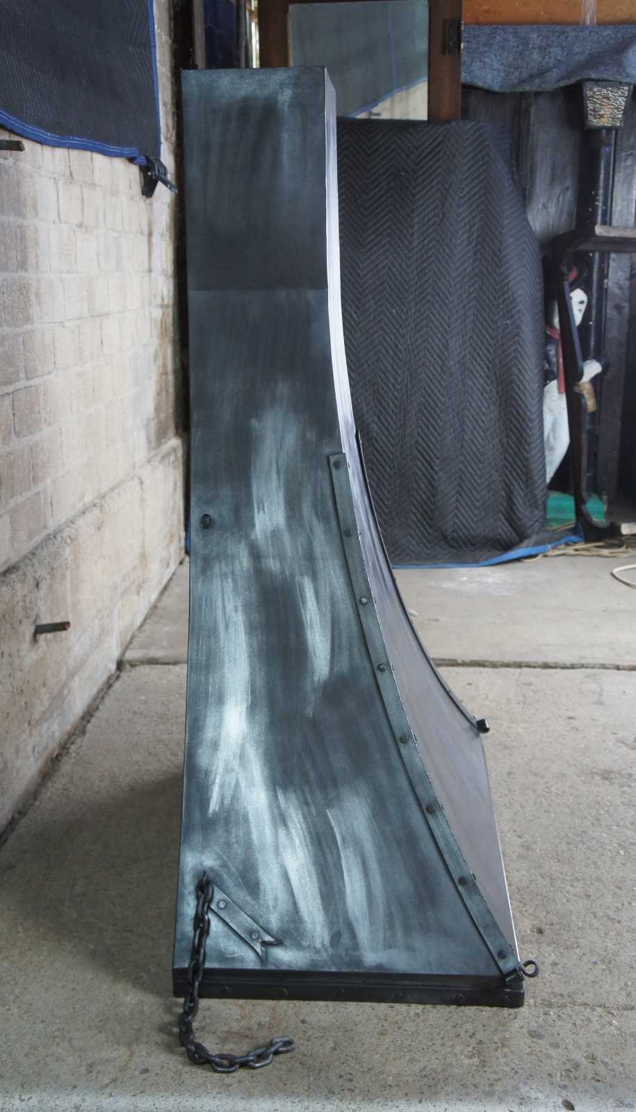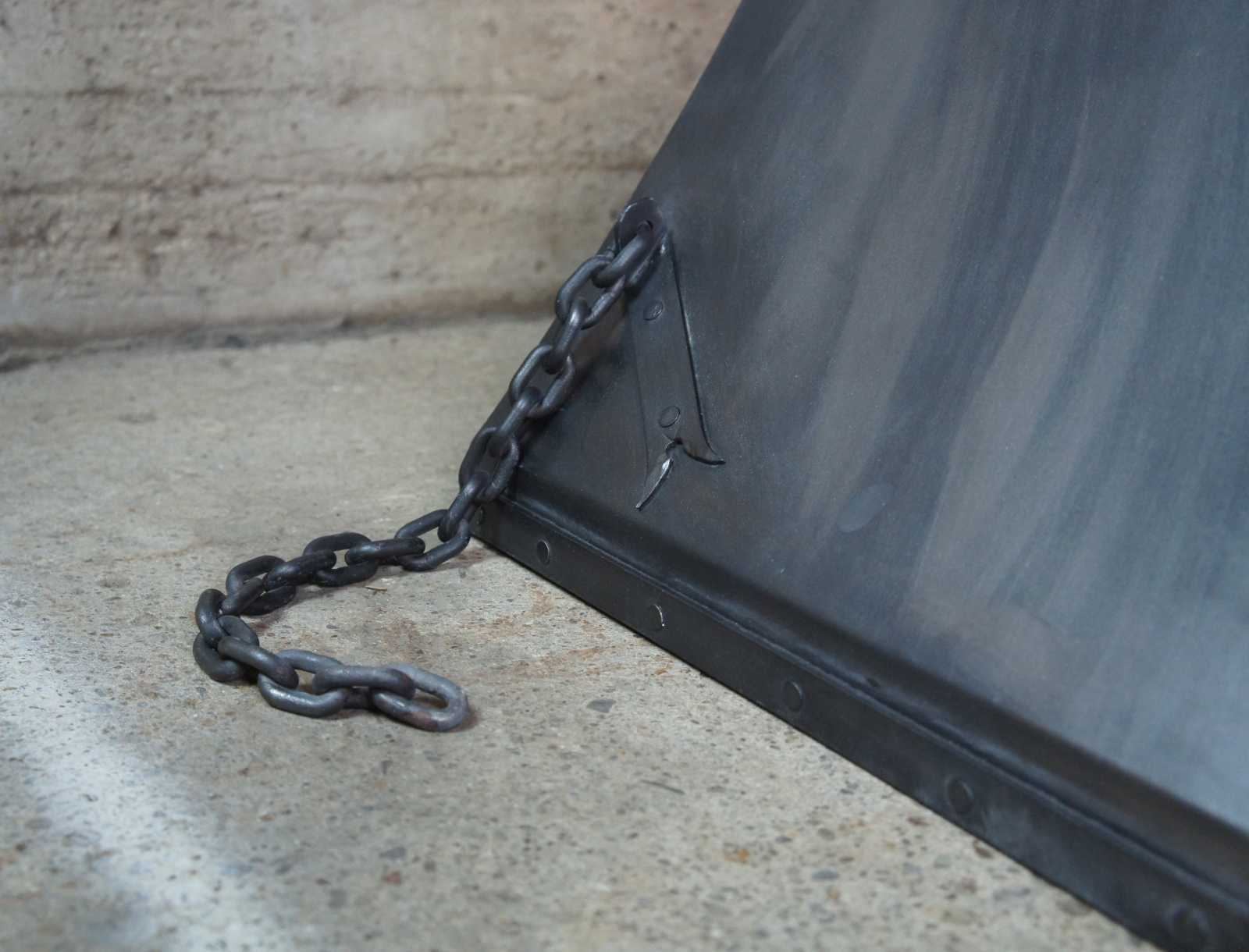 1940s Scottish Arts & Crafts / steampunk / industrial style steel fireplace hooded canopy with internal damper plate operated by a handle on the side, with strap and riveted corners to the front and strap and chain fixings to the rear, a great feature for your basket or fireplace, made in Fife, Scotland, circa 1940.