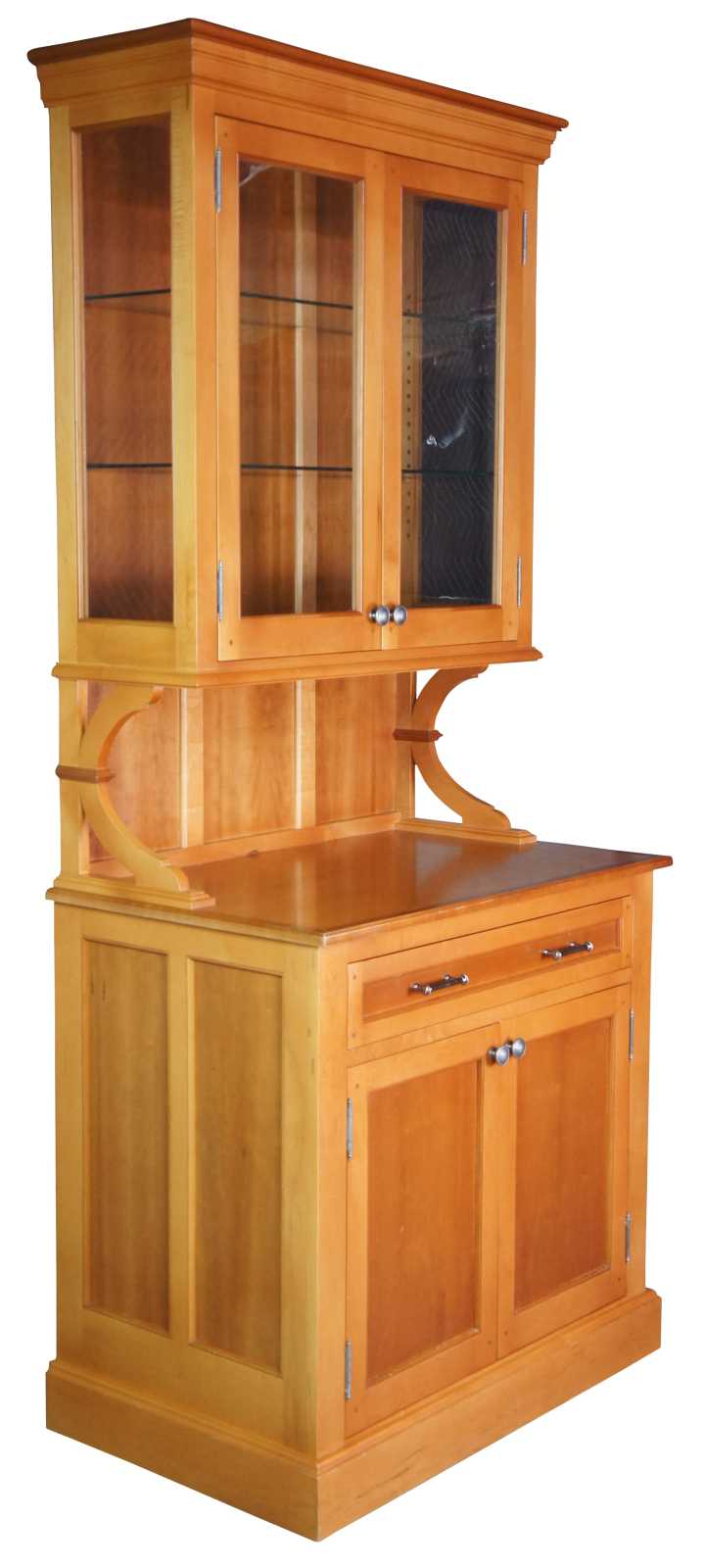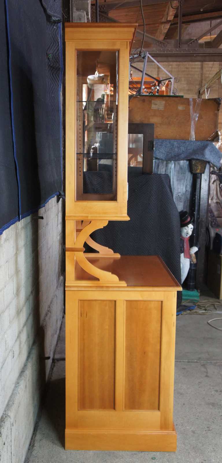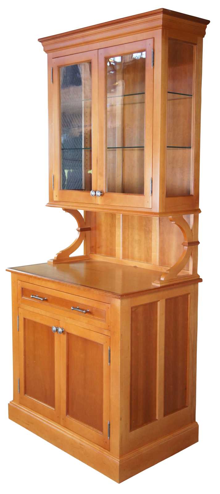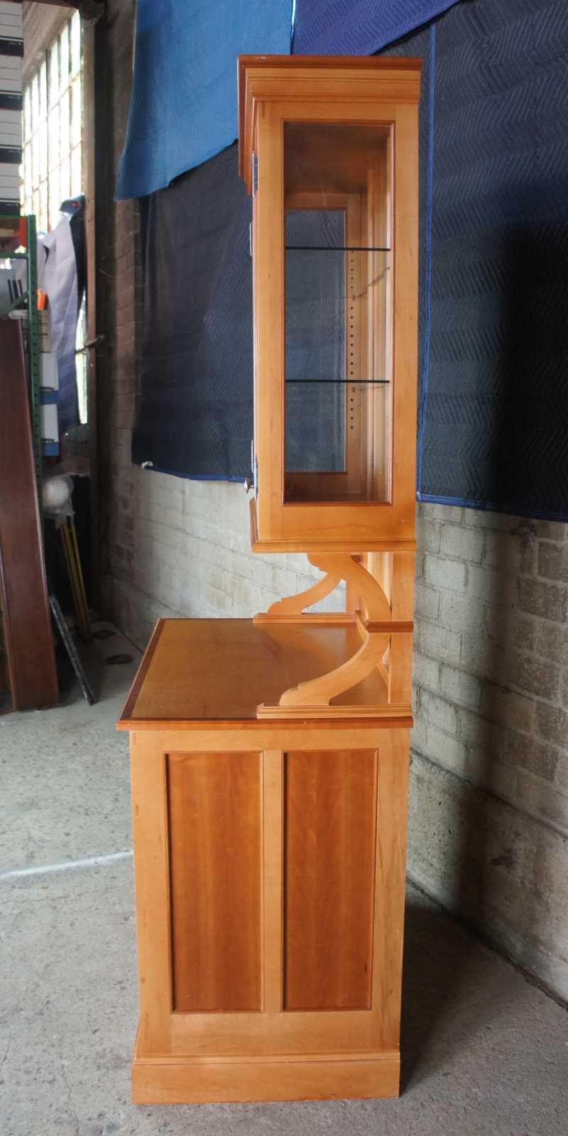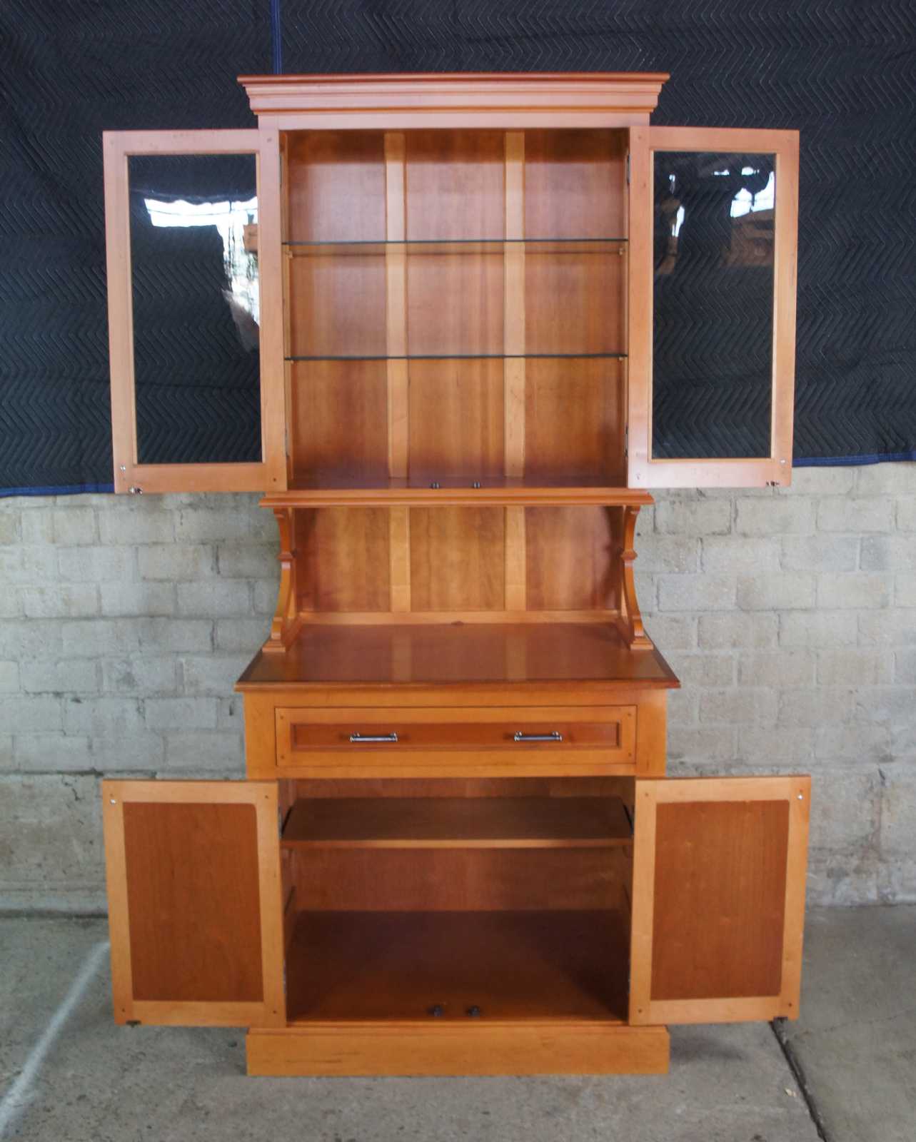Vintage modern hutch, bar back or server. Made of maple featuring one drawer, paneled sides with lower cabinet and upper glass curio or china display. One piece, does not break down.