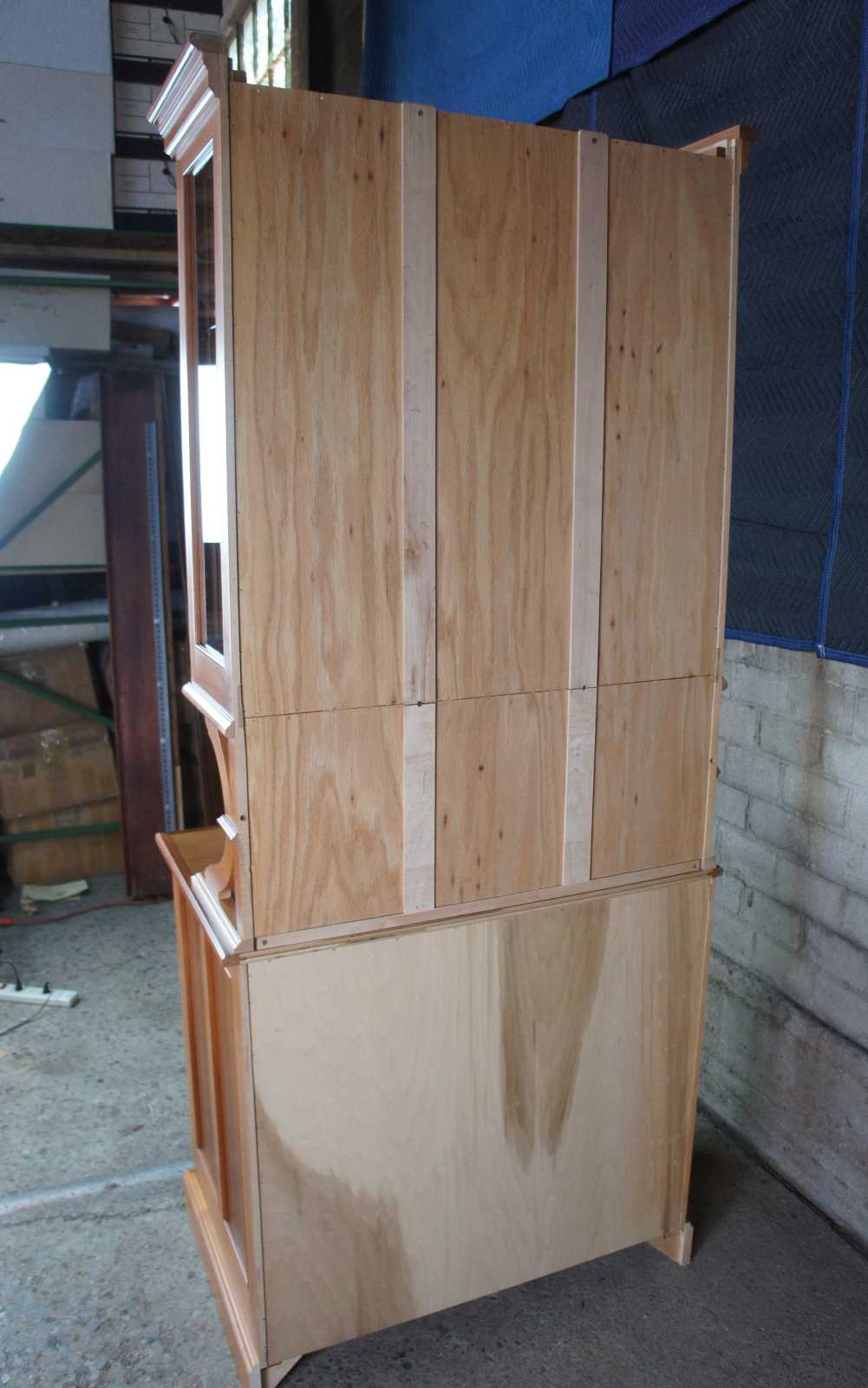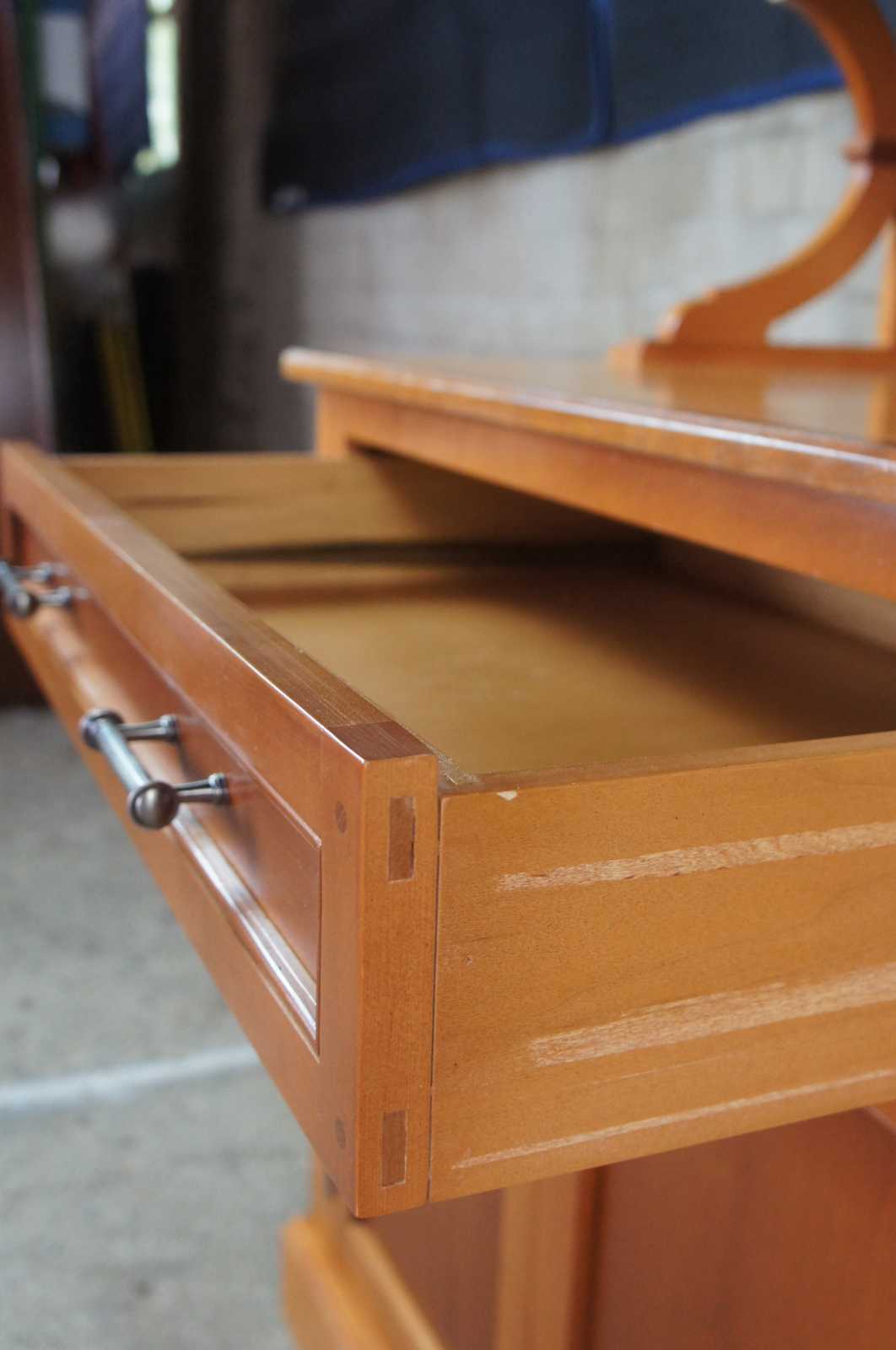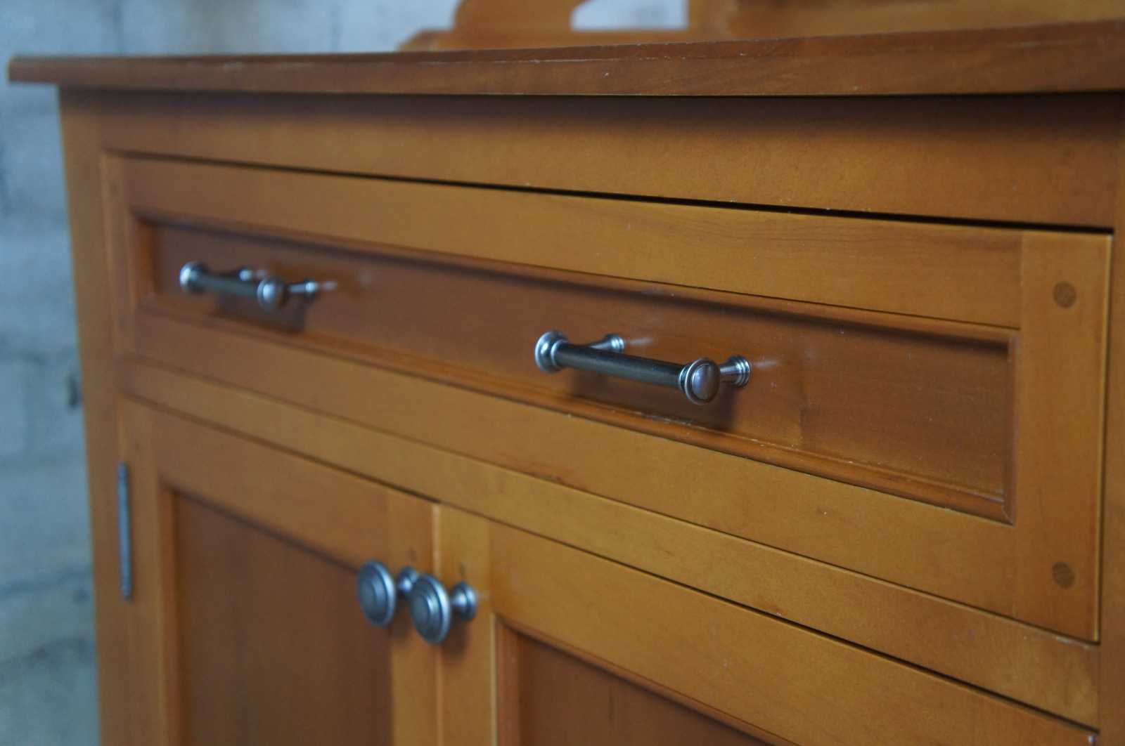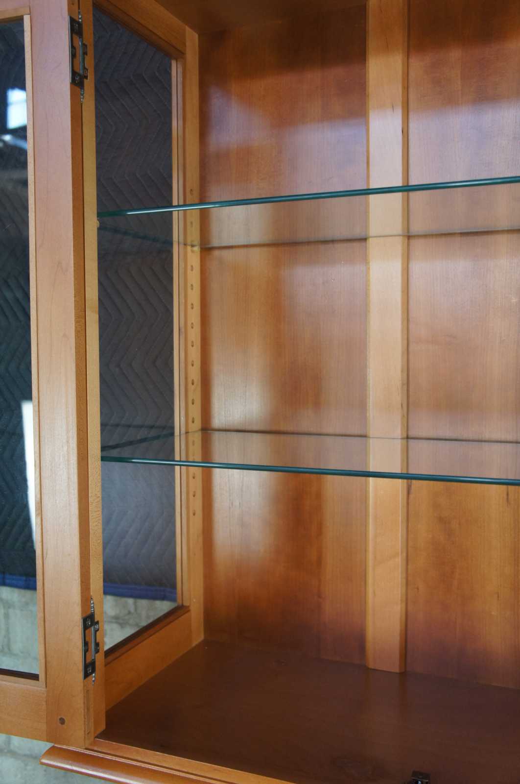 Vintage modern hutch, bar back or server. Made of maple featuring one drawer, paneled sides with lower cabinet and upper glass curio or china display. One piece, does not break down.