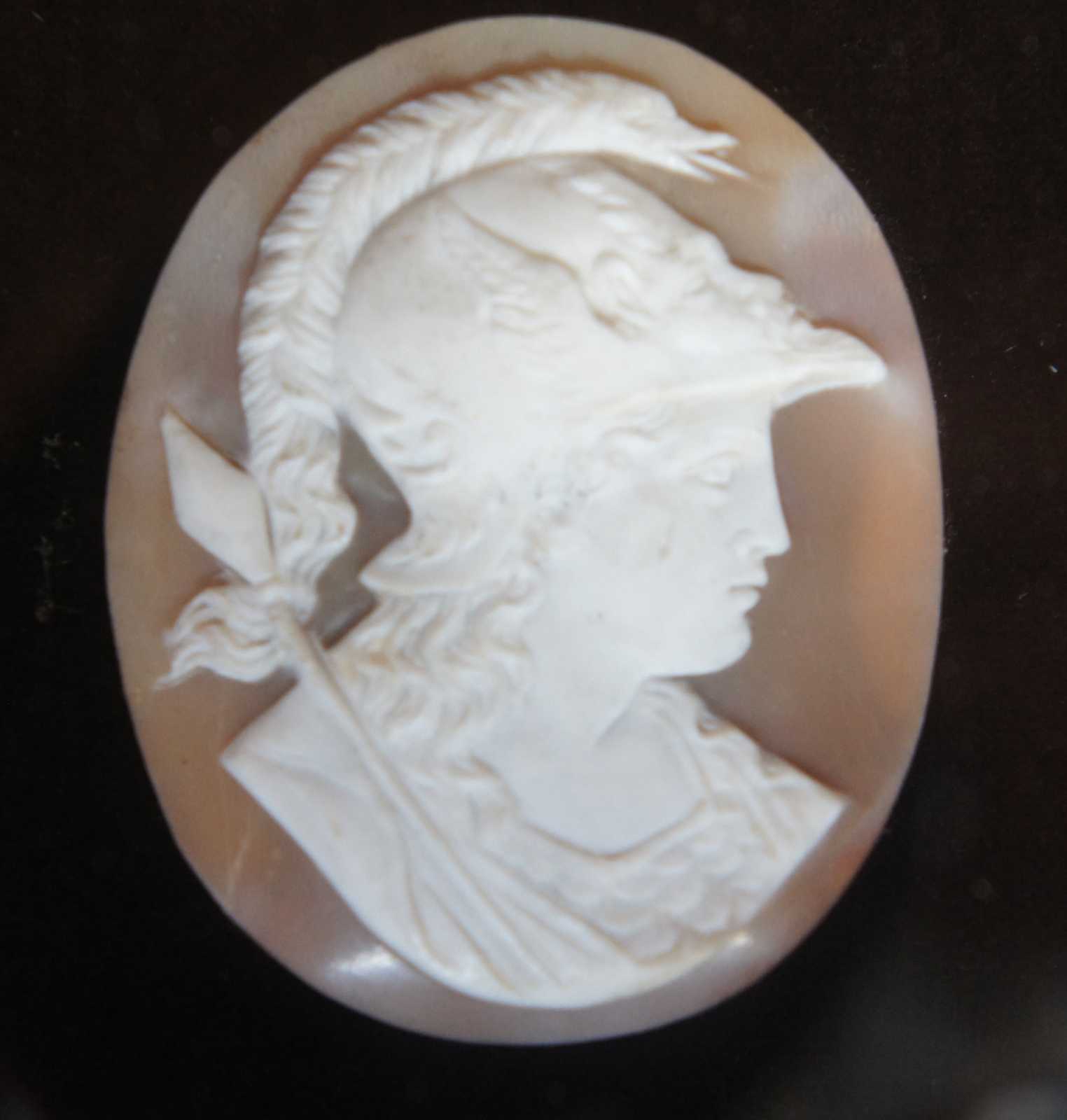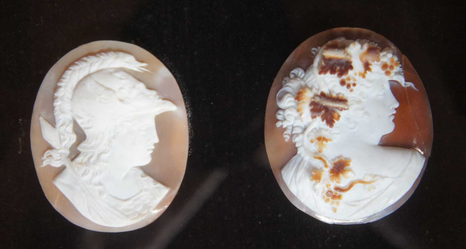 Two antique 19th century carved Cameo shells featuring silhouettes of a man and woman. The woman is adorned with grapes and leaves, while the soldier holds a spear and wears a figural galea helmet with wings and serpent mohawk.