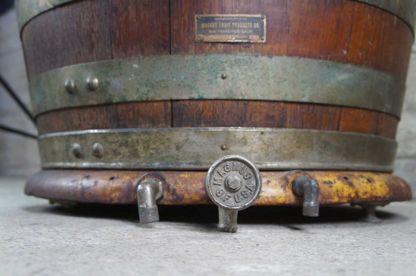 Rare Magnus Root Beer Co. "It's fine in the stein" barrel fountain dispenser or kegerator. Manufactured by the Magnus Fruit Products Co of San Francisco California.