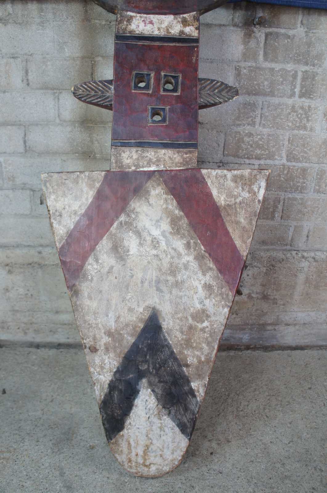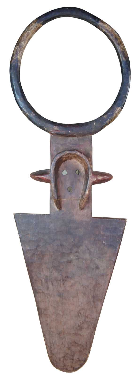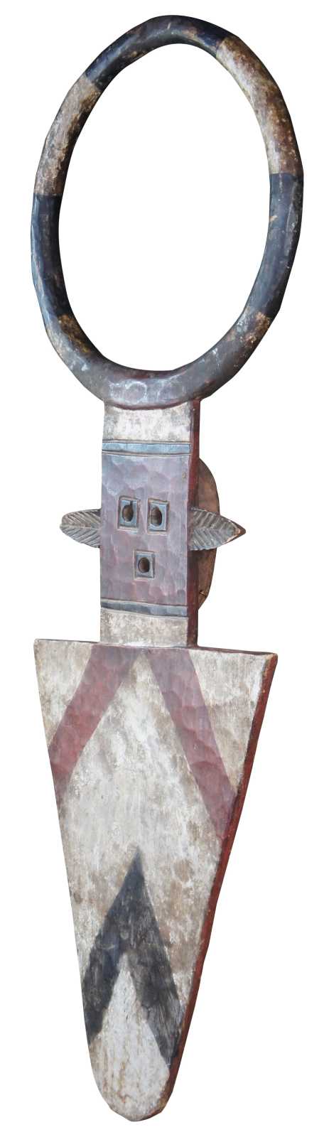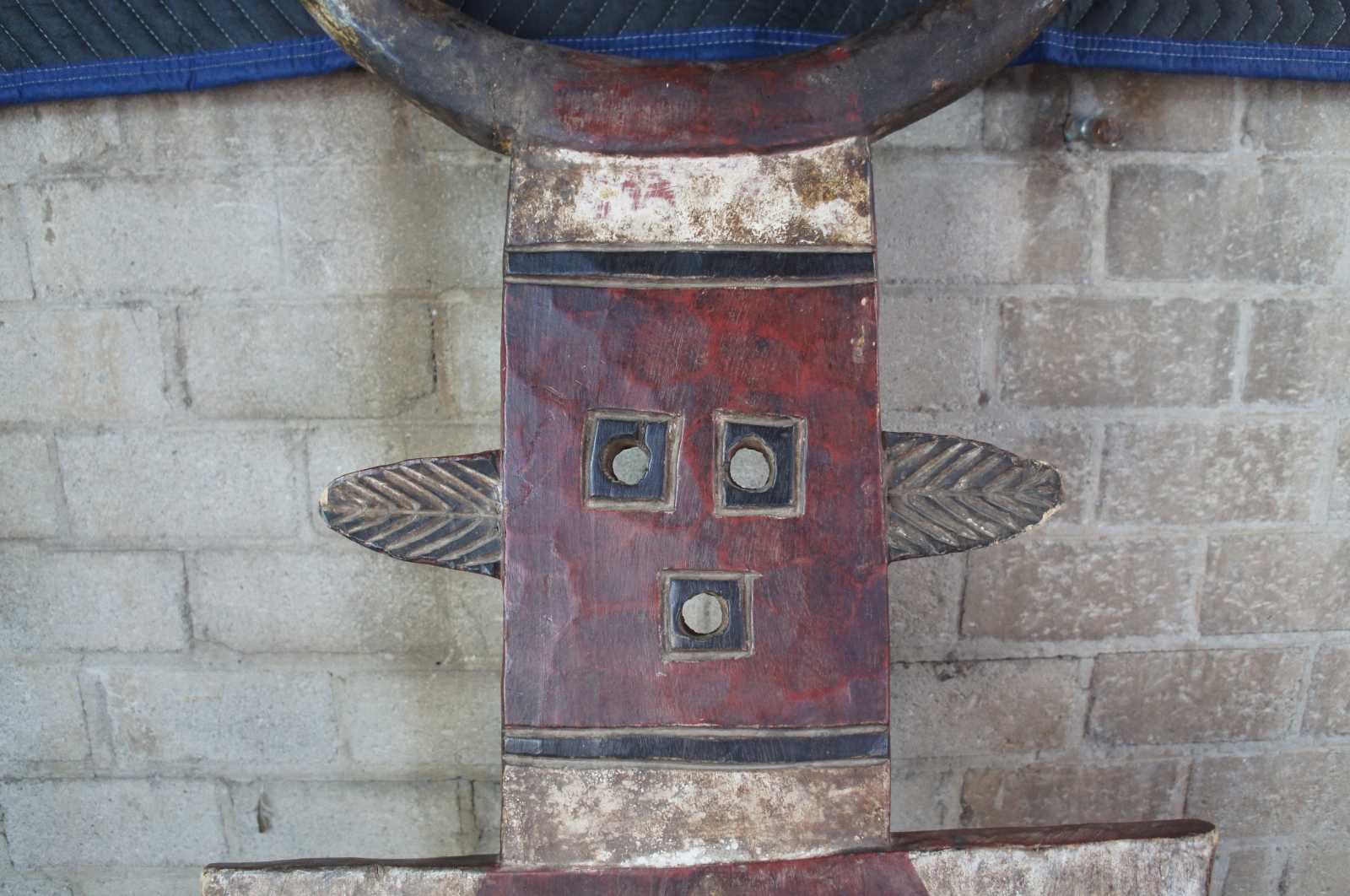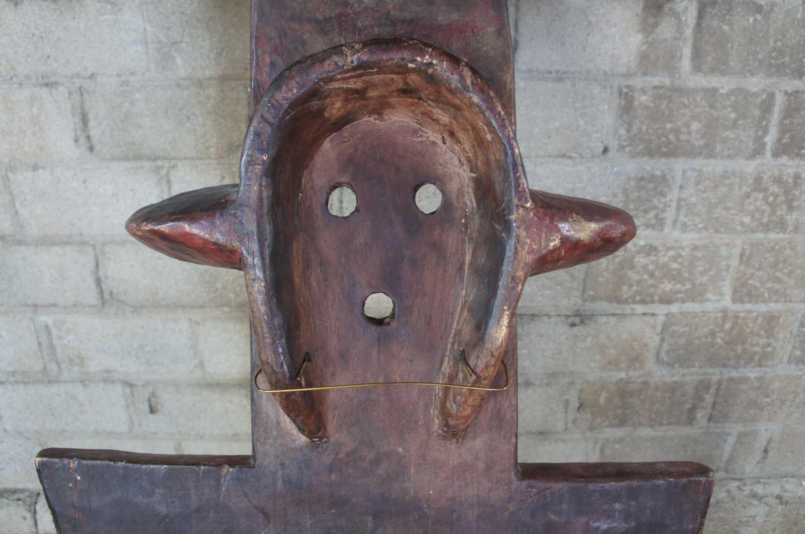 Mid Century carved African Nefana Bedu plank mask sculpture. This wooden plank mask is large and geometrical in form. It was worn over the face with its extremities towering way above the head. The lower part of the mask is spade-shaped and pierced at the center with three holes to allow the wearer to see out and with a third hole for the mouth. Its crest is surmounted by a large circular horn or disk. This group of masks are known as Bedu by the Nafana people who make and use them for ritual use.