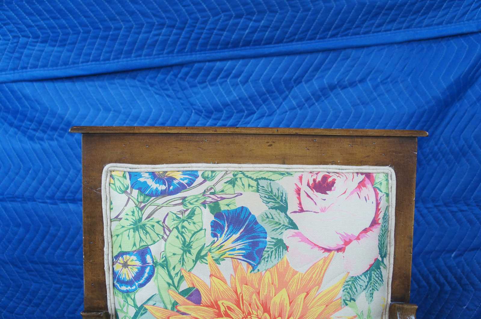 Vintage pair of French Empire or Louis XVI Inspired armchairs by Baker Furniture, circa 1976 . Made of walnut featuring carved floral details with fluted legs, round arms, and vibrant boho floral upholstery.