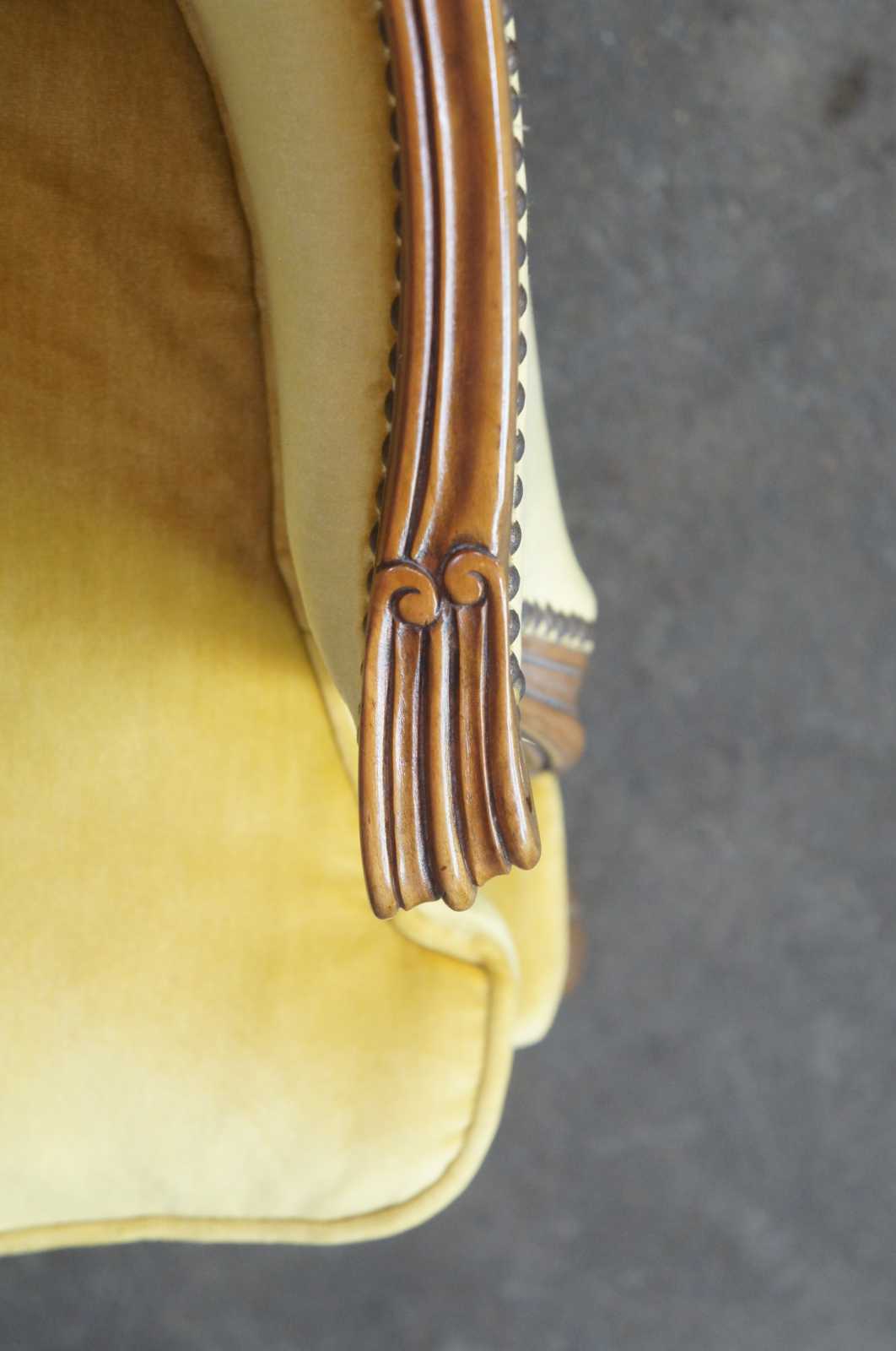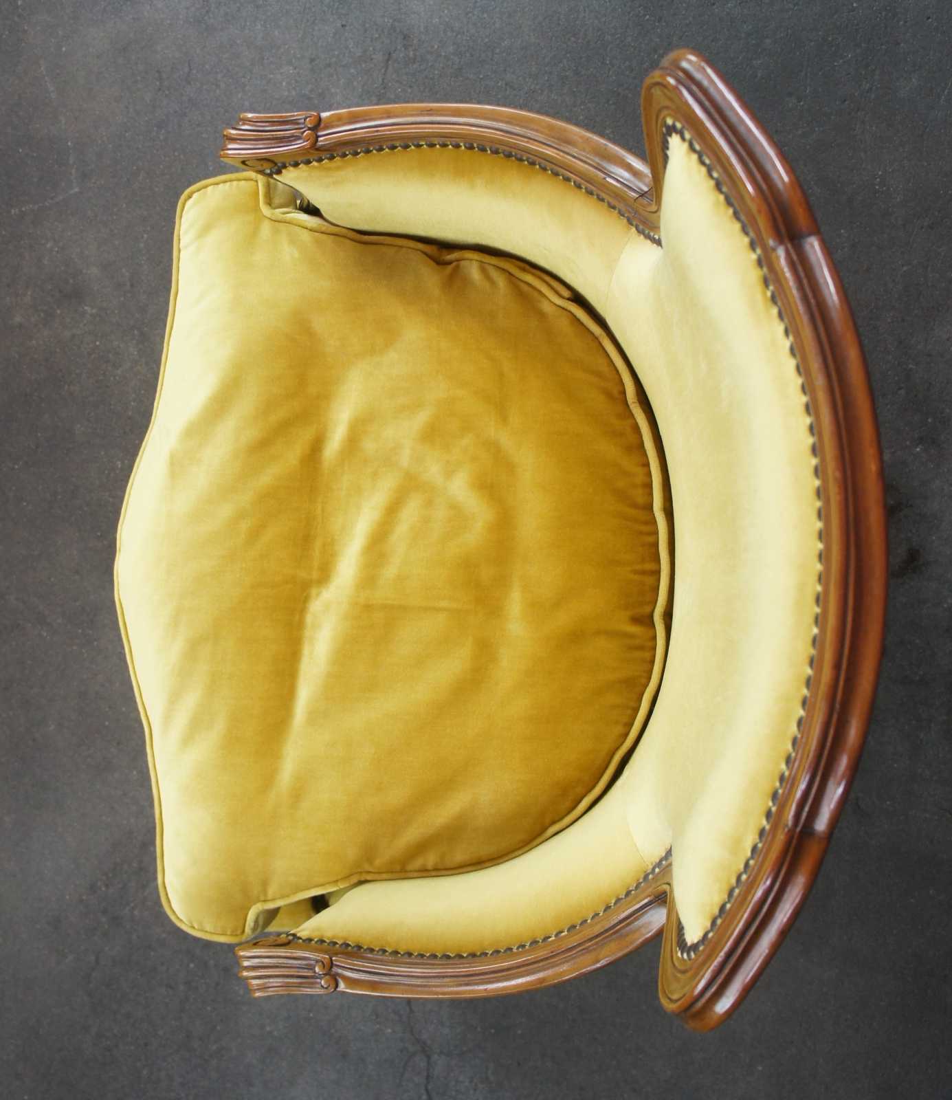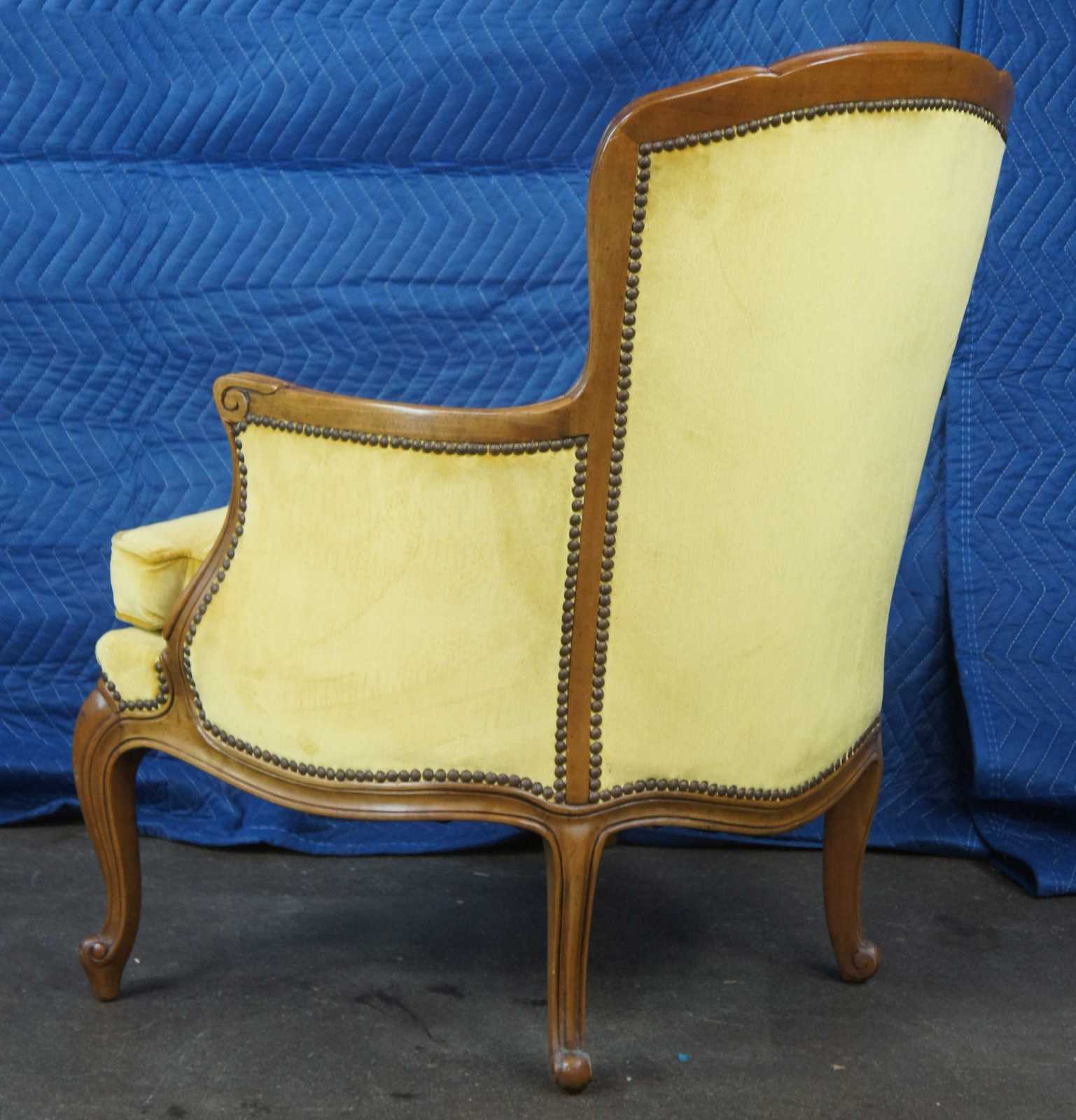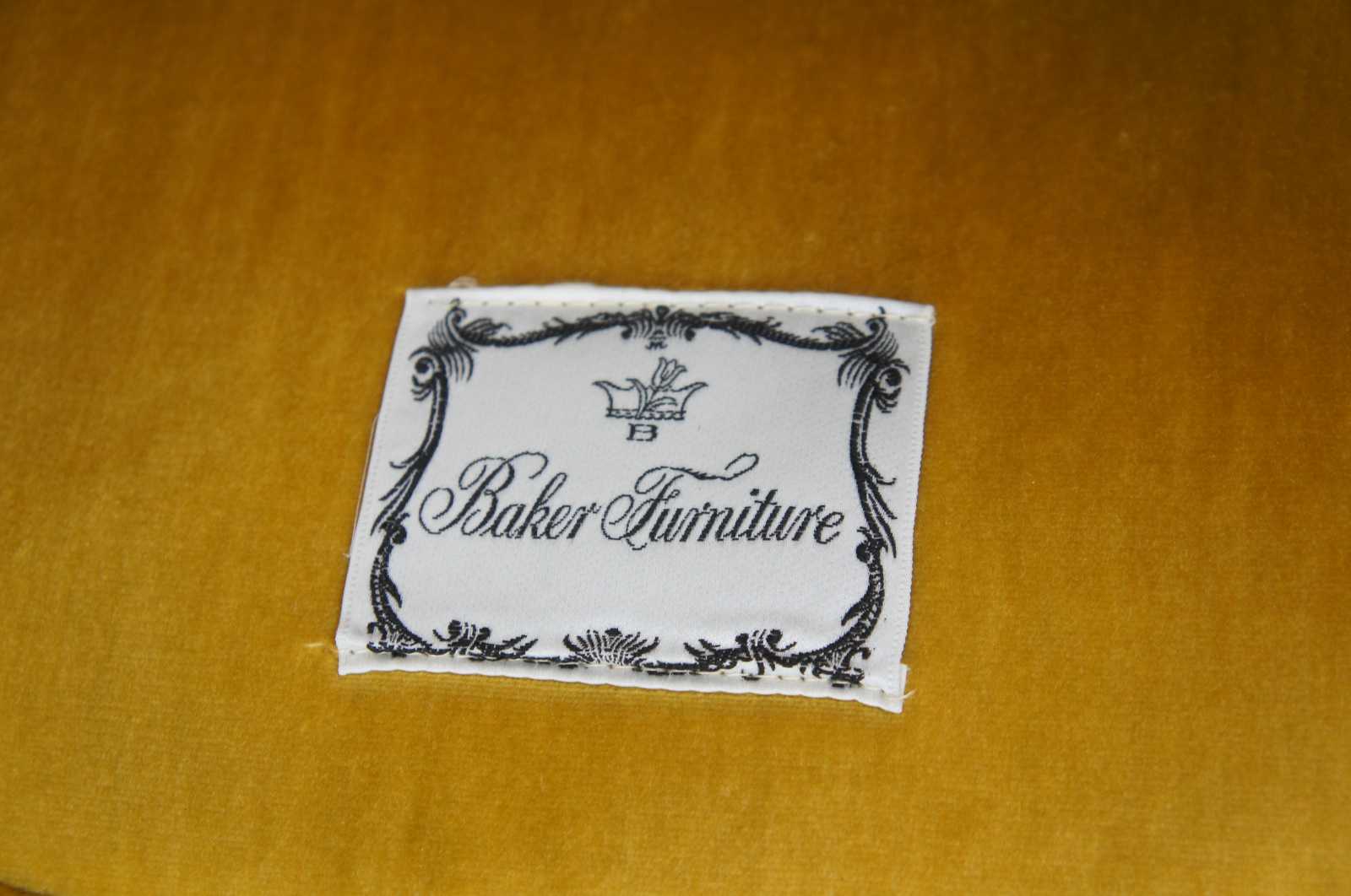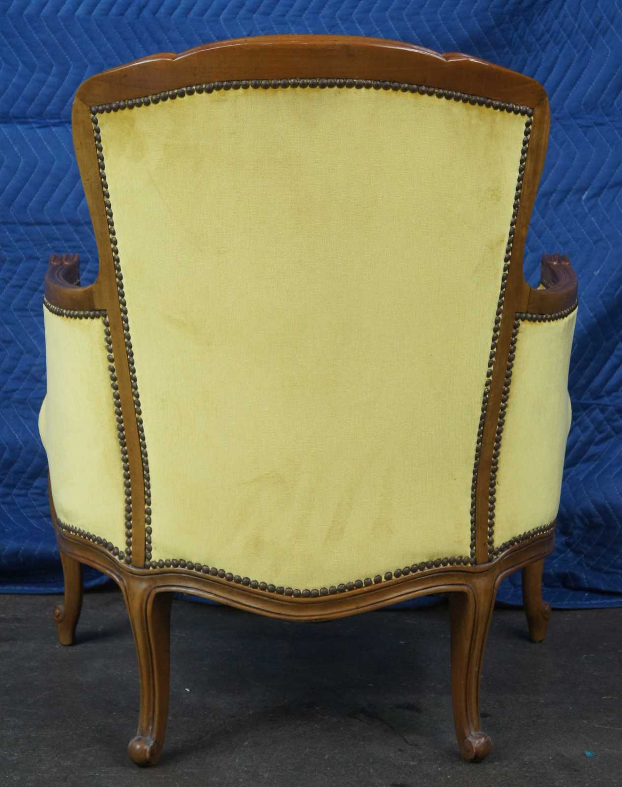 Pair of two vintage Baker Furniture Louis XV Bergere armchairs, circa mid 20th century. Made of walnut featuring serpentine form with velvet upholstery, nailhead trim and cabriole legs.