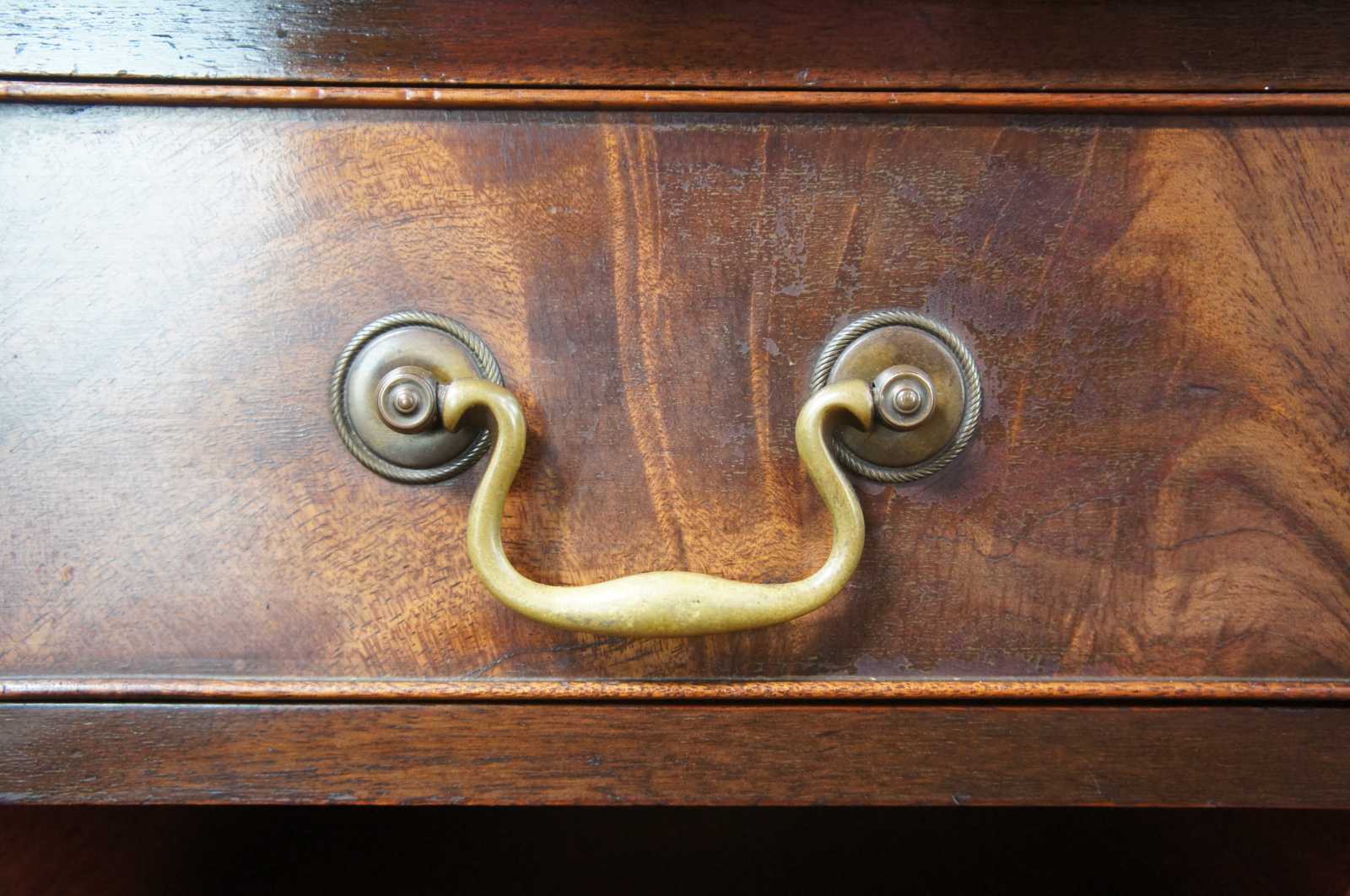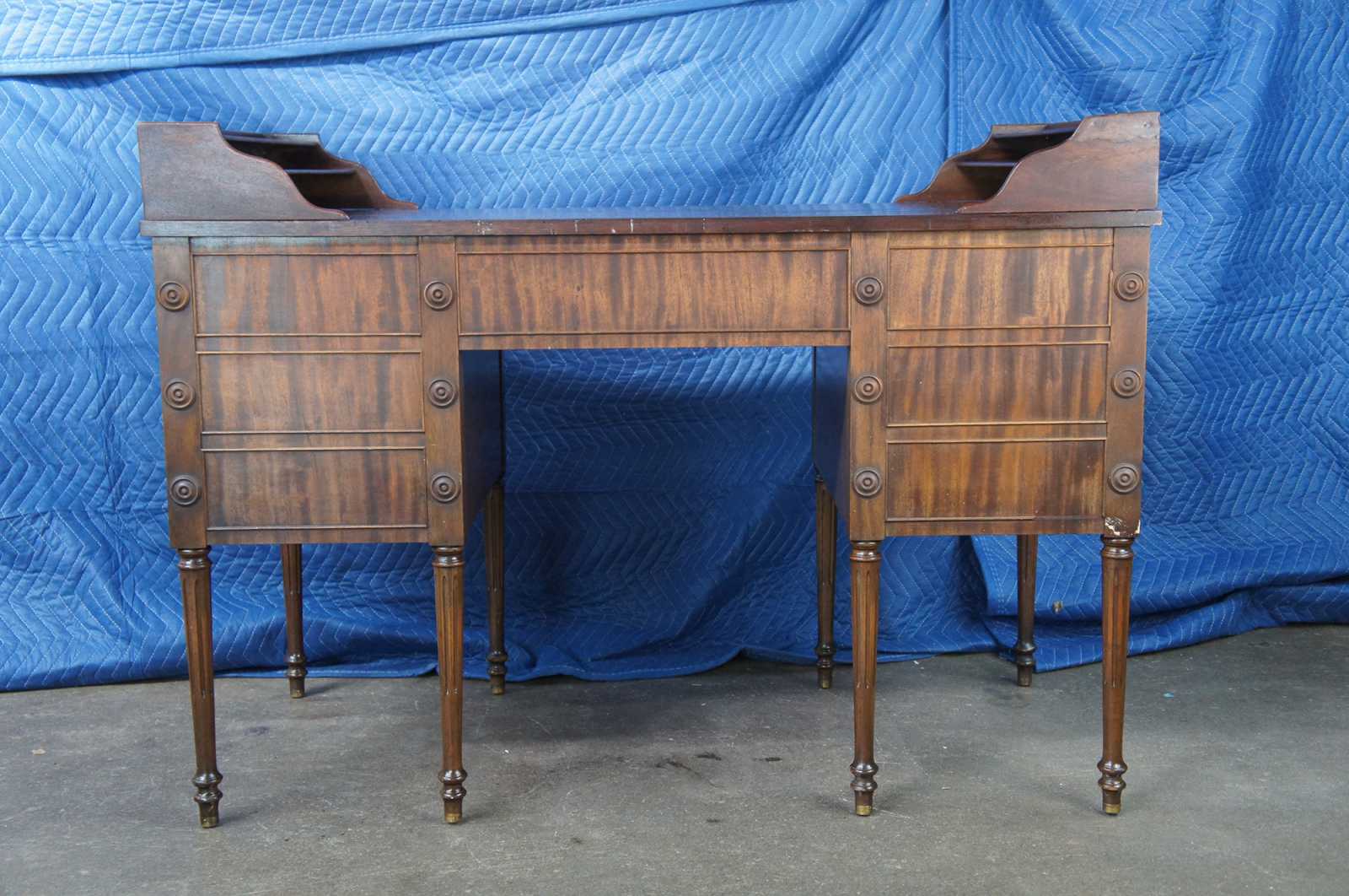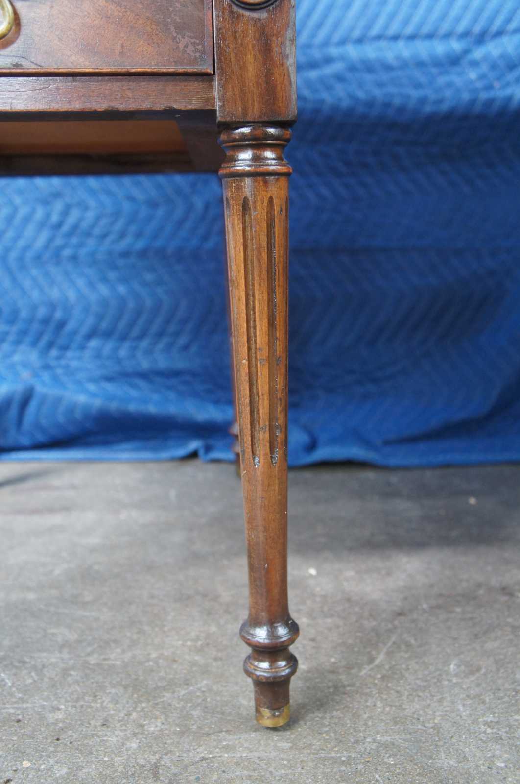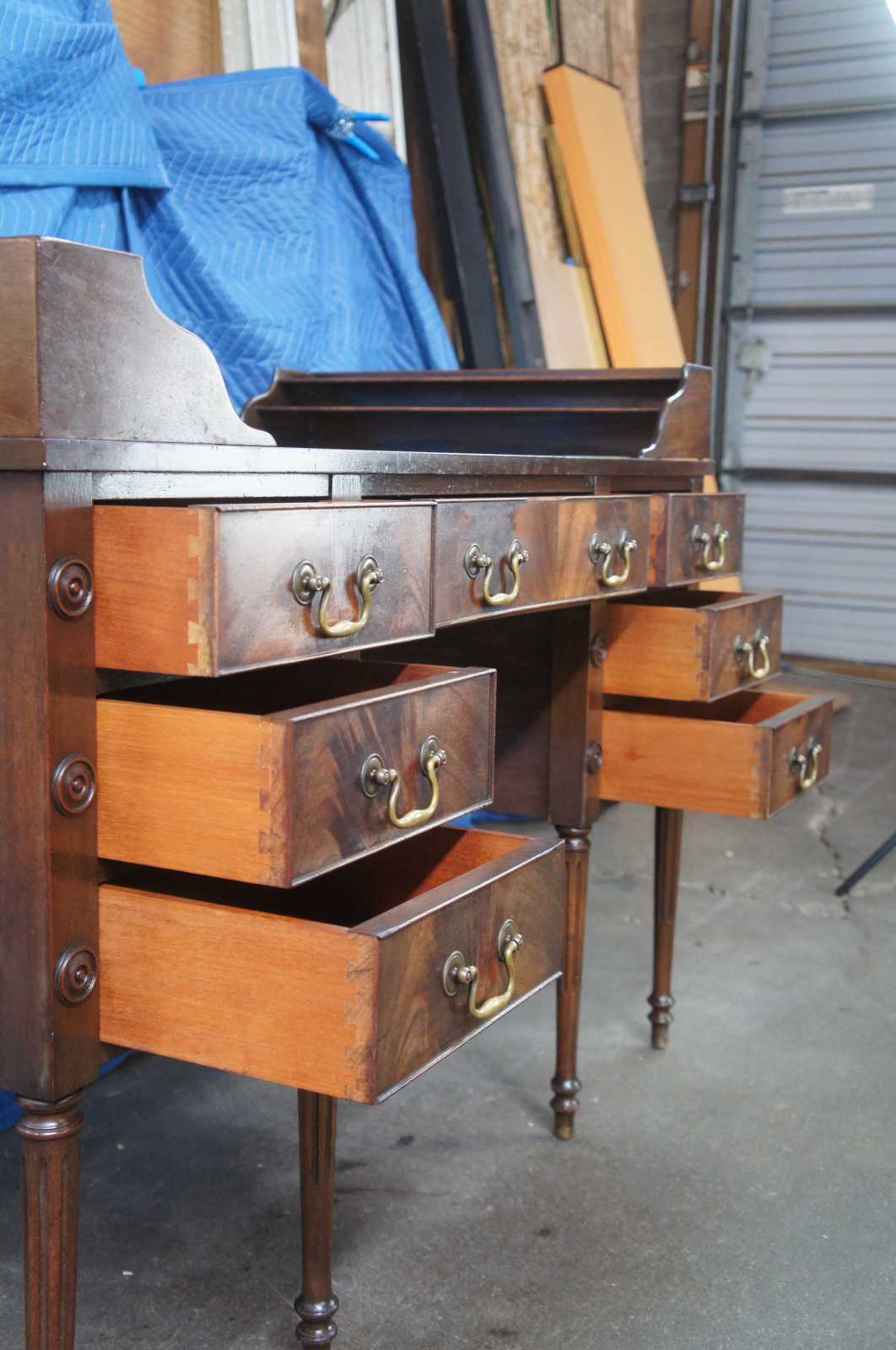 Colonial Manufacturing Company solid mahogany "George Washington" writing table. A rectangular form fashioned after Sheraton styling. Made from mahogany with crotch or flame mahogany veneer drawer fronts. Features seven drawers, brass bail hardware, ornamental medallions and removable letter holders. The desk is supported by 8 turned, fluted and tapered legs leading to brass capped arrow feet.
