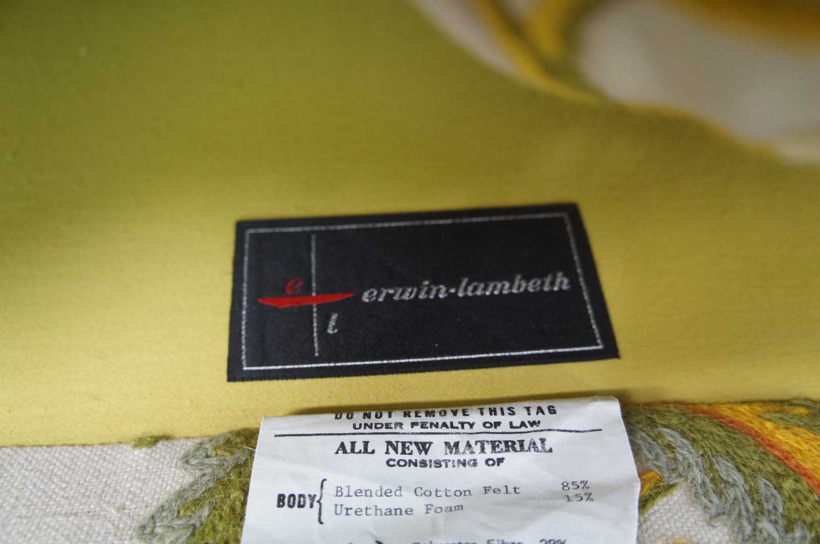 Pair of two mid century modern Erwin Lambeth sofas, settees, love seats or couches, circa 1970s. Made with a Crewel upholstery featuring floral motif with greens, yellows, beige and orange.