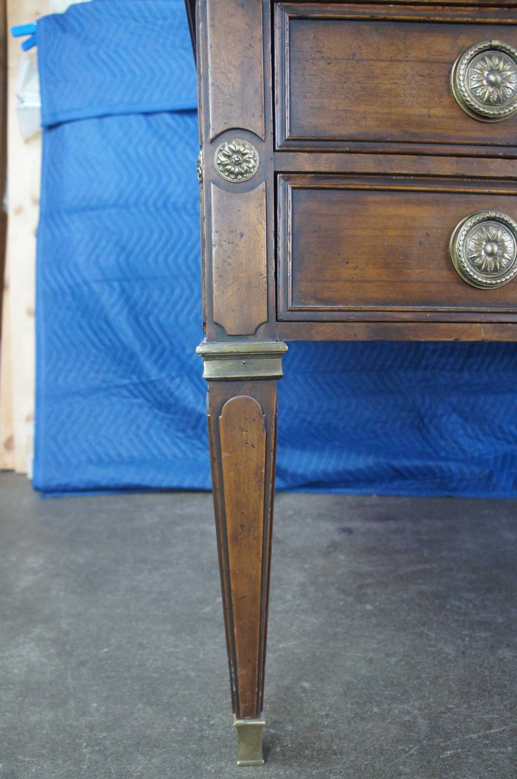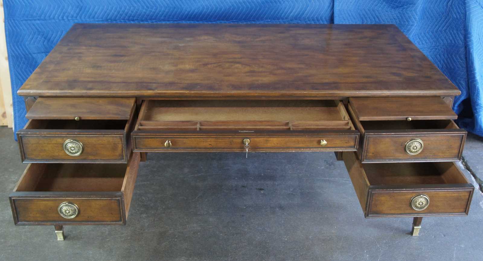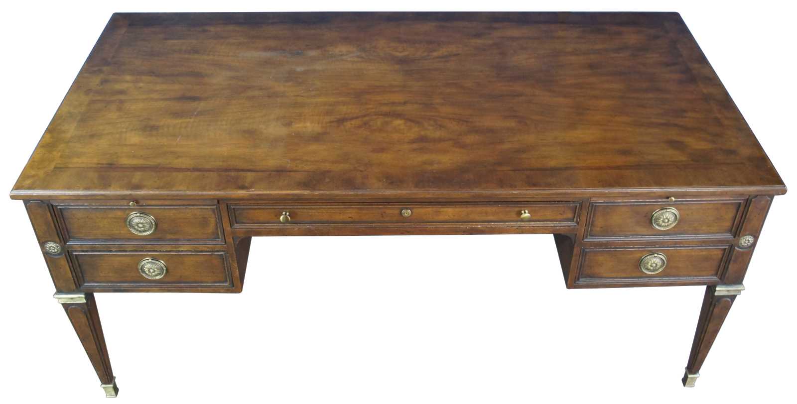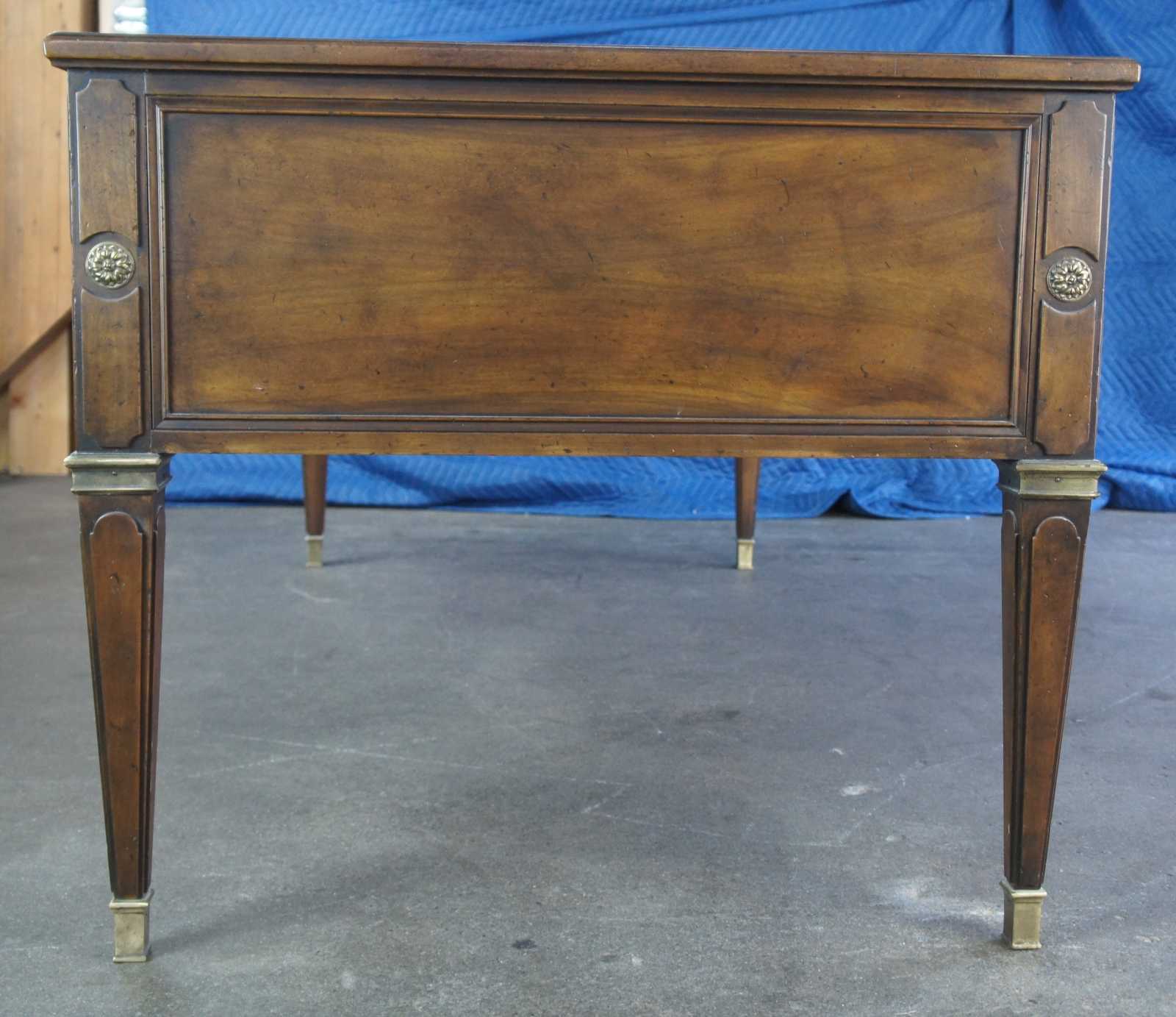 Stately writing table or library desk made by Baker Furniture Company. Constructed from enriched warming walnut in the neoclassical French Louis XVI taste. The case features a bookmatch walnut crafted top with ormolu mounts. The desk is supported by square tapered and paneled legs with brass capped feet. The front of the case has five large storage drawers mounted with exceptionally crafted french knocker drawer pulls. Each side has large 18 inch writing pull outs. The back side has a large 32 inch pullout for an added writing table. Finished on all sides with a lovely profile. Excellent joinery and craftsmanship.
