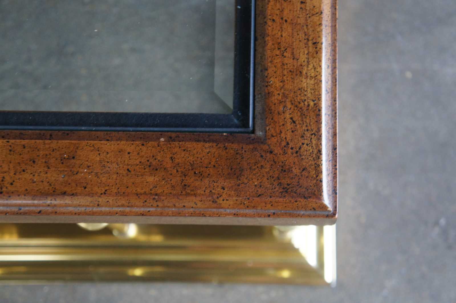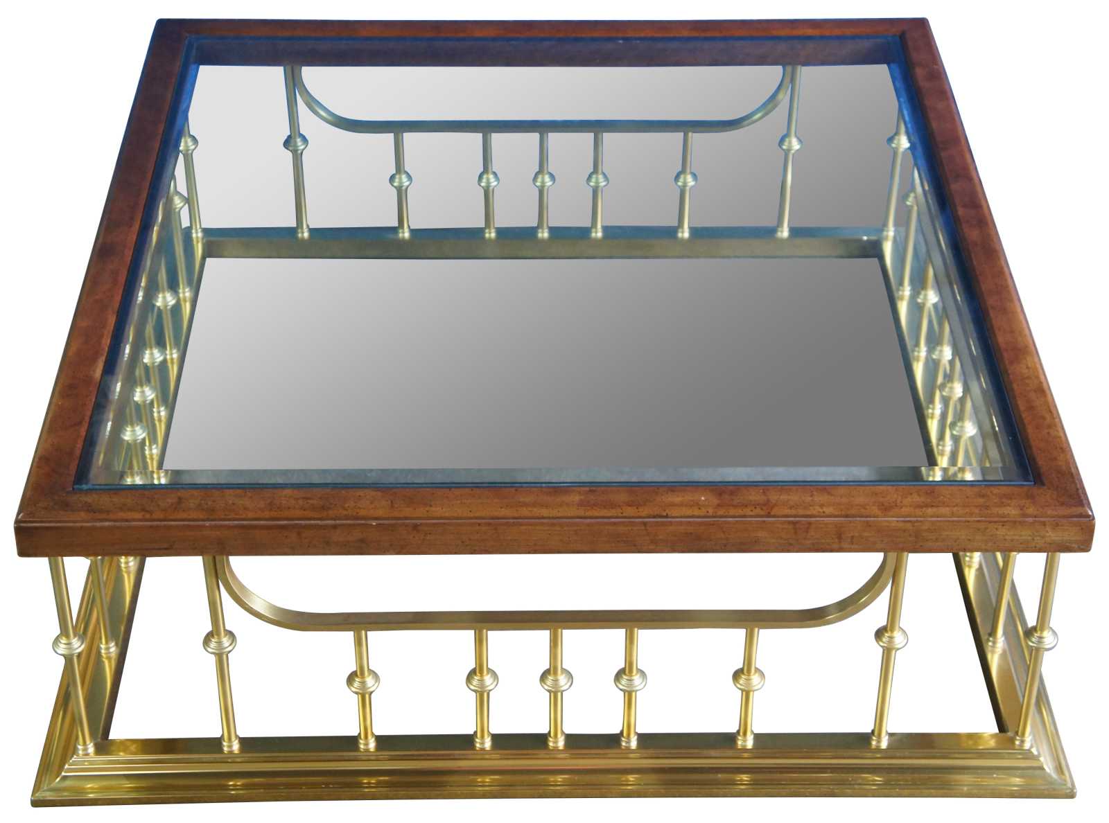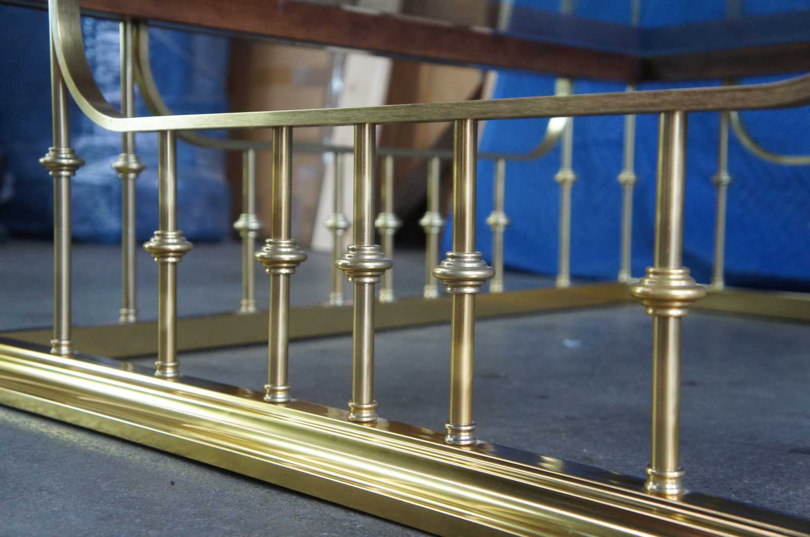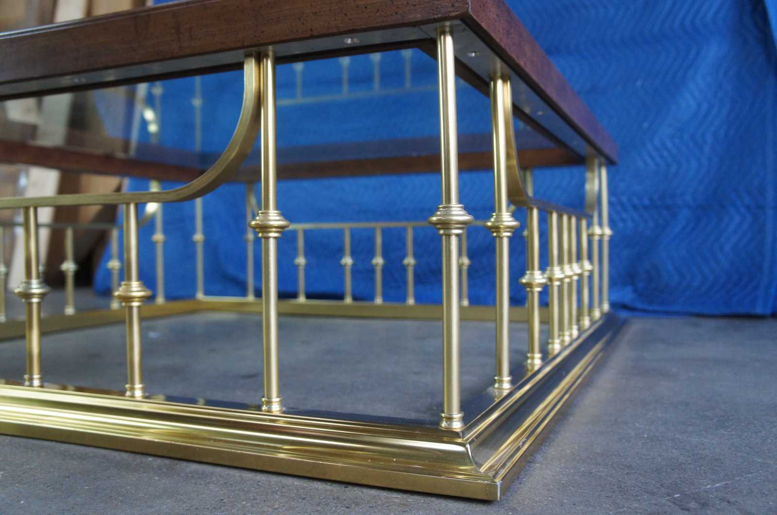 Erwin Lambeth walnut, brass and glass library or study coffee table featuring a fireplace fender style gallery base. Circa 1970s.