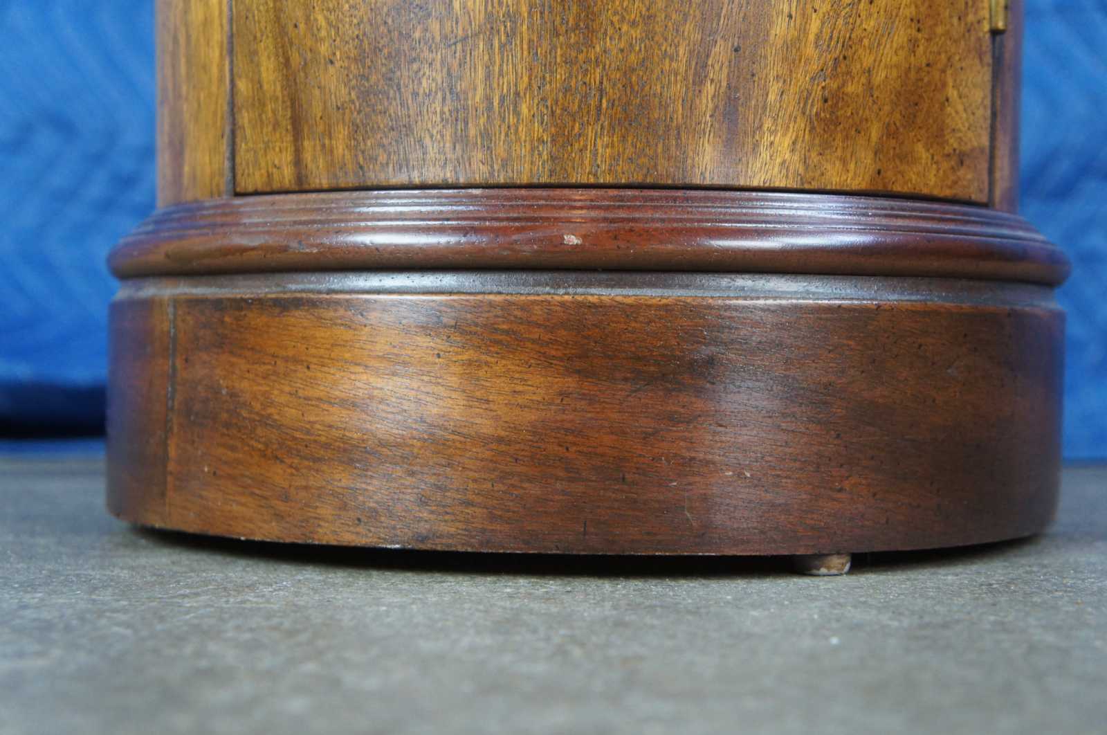 Mid Century 20th Century Louis Phillipe, Empire or Napoleon inspired ""Somno"" Table. Cylindrical modern form made from mahogany with hinged door, marble insert, and brass pull. The petite form makes it perfect for use as a pedestal, smoke stand or for displaying a sculpture. Meaning sleep in Latin 'Somno' Tables were originally intended as furniture for the bedchamber, now, however, they have acquired a versatile role and could be used as a side table or act as an elegant base for a statue in the centre of a room or corridor.