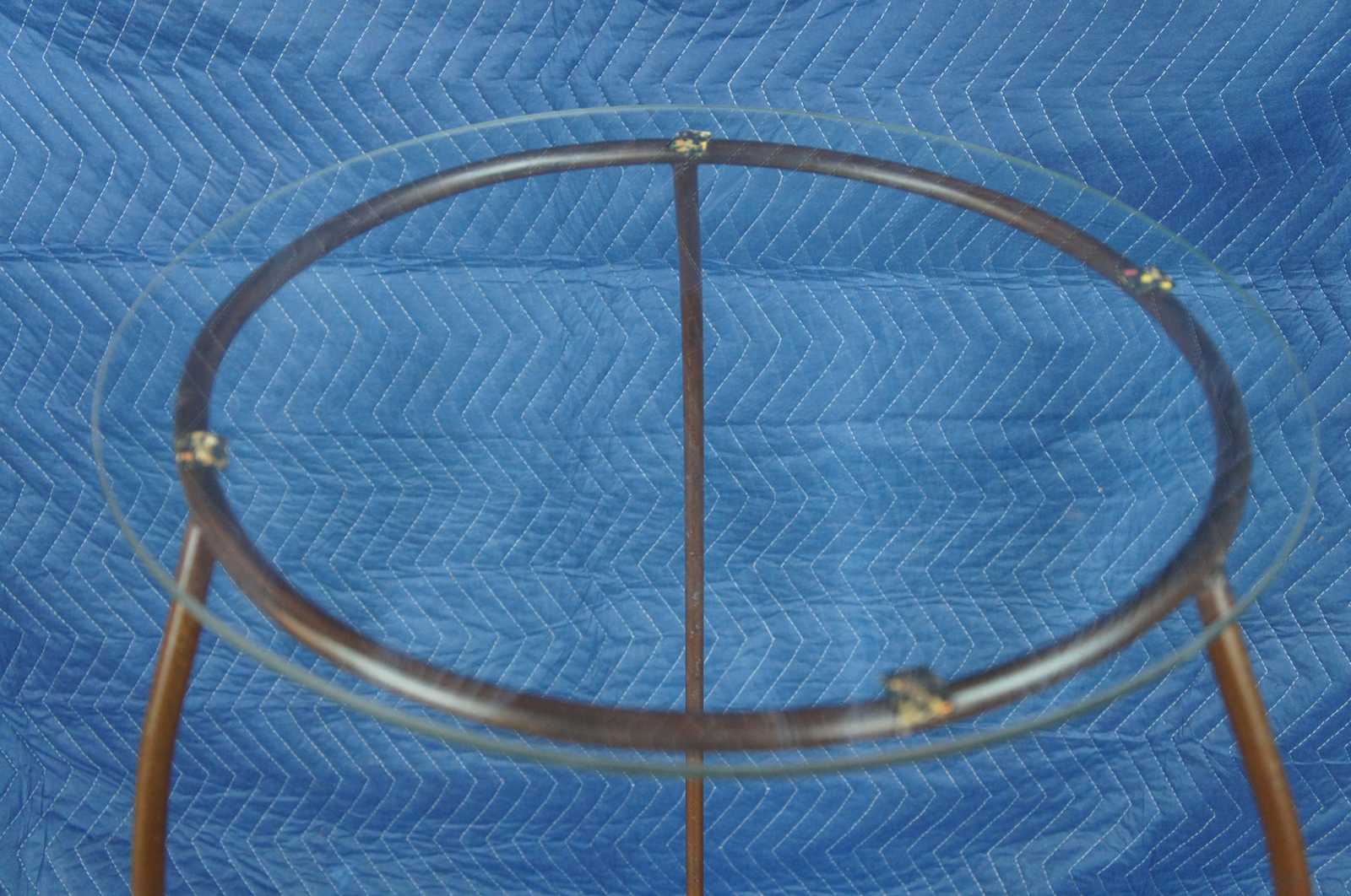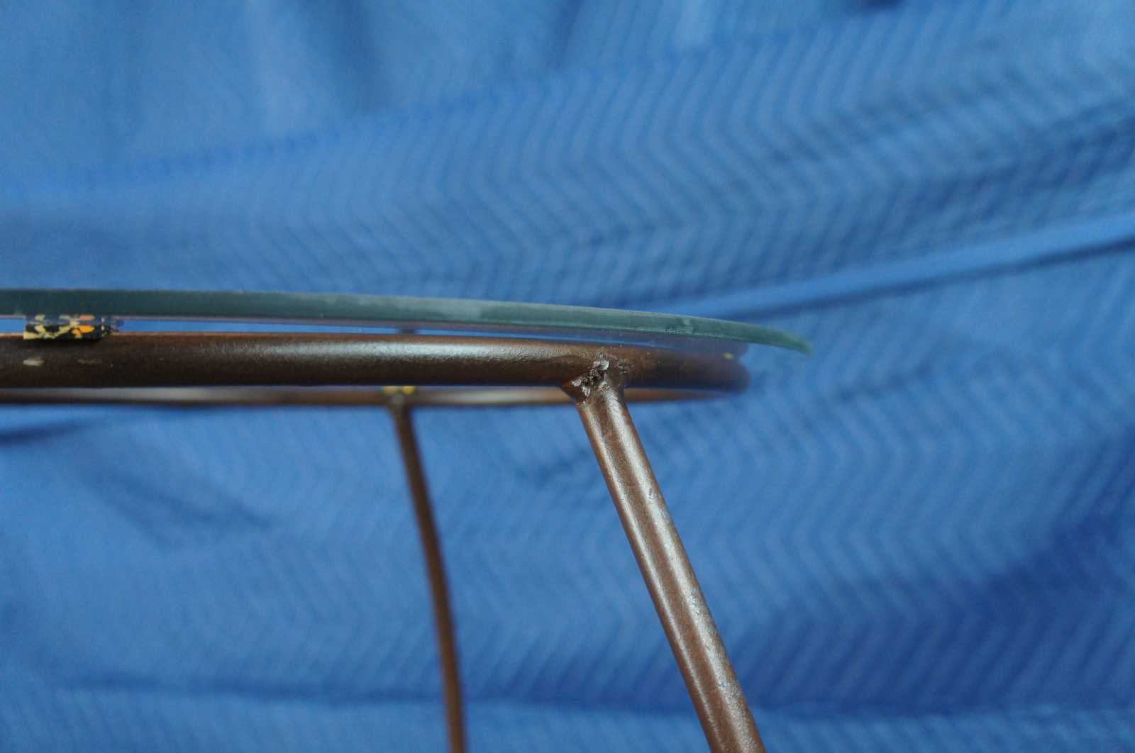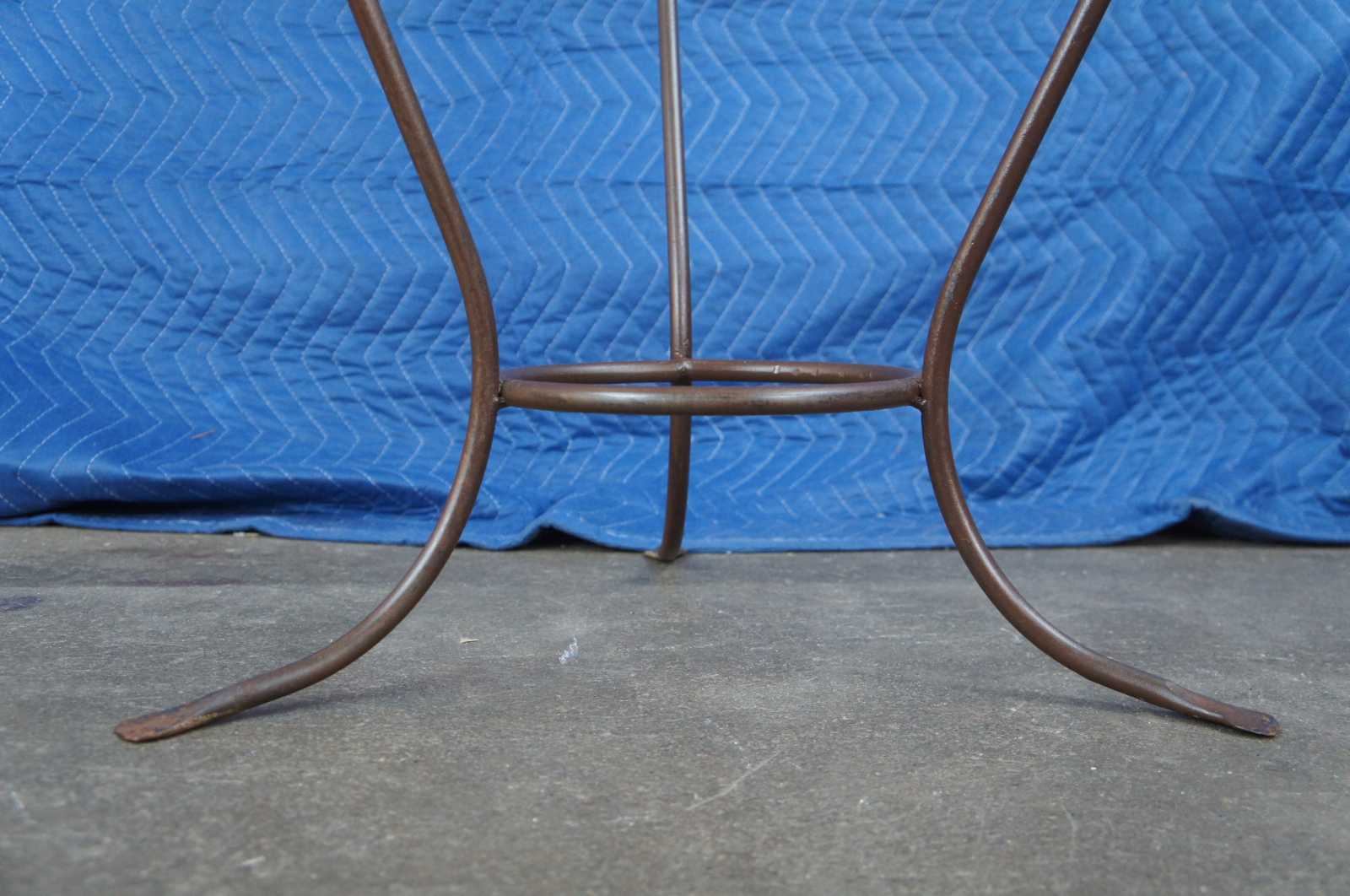 Vintage wrought iron plant stand featuring serpentine form with round glass top.