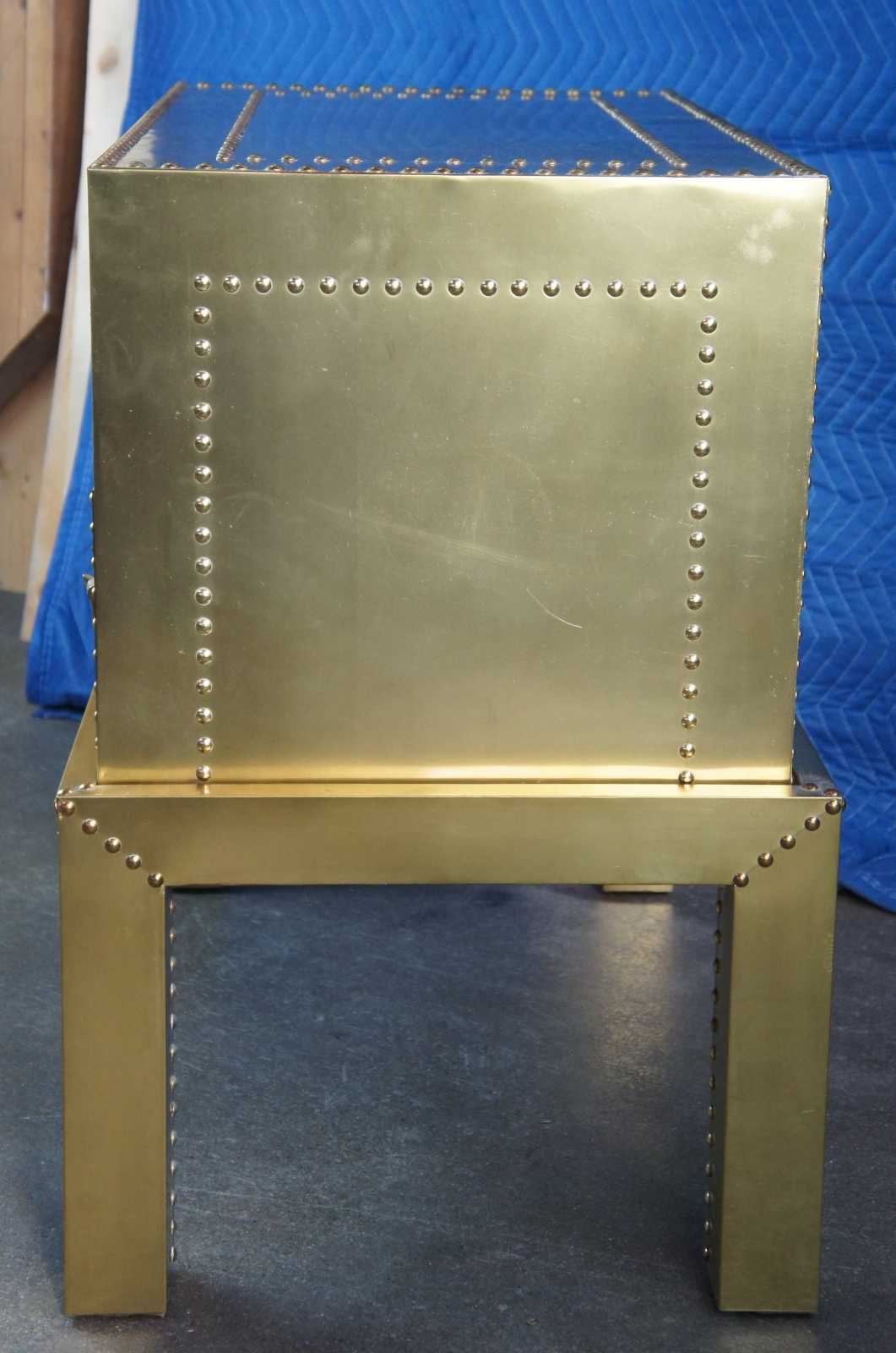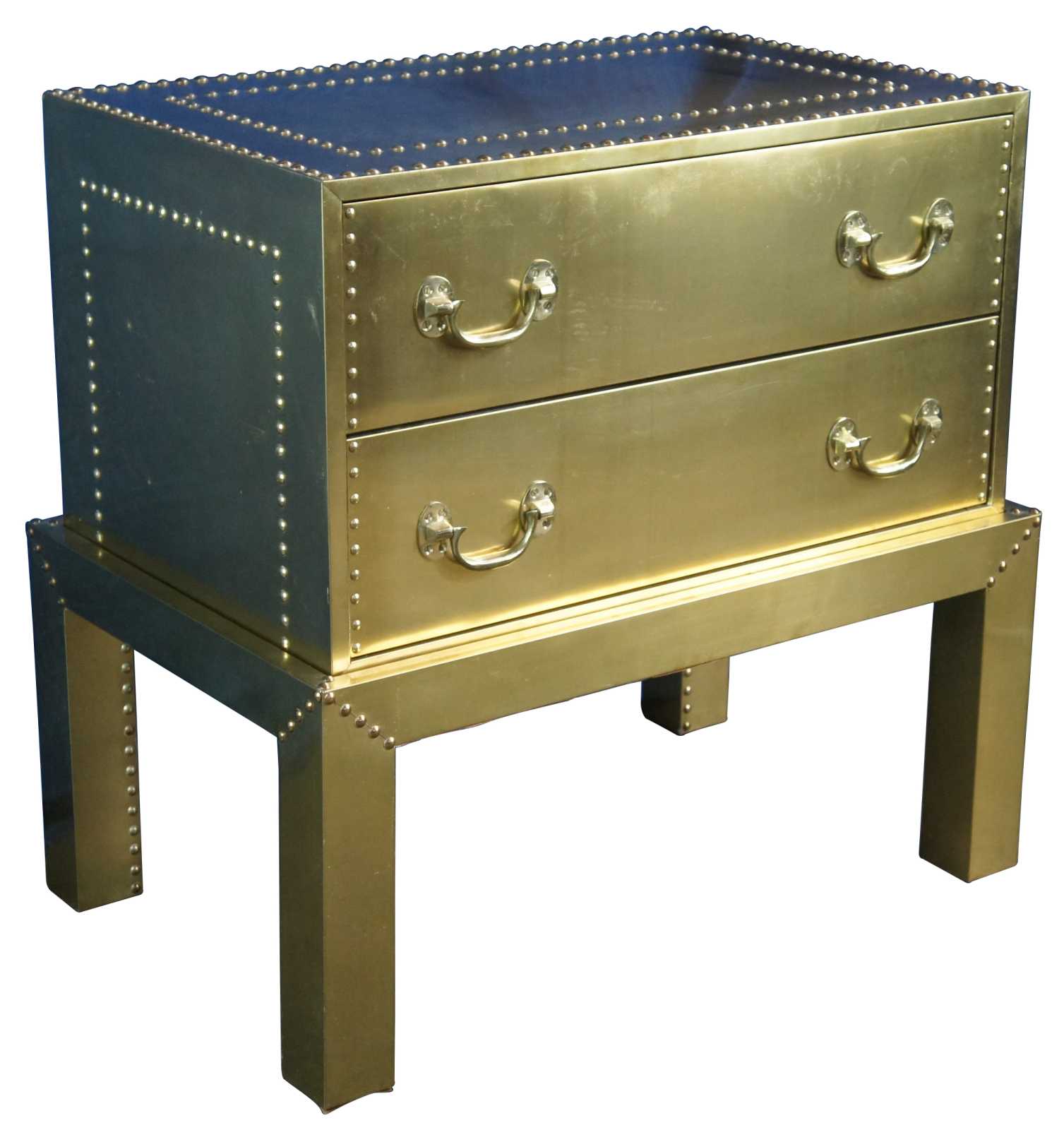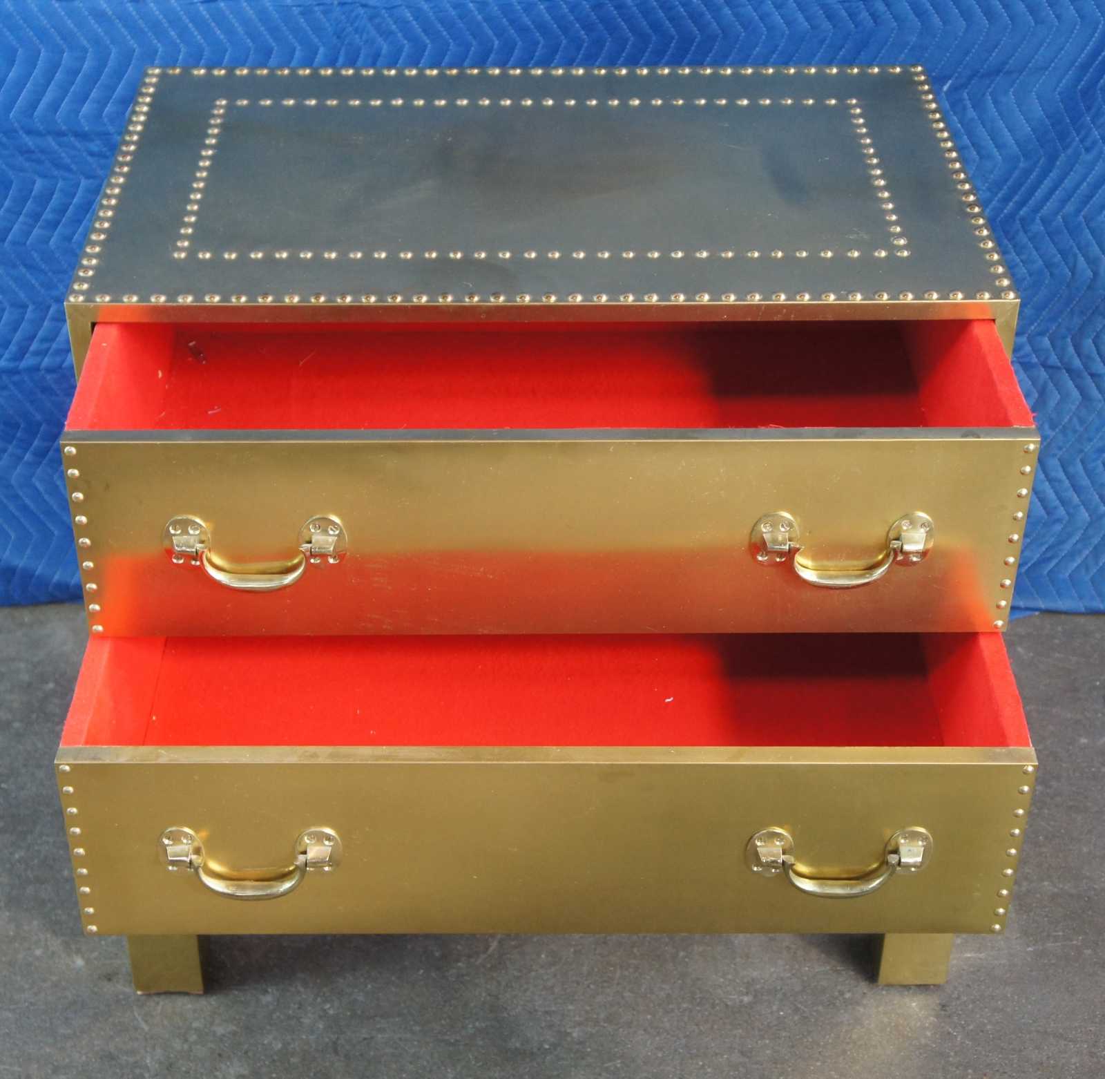Pair of mid century Spanish chests of drawers on stand, nightstands or side tables. Wrapped in brass featuring nailhead trim. Marked Espana, A Decorative Craft, Hand Made in Spain, 3910. Attributed to Sarreid Ltd. circa 1970s
