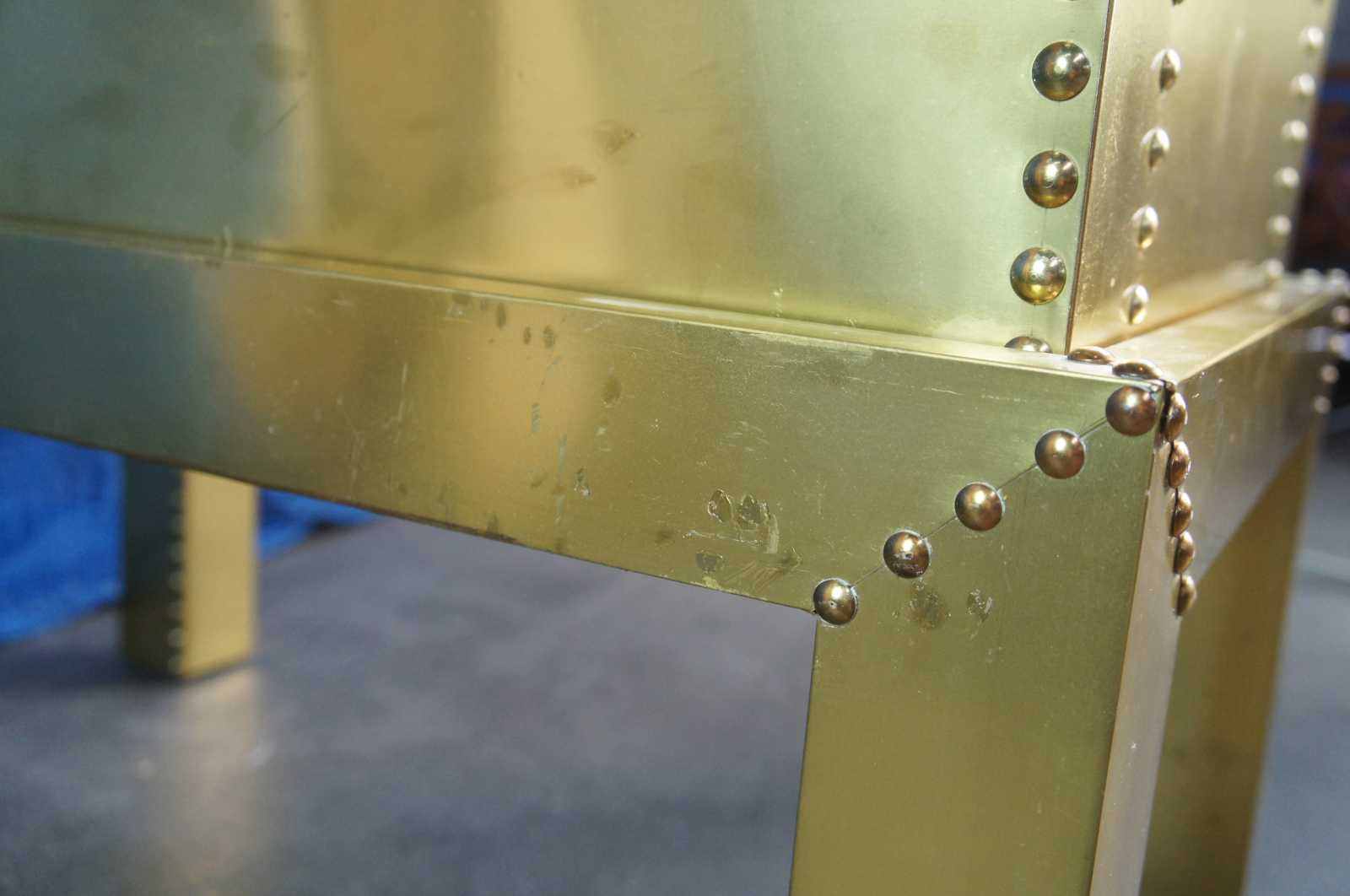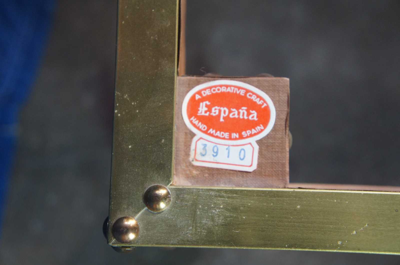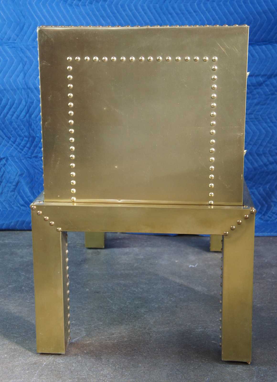 Pair of mid century Spanish chests of drawers on stand, nightstands or side tables. Wrapped in brass featuring nailhead trim. Marked Espana, A Decorative Craft, Hand Made in Spain, 3910. Attributed to Sarreid Ltd. circa 1970s