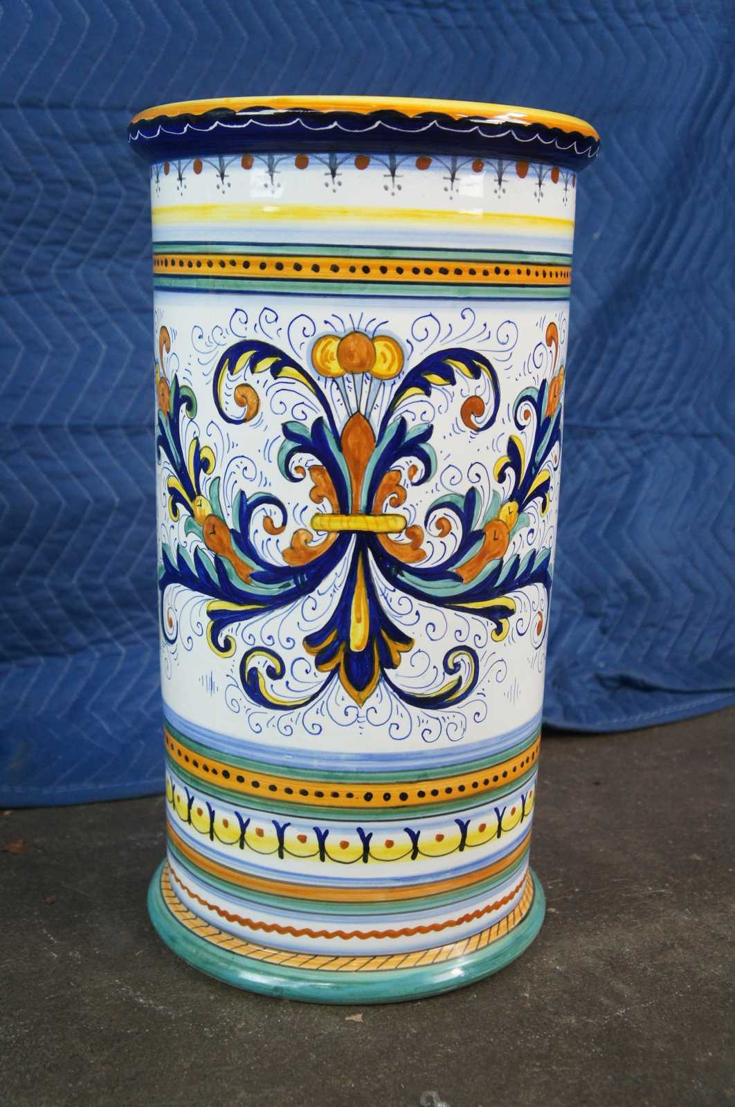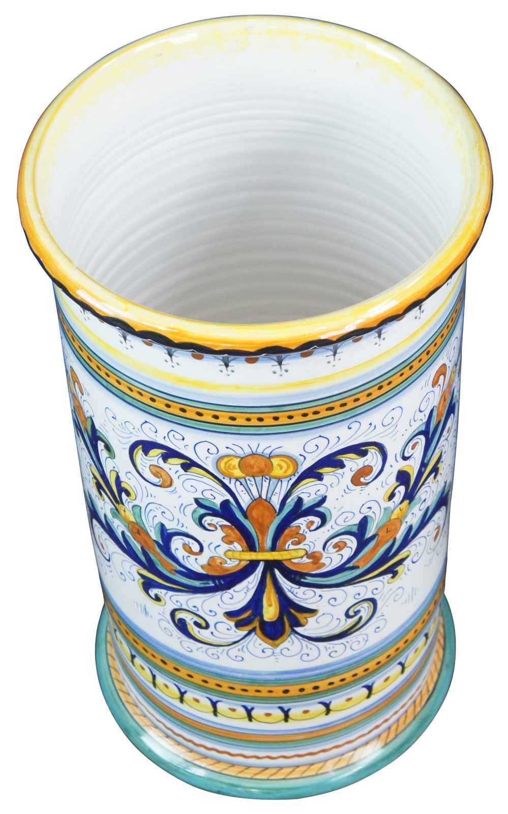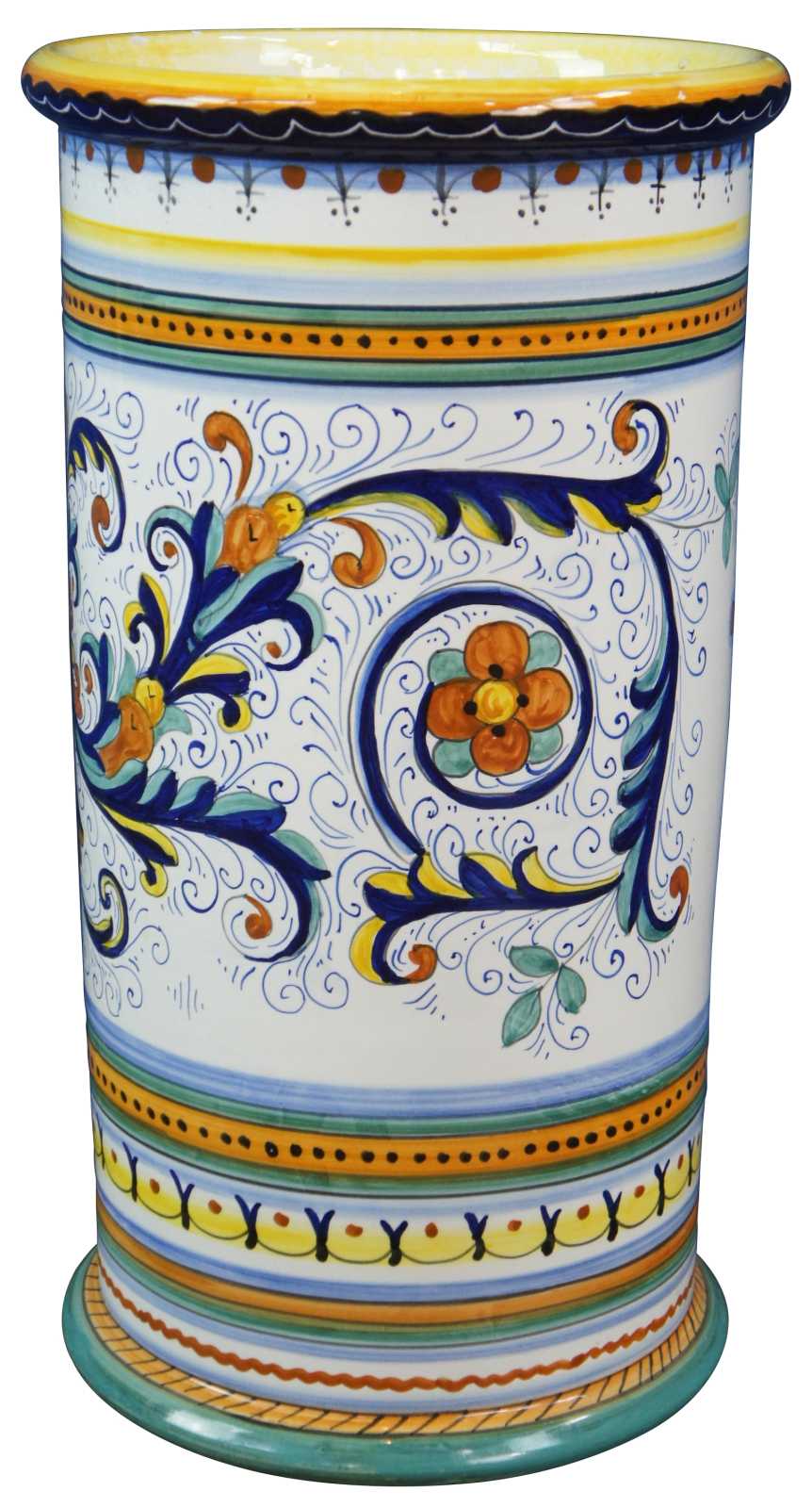 Mid century Italian Deruta Ricco design umbrella or cane stand. The Ricco design is heavily influenced by the frescoes of Renaissance artist Pietro Perugino, the mentor of Raphael. Pietro Perugino, born Pietro Vannucci, was an Italian Renaissance painter of the Umbrian school, who developed some of the qualities that found classic expression in the High Renaissance. Raphael was his most famous pupil. Raffaello Sanzio da Urbino, known as Raphael, was an Italian painter and architect of the High Renaissance. His work is admired for its clarity of form, ease of composition, and visual achievement of the Neoplatonic ideal of human grandeur. Marked inside fatto a mano (hand made) Deruta .