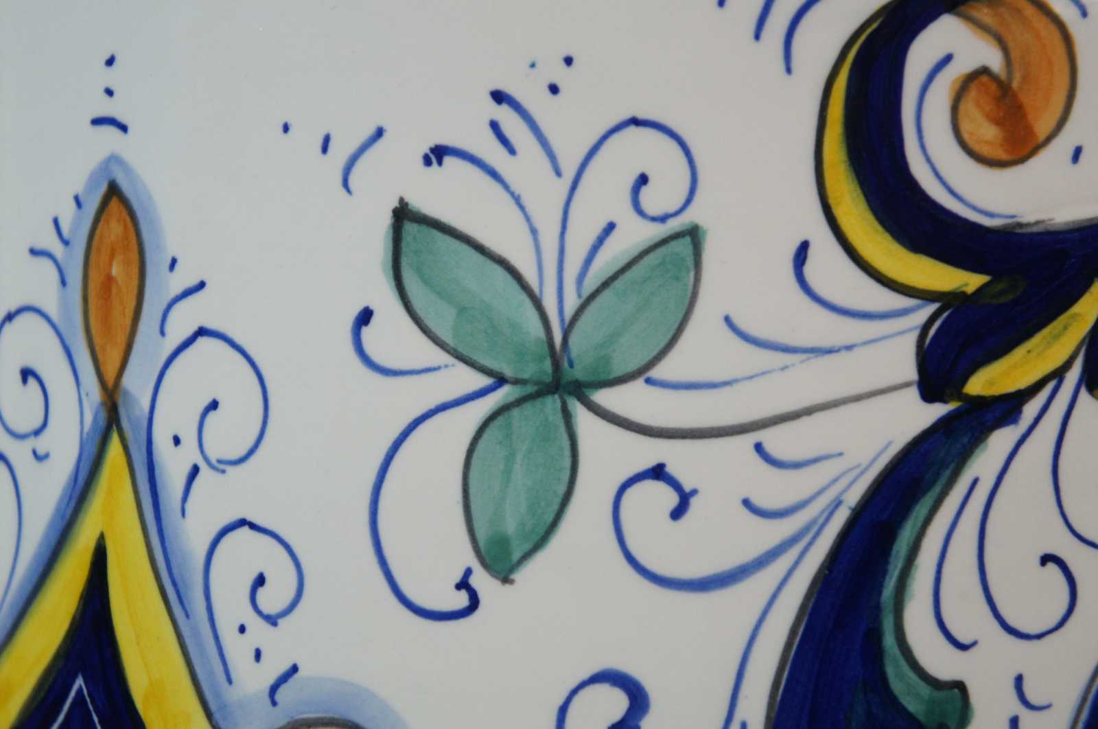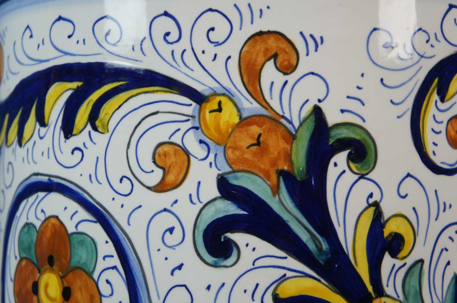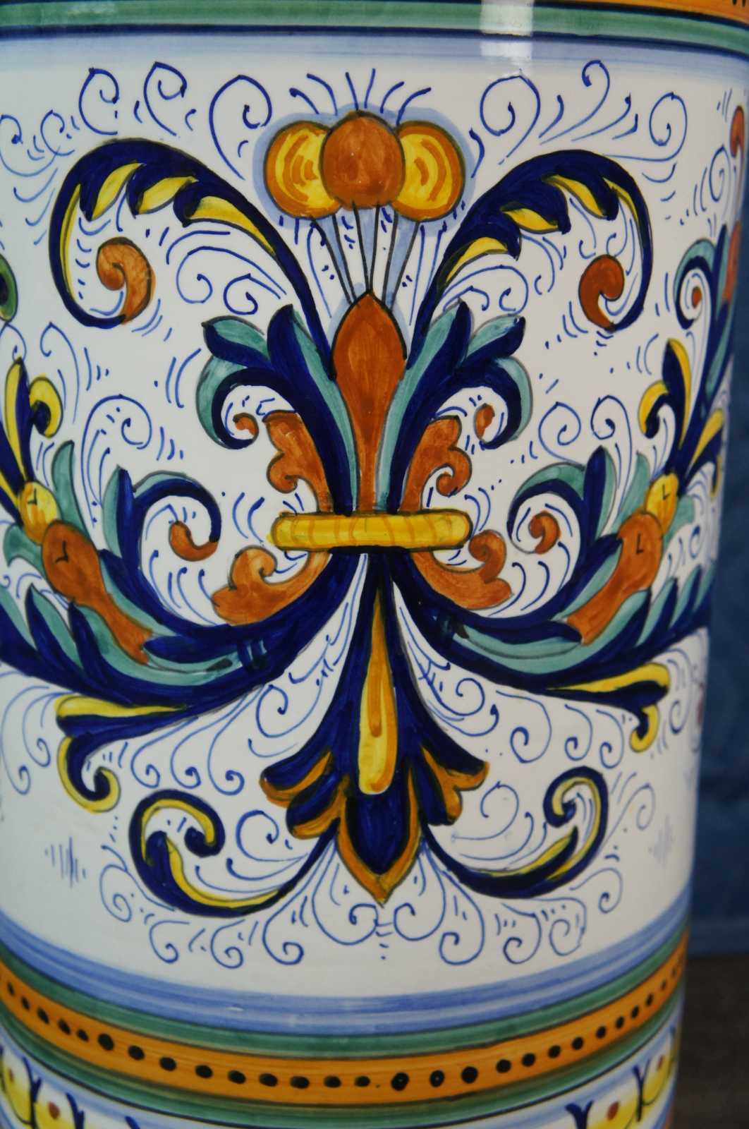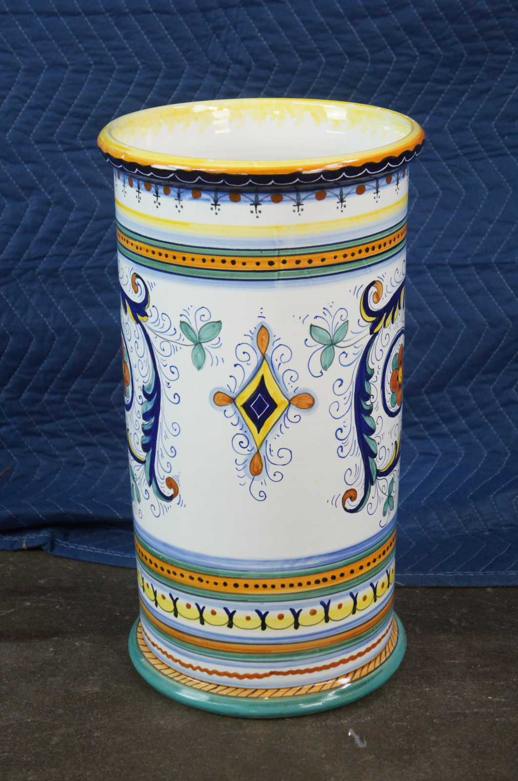 Mid century Italian Deruta Ricco design umbrella or cane stand. The Ricco design is heavily influenced by the frescoes of Renaissance artist Pietro Perugino, the mentor of Raphael. Pietro Perugino, born Pietro Vannucci, was an Italian Renaissance painter of the Umbrian school, who developed some of the qualities that found classic expression in the High Renaissance. Raphael was his most famous pupil. Raffaello Sanzio da Urbino, known as Raphael, was an Italian painter and architect of the High Renaissance. His work is admired for its clarity of form, ease of composition, and visual achievement of the Neoplatonic ideal of human grandeur. Marked inside fatto a mano (hand made) Deruta .