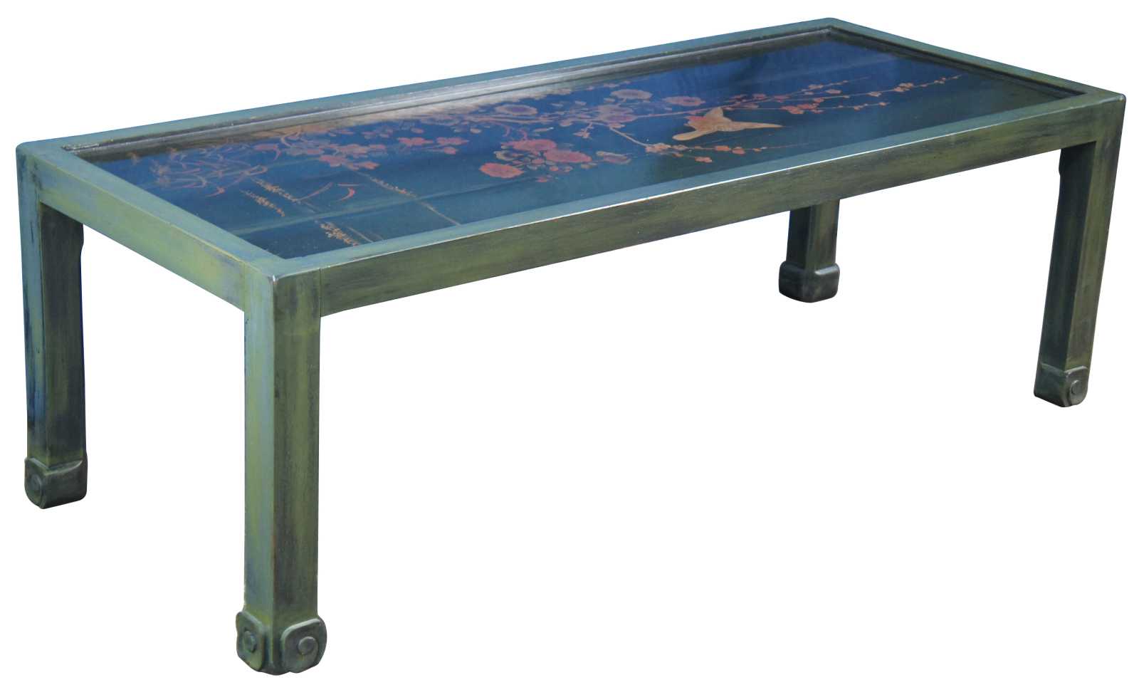 Antique Chinese Chinoiserie panel coffee or cocktail table featuring a glass top and lacquered panel with gilded flowers and bird. The antique panel is mounted within a mid 20th century base. Marked Property of Jay Schottenstein on base.
