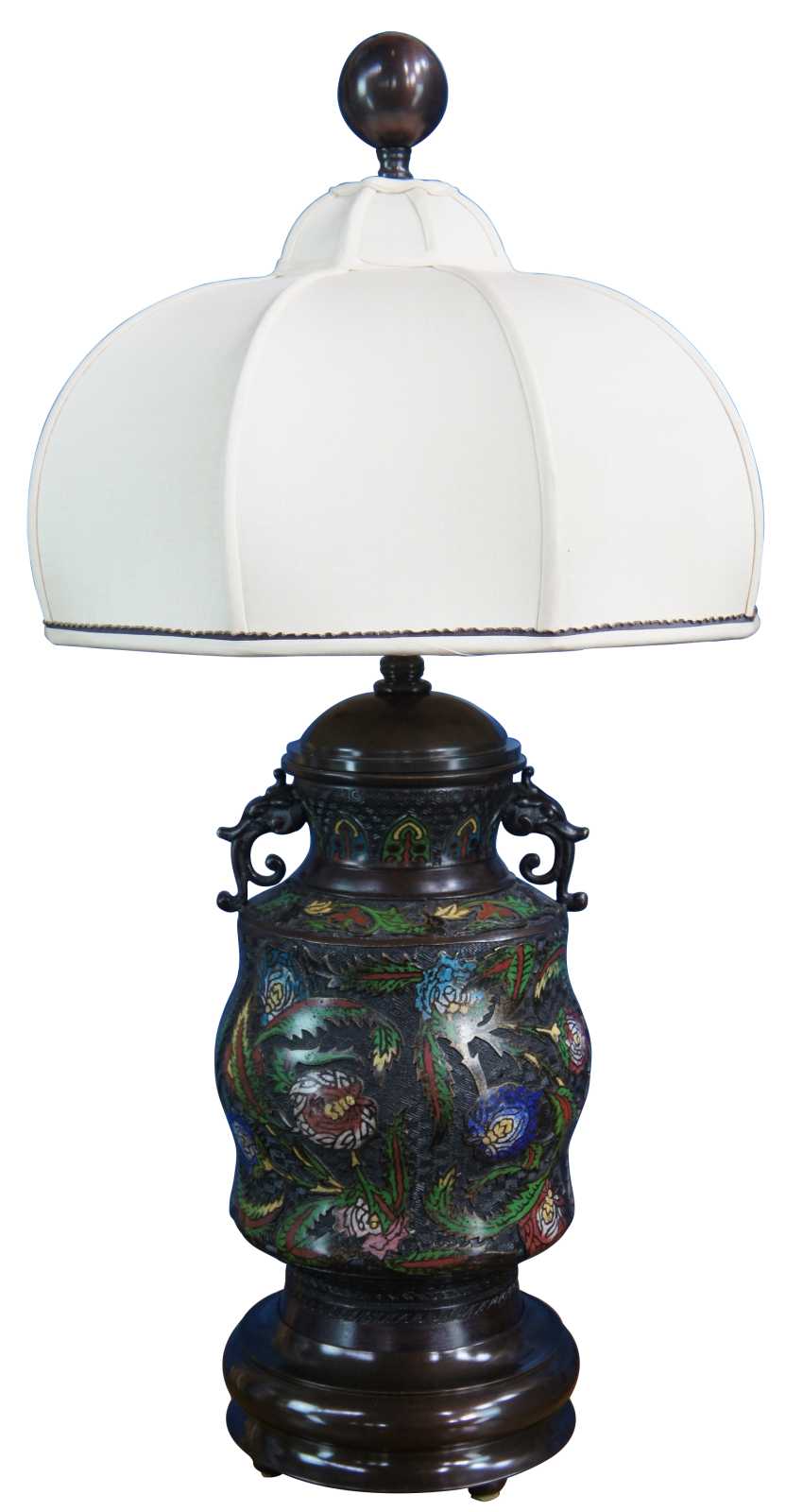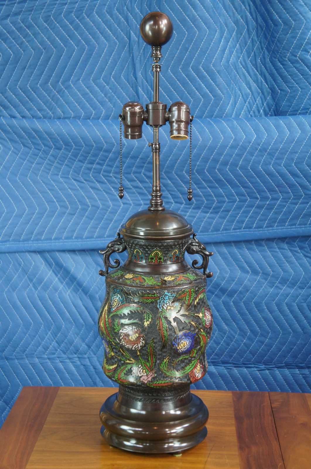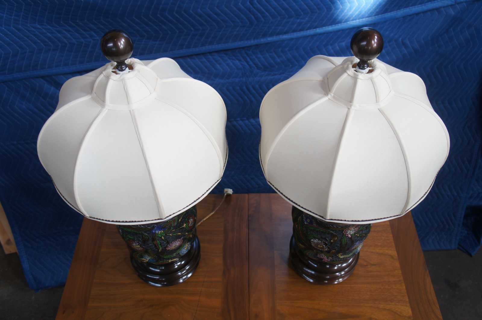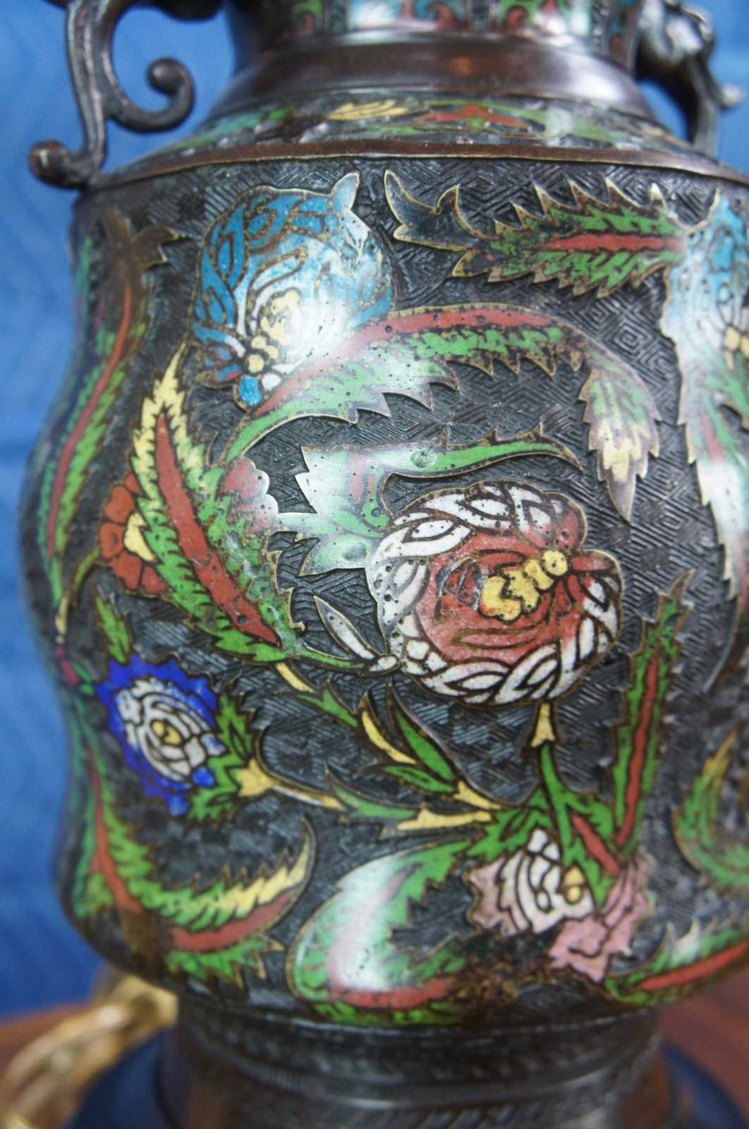 Two monumental antique bronze Champleve enameled Cloisonne urn lamps featuring a floral motif with elephant shaped handles along the mouth. Made of very bronze featuring Champleve enamel, a technique whereby depressions that are incised, carved or die struck on the surface are filled with opaque enamel and then fired until the enamel is fused with the bronze. The word champlevé is a compound French word (champ + levé) meaning “field raised” or more precisely, raised field.