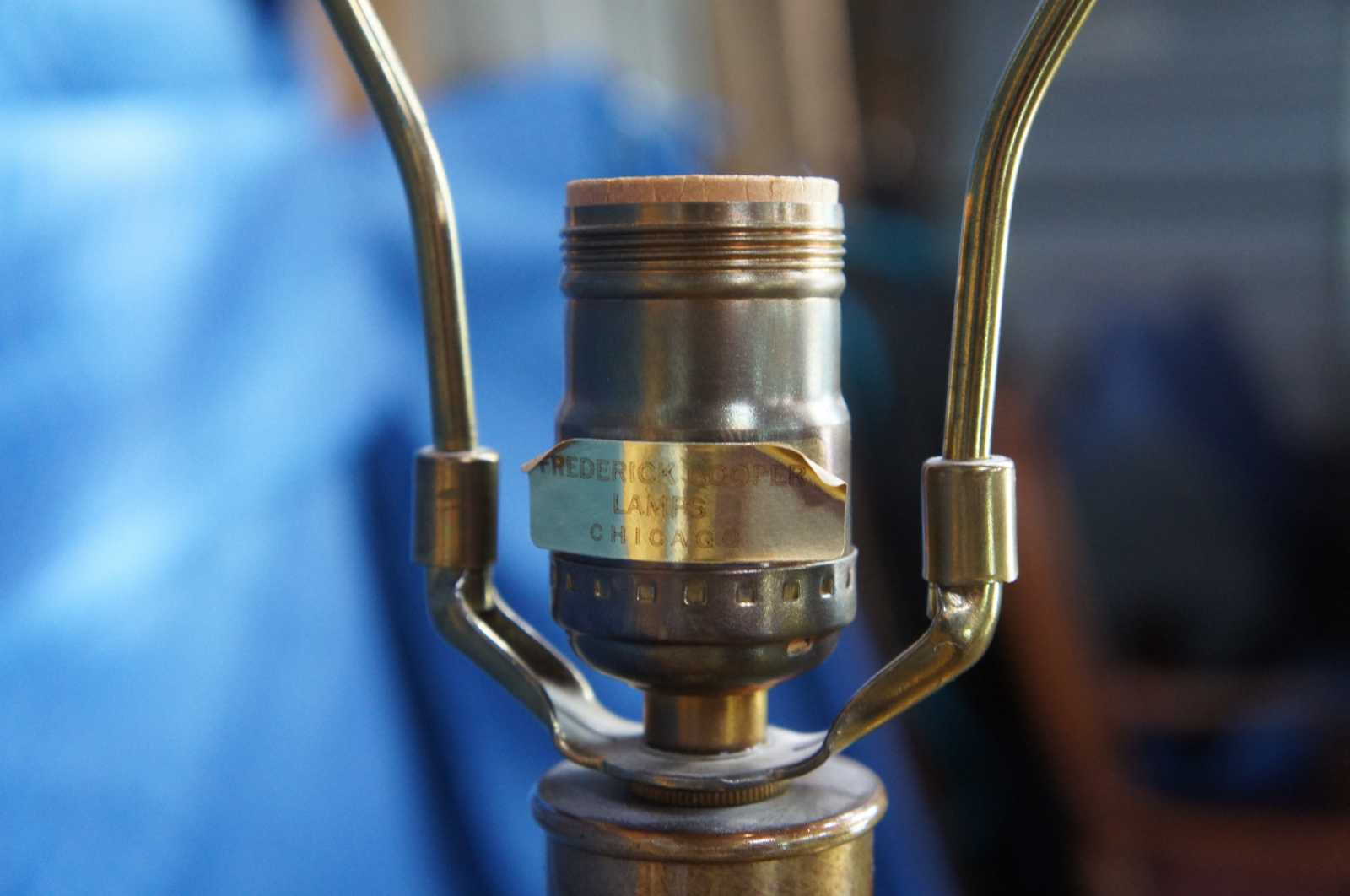 Two mid century Frederick Cooper lamps. Made of brass and wood featuring a turned baluster trophy shaped design with ring handles.