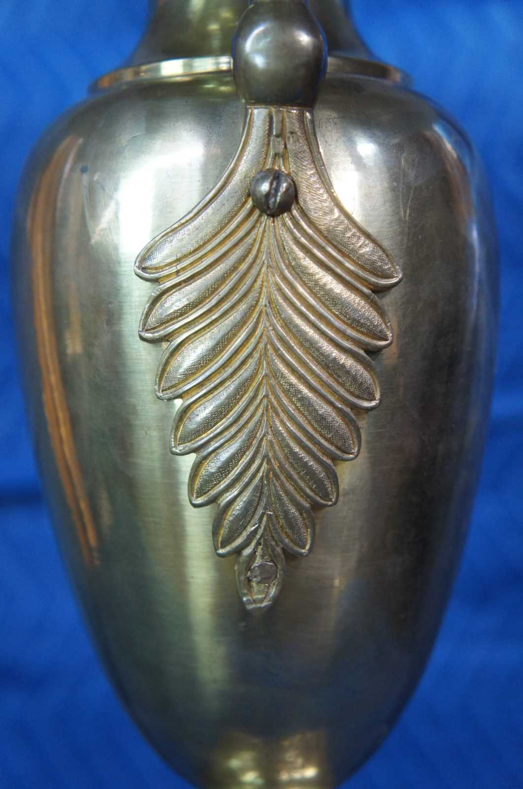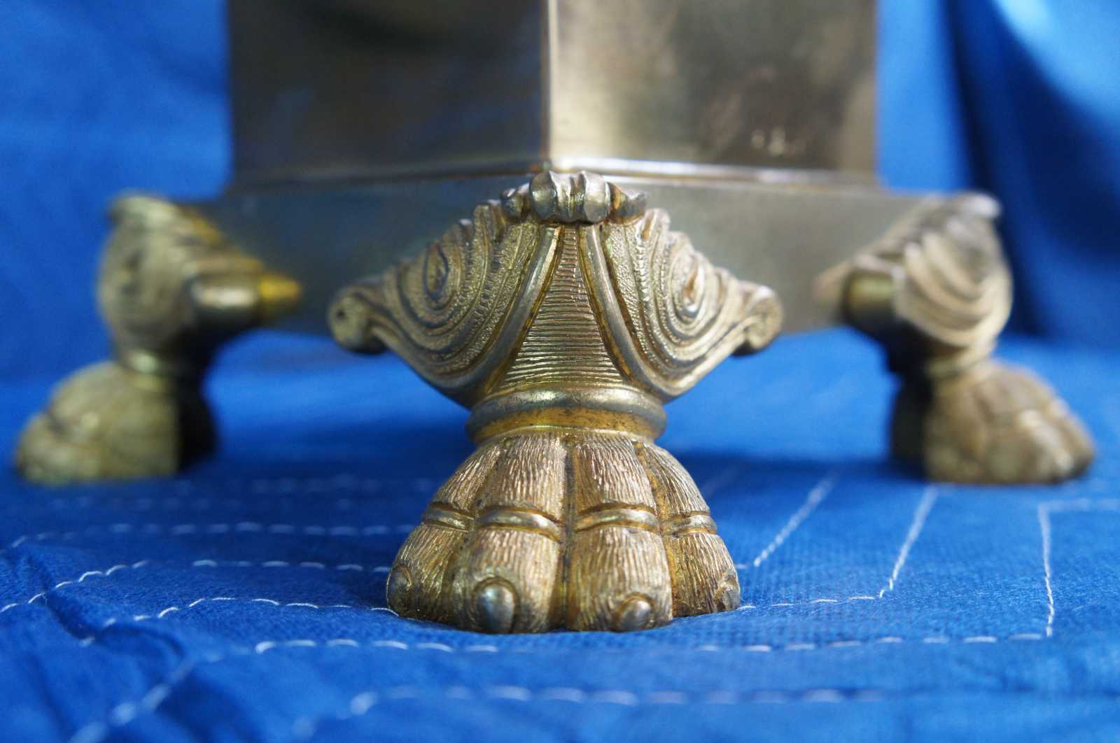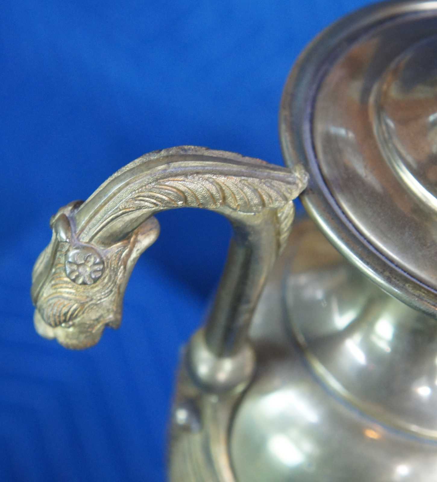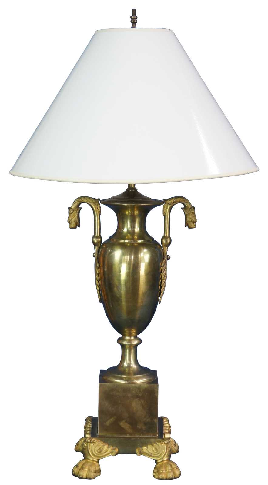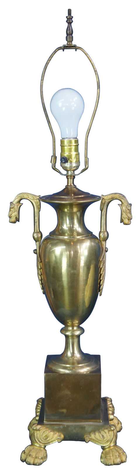 Two mid century figural brass cassolette lamps featuring trophy urn shape with paw feet and acanthus accented lion / griffin / serpent or dragon handles.
