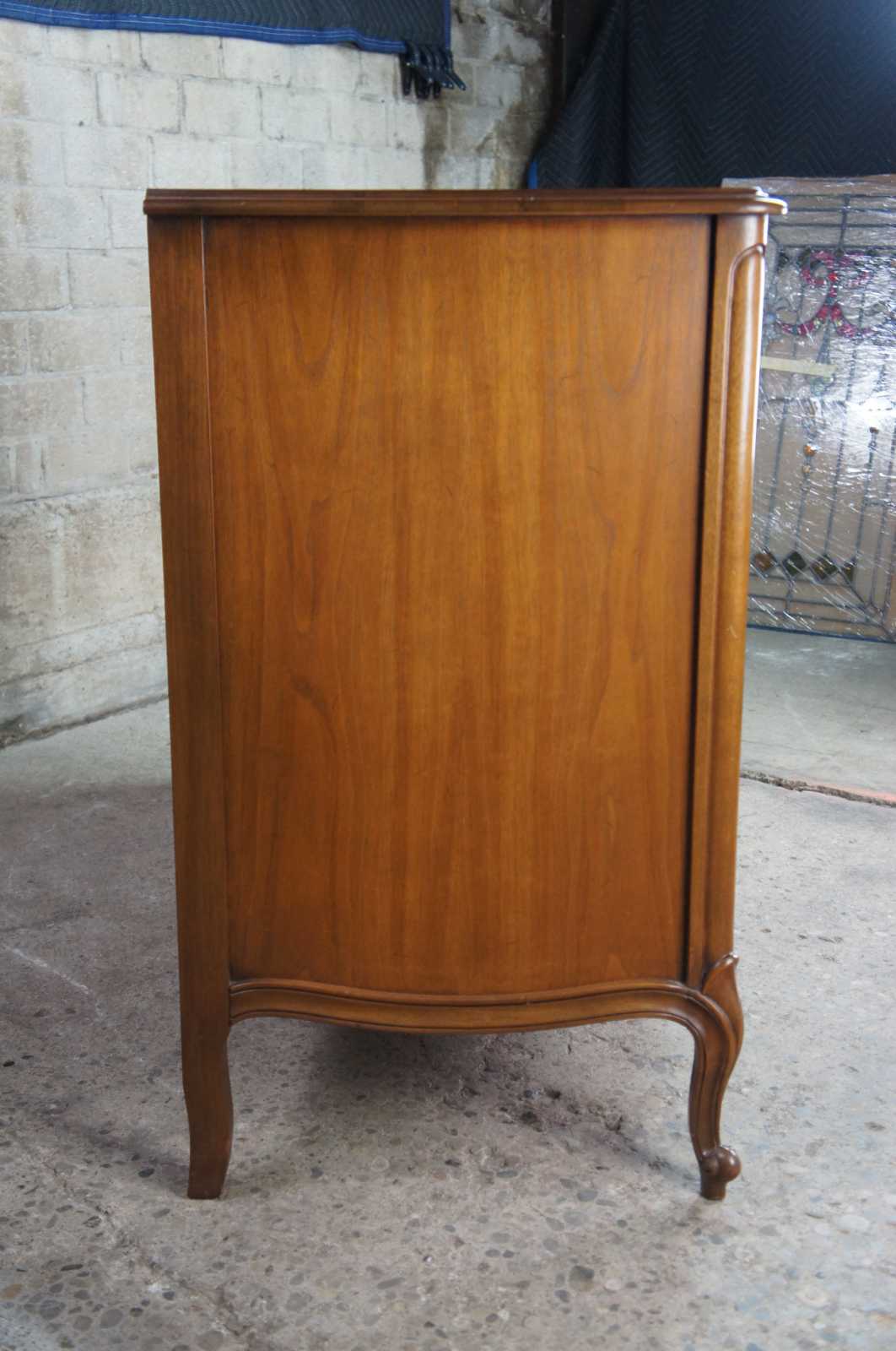 An exquisite oxbow chest or desser with mirror by Drexel Furniture, circa 1965. Features a serpentine form with six drawers and hidden compartment. The dresser is supported by cabriole legs with scrolled feet. 206-120.