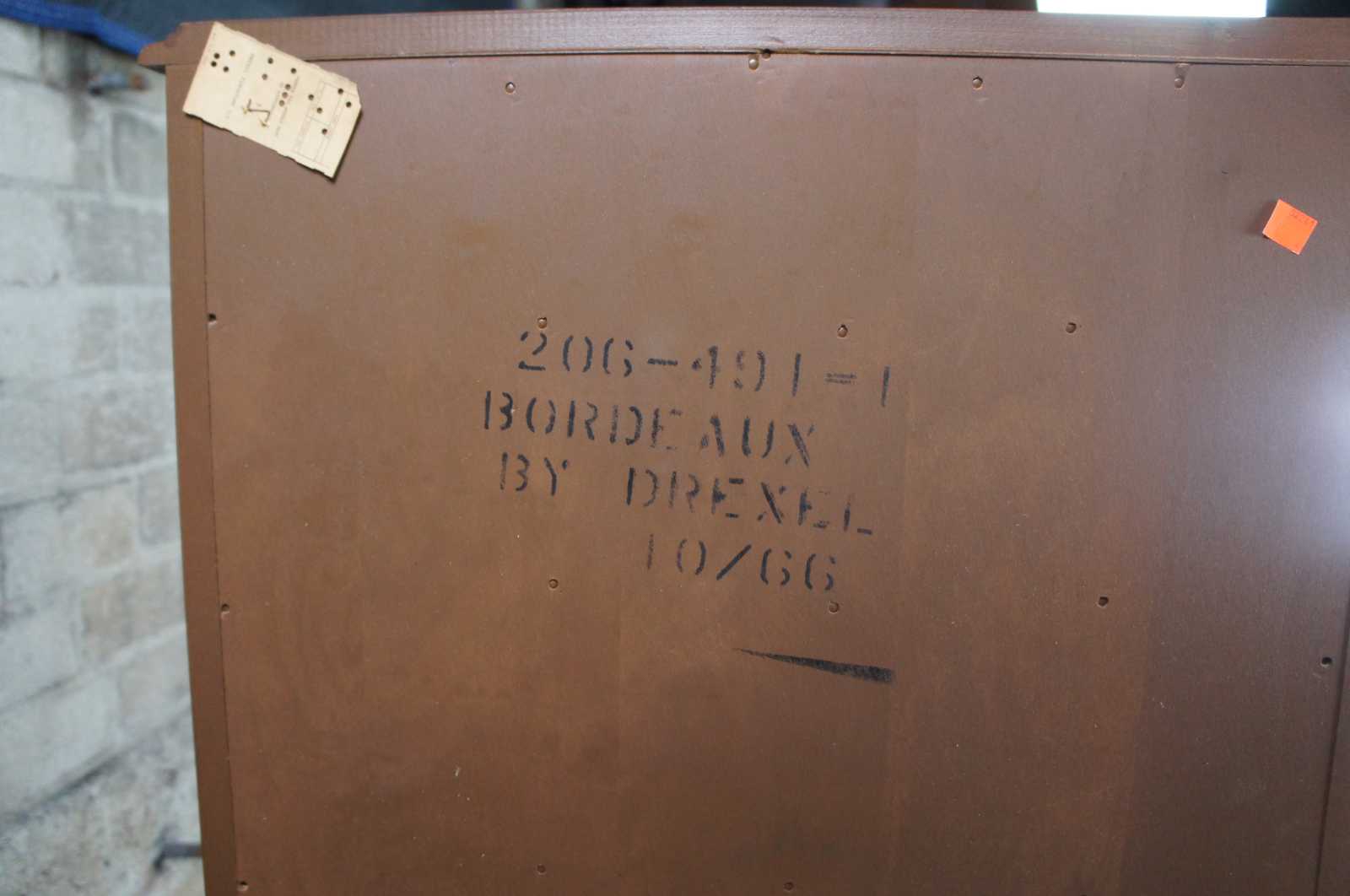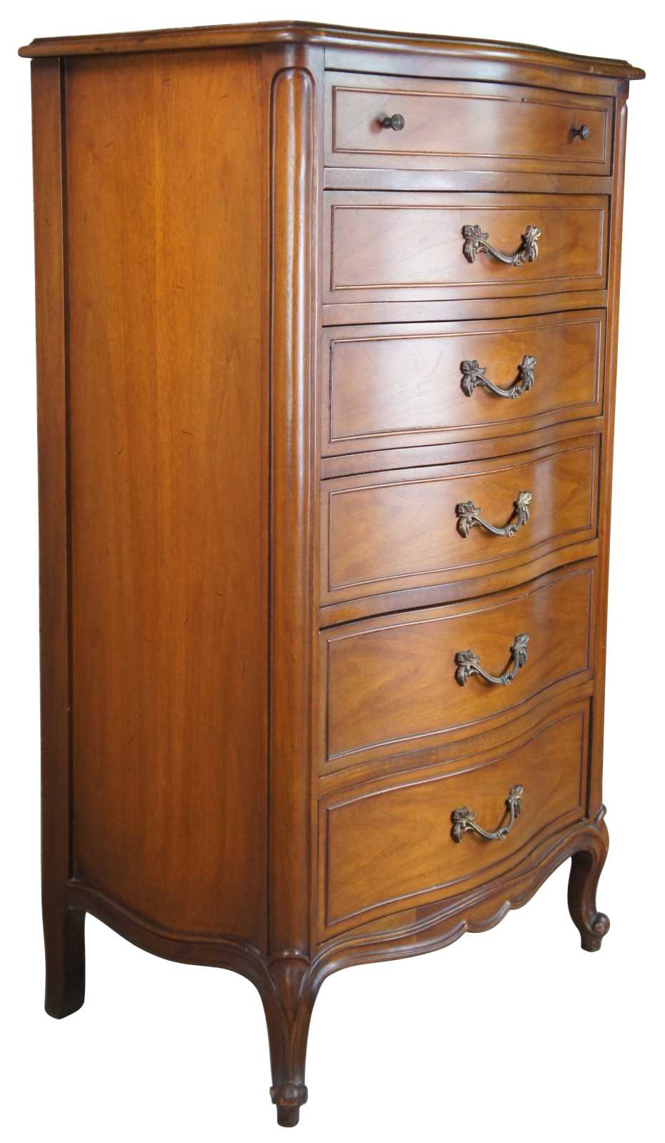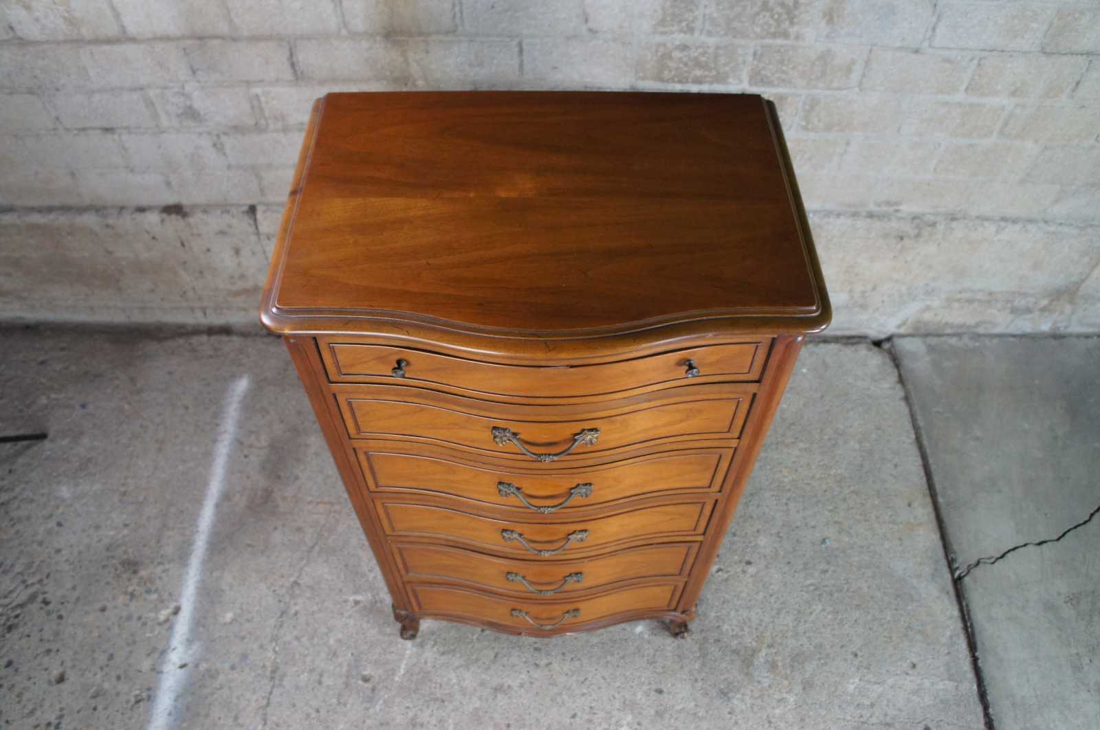 1966 Mid century Drexel Bordeaux French Provincial semanier chest or dresser. Made from walnut with a serpentine form, six drawers and cabriole legs with scrolled feet. 206-491.